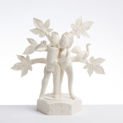 Recalling traditional Staffordshire mantelpiece ornaments crafted from casts of discarded domestic ephemera, Creamware, press-moulded, individually animated elements bonded at leather hard stage. Traditional Staffordshire glazes.