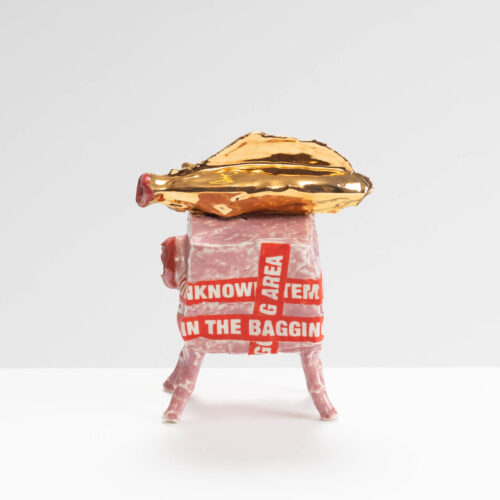 Schneider employs a broad palette of ceramic techniques to create collage-like works, emphasizing surface decoration through slip transfers and gold lustre accents. These are often juxtaposed with resin, steel constructions, glass, or found objects, reinforcing a sense of contrast and material tension.