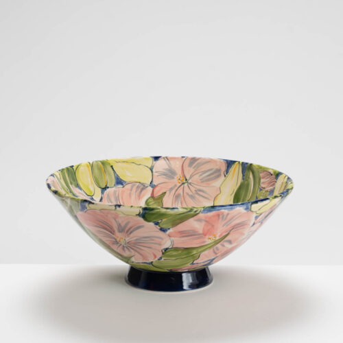 Valerie paints onto the fired ceramic with underglaze colours; sometimes designs are loosely sketched in first and each piece is a unique painting. Colours are freely mixed to produce the desired shade and often applied with two colours on the brush, a technique that gives depth and interest to the work.