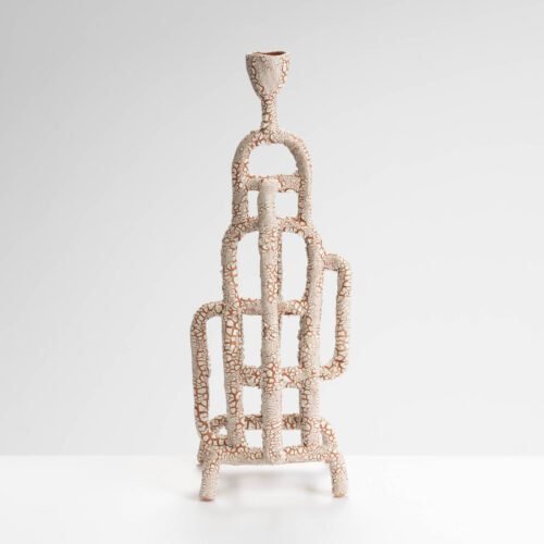 Working primarily as a hand-builder, Sue assembles tubes of porcelain or terracotta paper clay into elaborate, tangled structures that evoke the complex and fragile pathways shared by body and nature. Her distinctive candelabra blur the boundaries between sculpture and function, and are characterised by organic, interwoven forms and richly textured glazes.