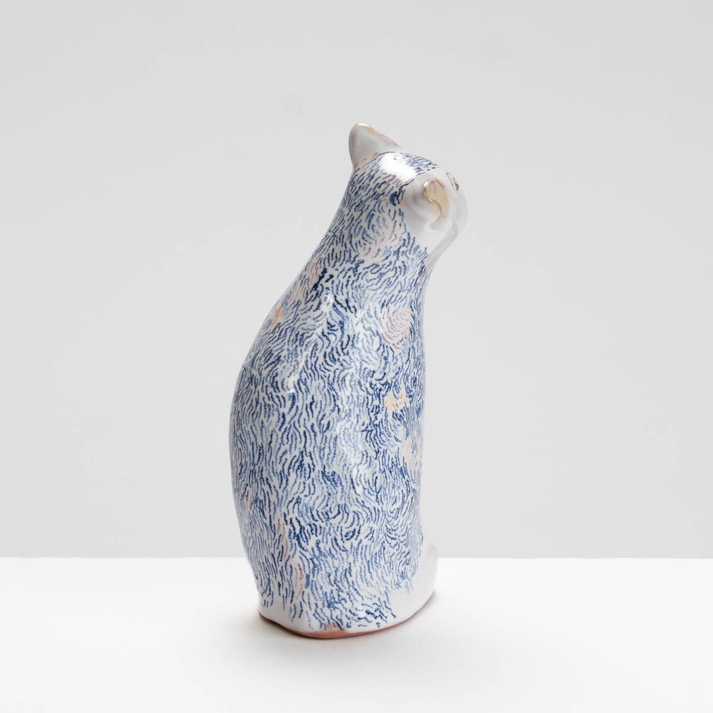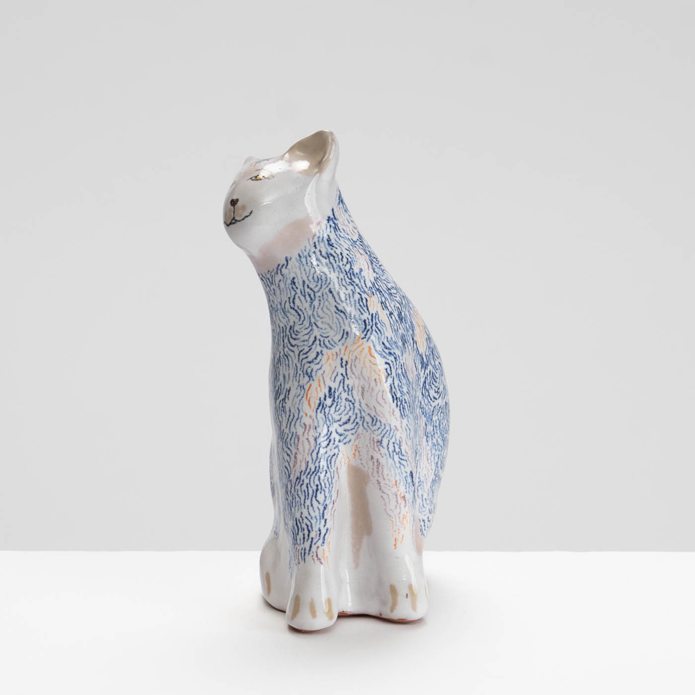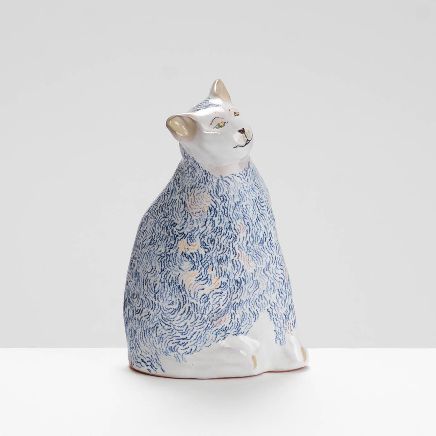 This earthenware sculpture is handbuilt and decorated in the maiolica style. Her work is inspired by paintings, observations in museums, churches, galleries, and directly from life. Subjects are animated through soft forms and colour palettes.