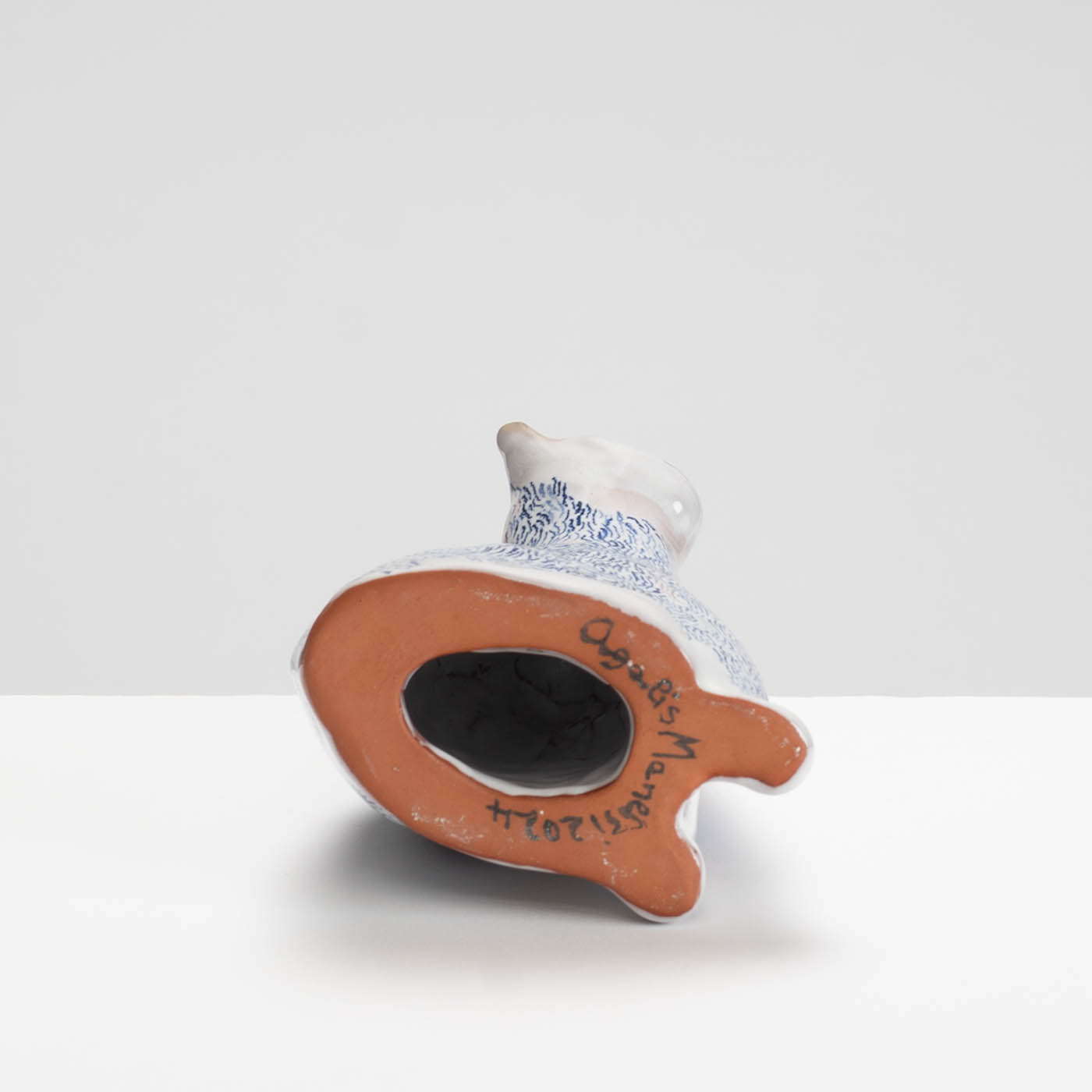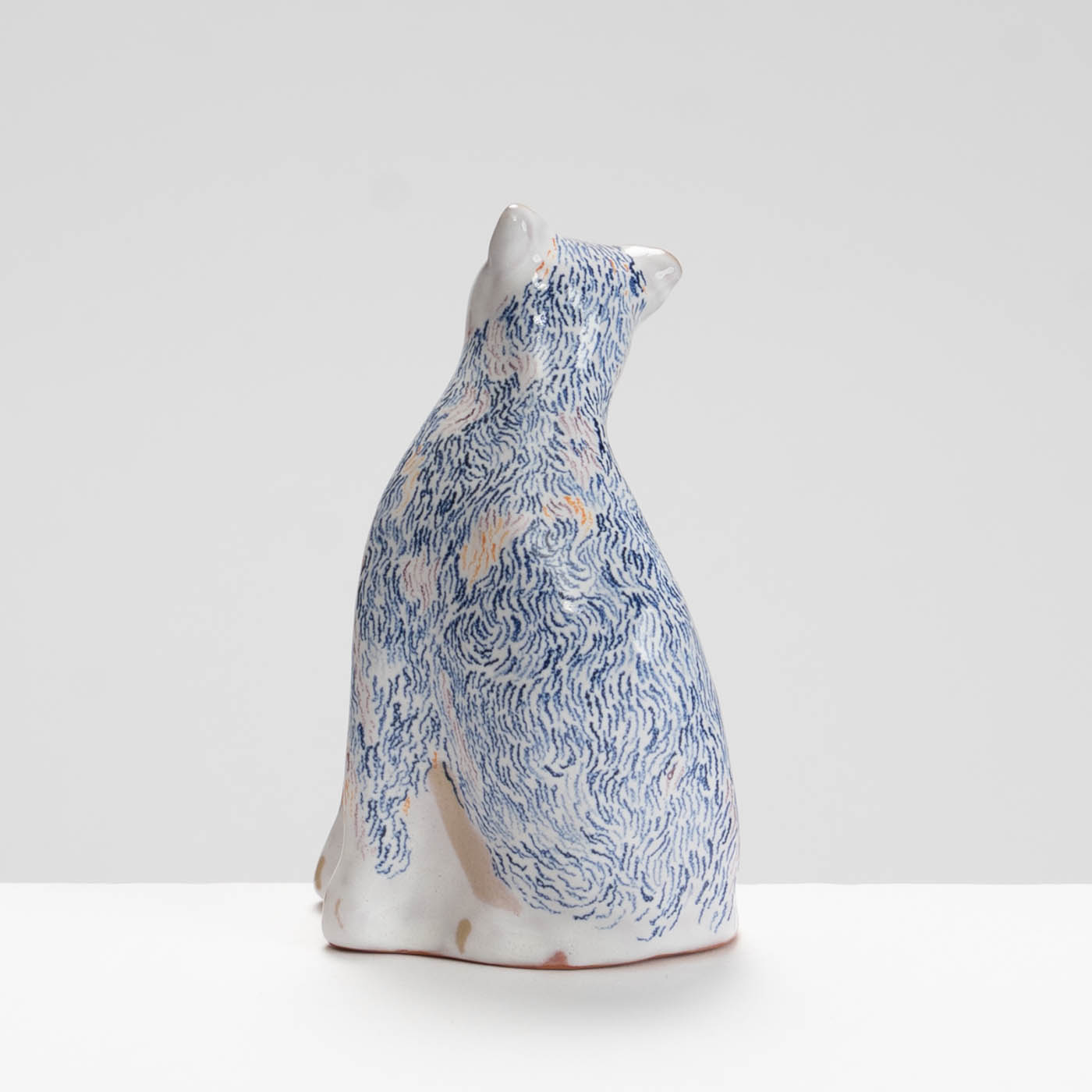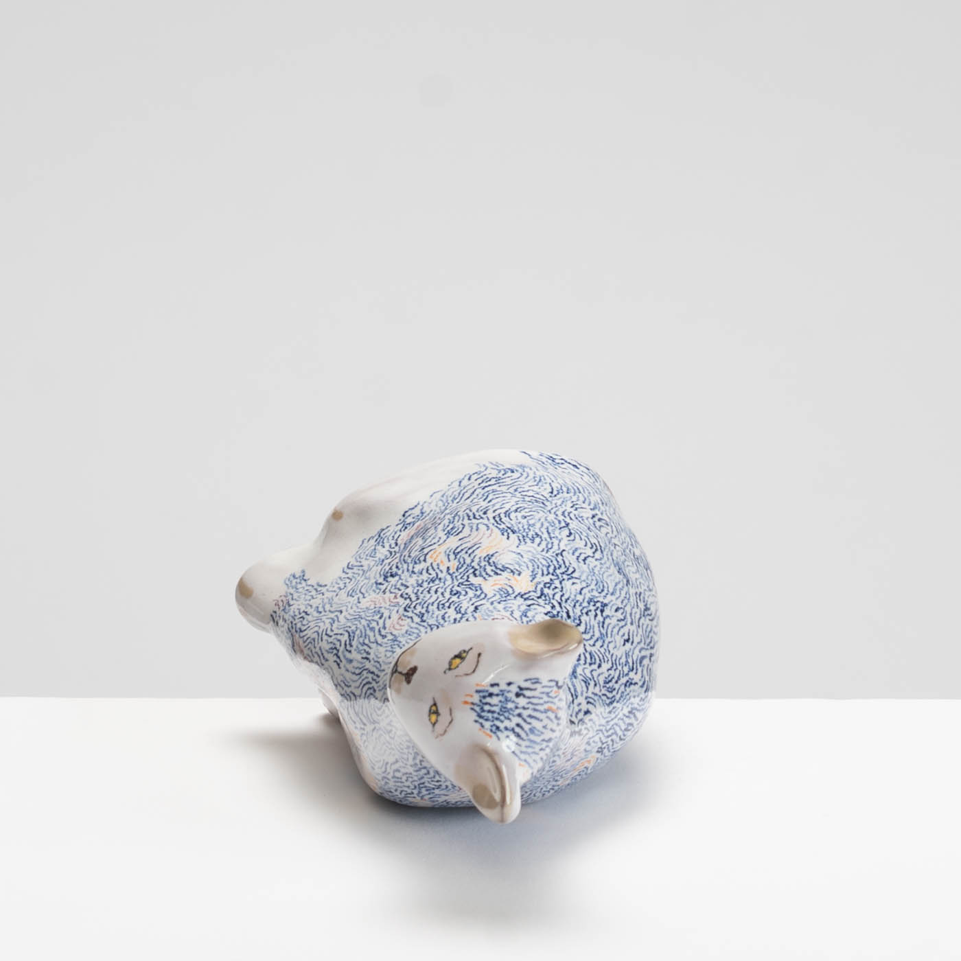 This earthenware sculpture is handbuilt and decorated in the maiolica style. Her work is inspired by paintings, observations in museums, churches, galleries, and directly from life. Subjects are animated through soft forms and colour palettes.