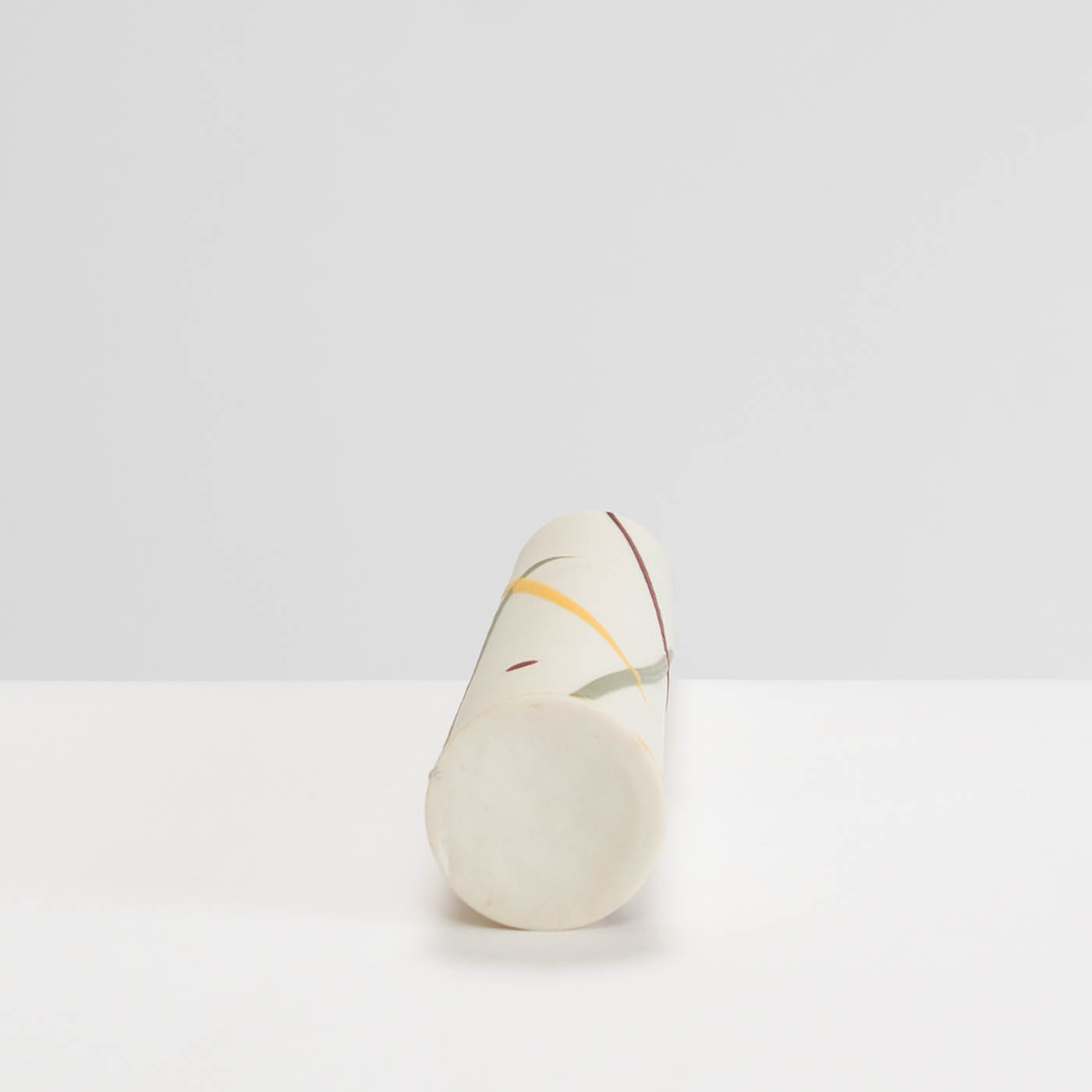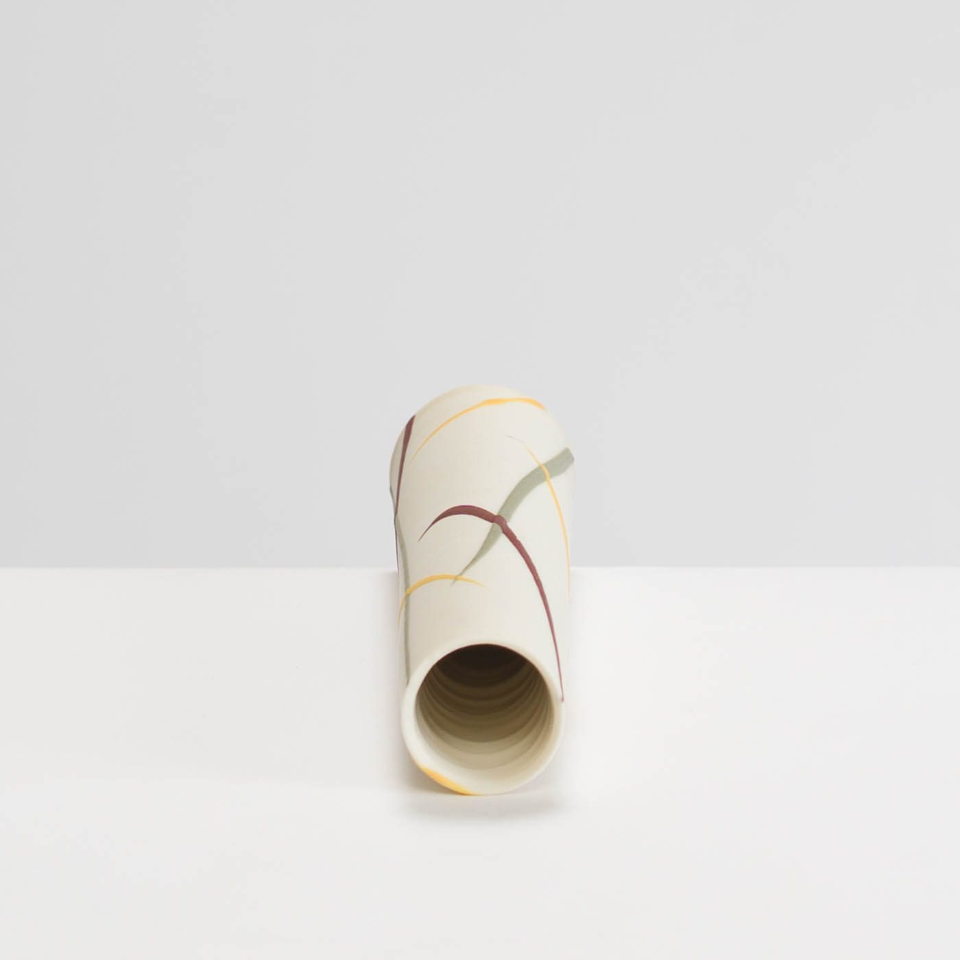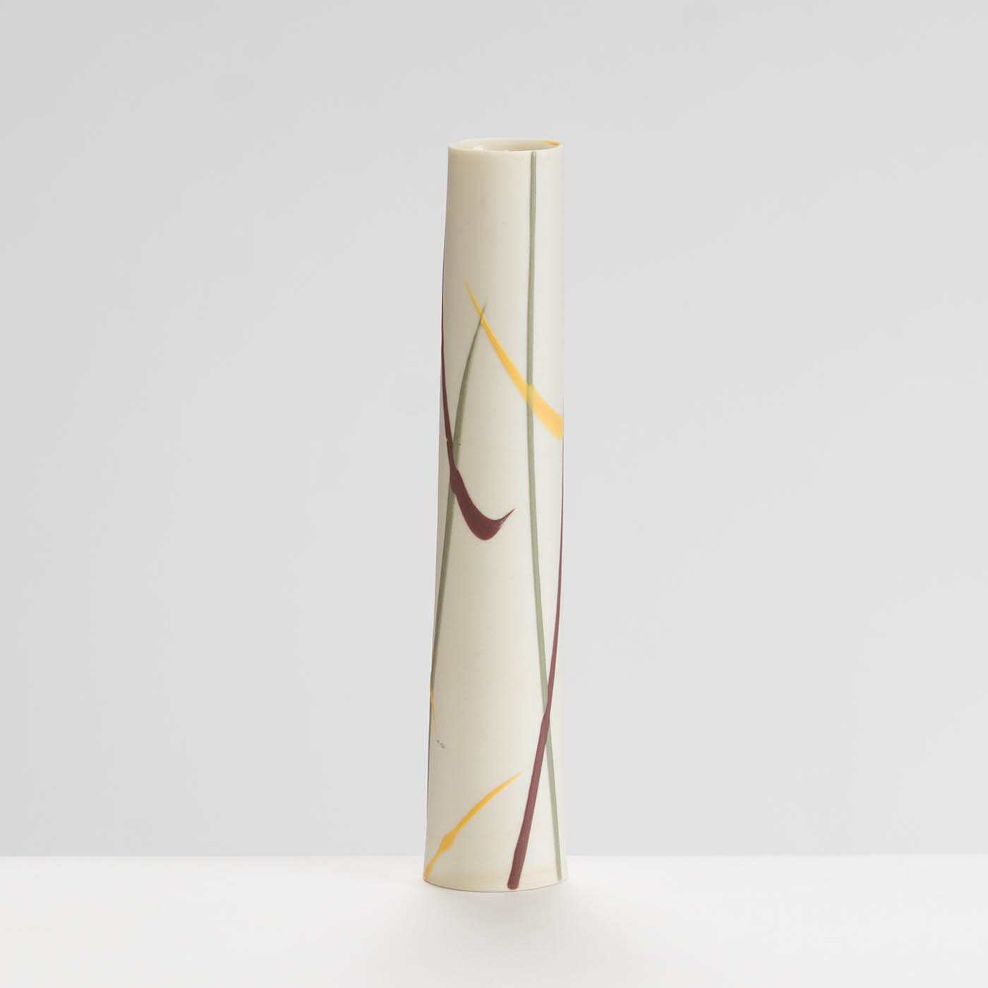 This vase is wheel-thrown in porcelain. The surface design is achieved through the spontaneous use of a bold palette of stains, oxides and sgraffito.
