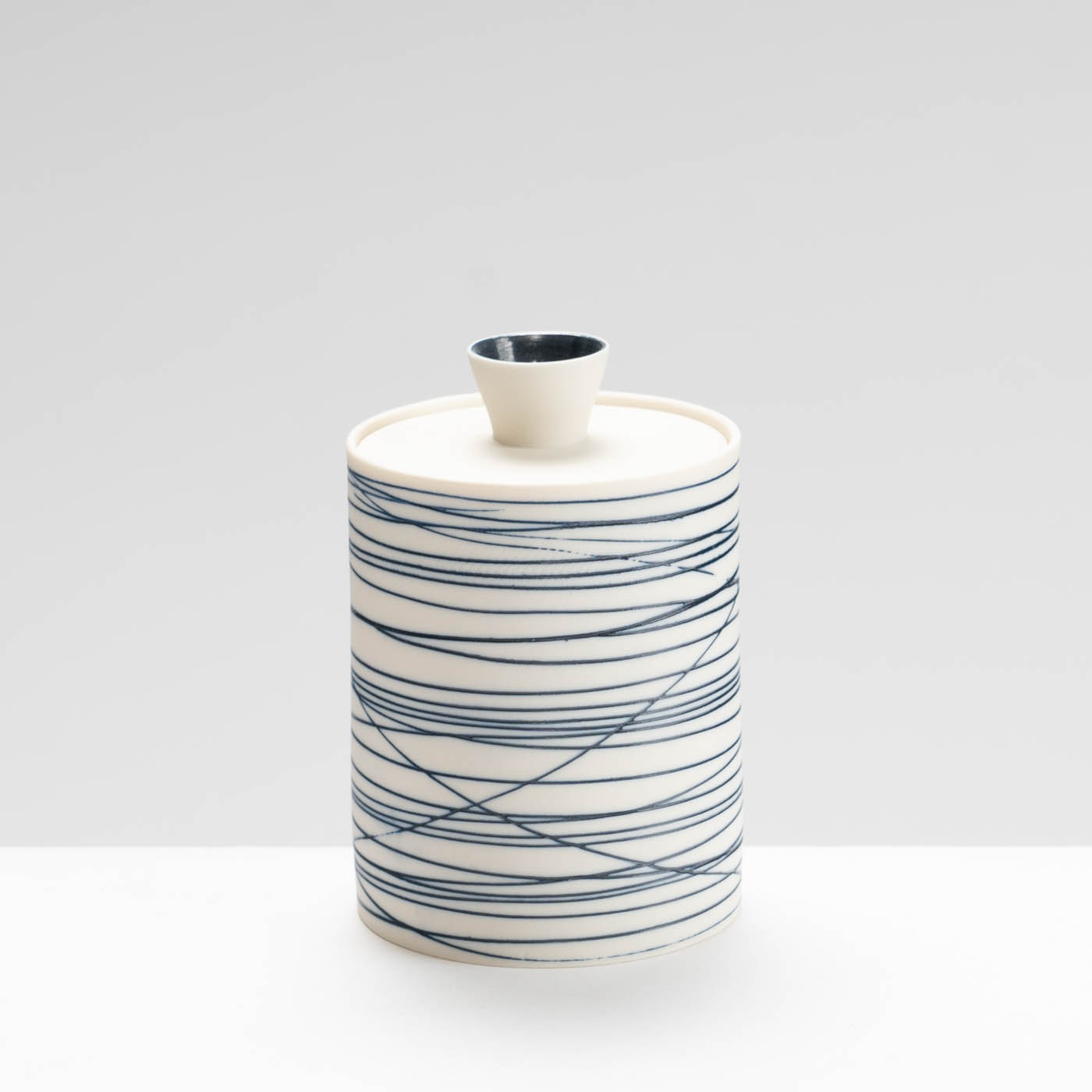 This lidded pot is wheel-thrown in porcelain. The surface design is achieved through inlaid lines of coloured slip.