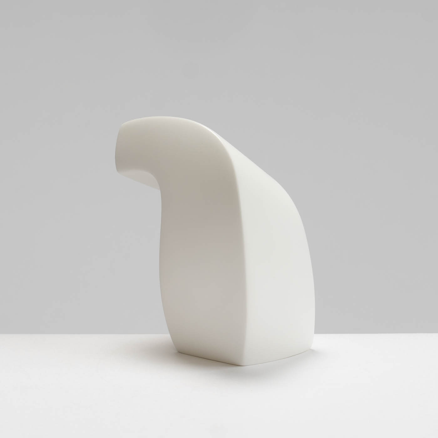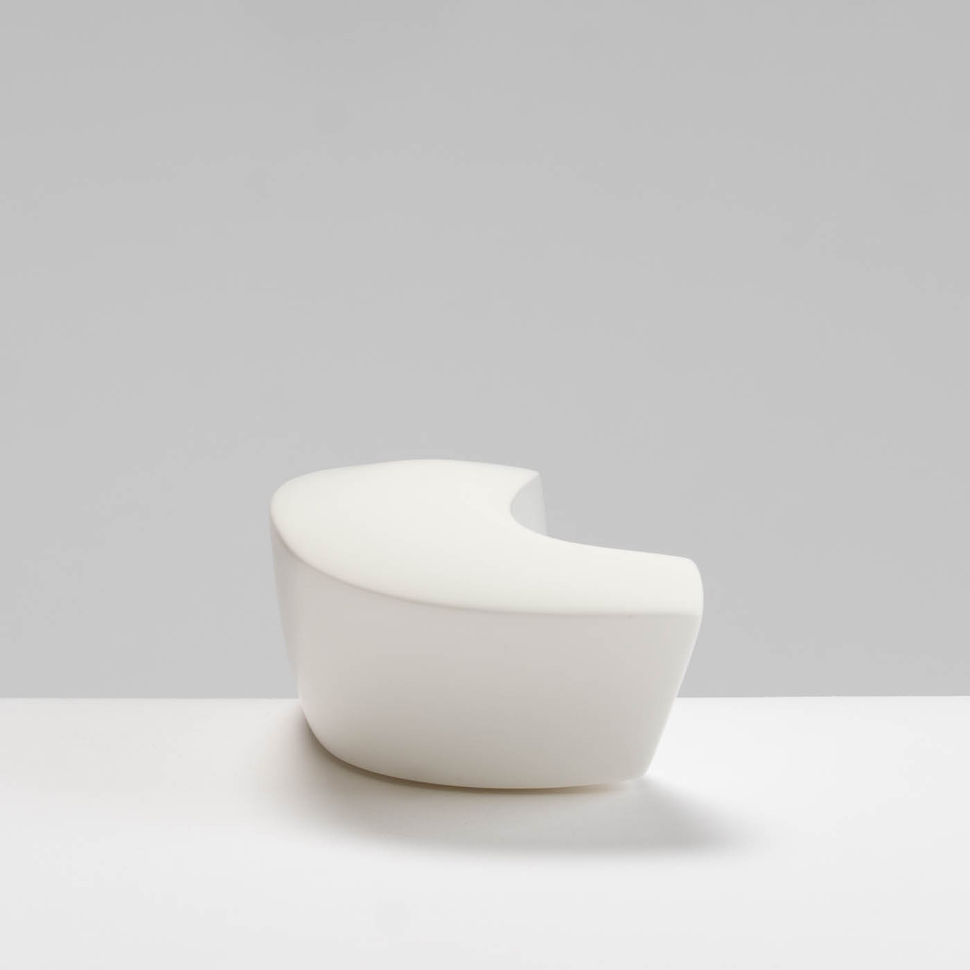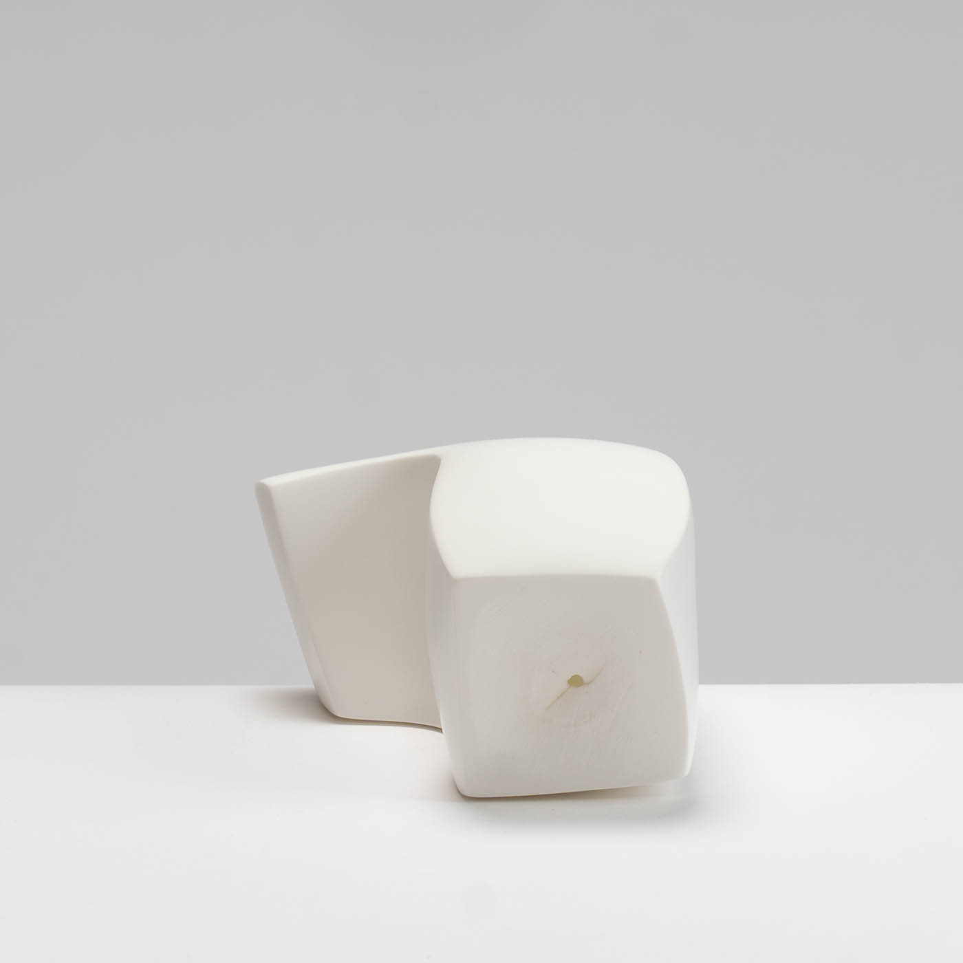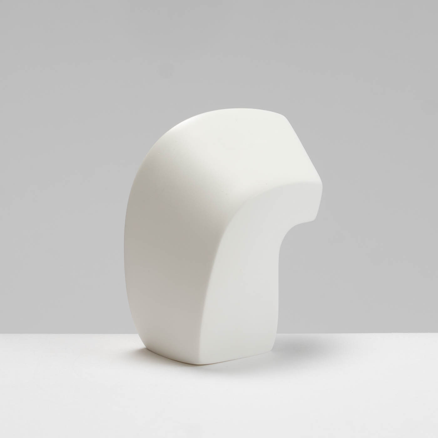 The initial form of this abstract sculptural piece is slip-cast in bone china, then carefully altered and shaped while the clay remains soft. Once bisque-fired, the surface is sanded and burnished. It then undergoes a final high-temperature firing, during which the form subtly softens and bows further, enhancing its organic, expressive qualities.