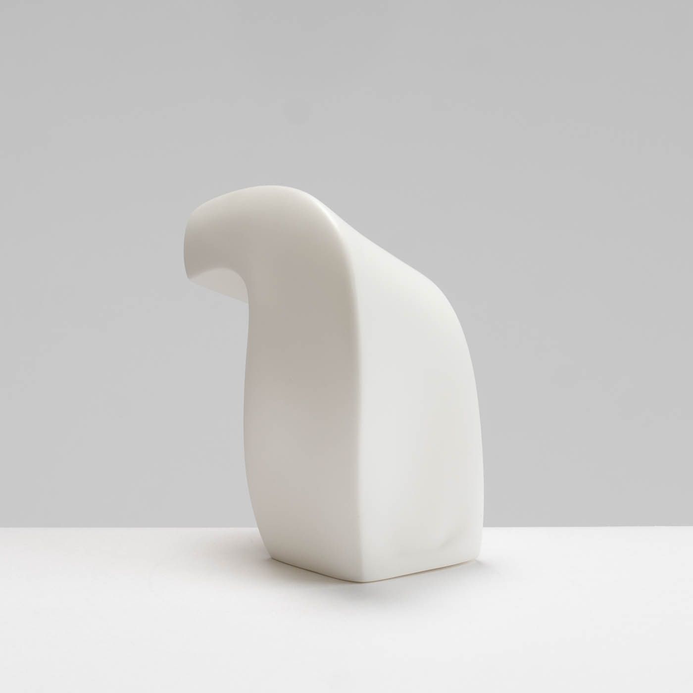 The initial form of this abstract sculptural piece is slip-cast in bone china, then carefully altered and shaped while the clay remains soft. Once bisque-fired, the surface is sanded and burnished. It then undergoes a final high-temperature firing, during which the form subtly softens and bows further, enhancing its organic, expressive qualities.