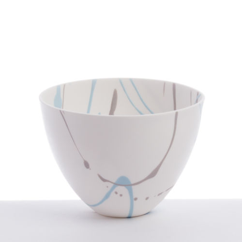 This bowl is wheel-thrown in black stoneware clay with slip and sgraffito decoration.