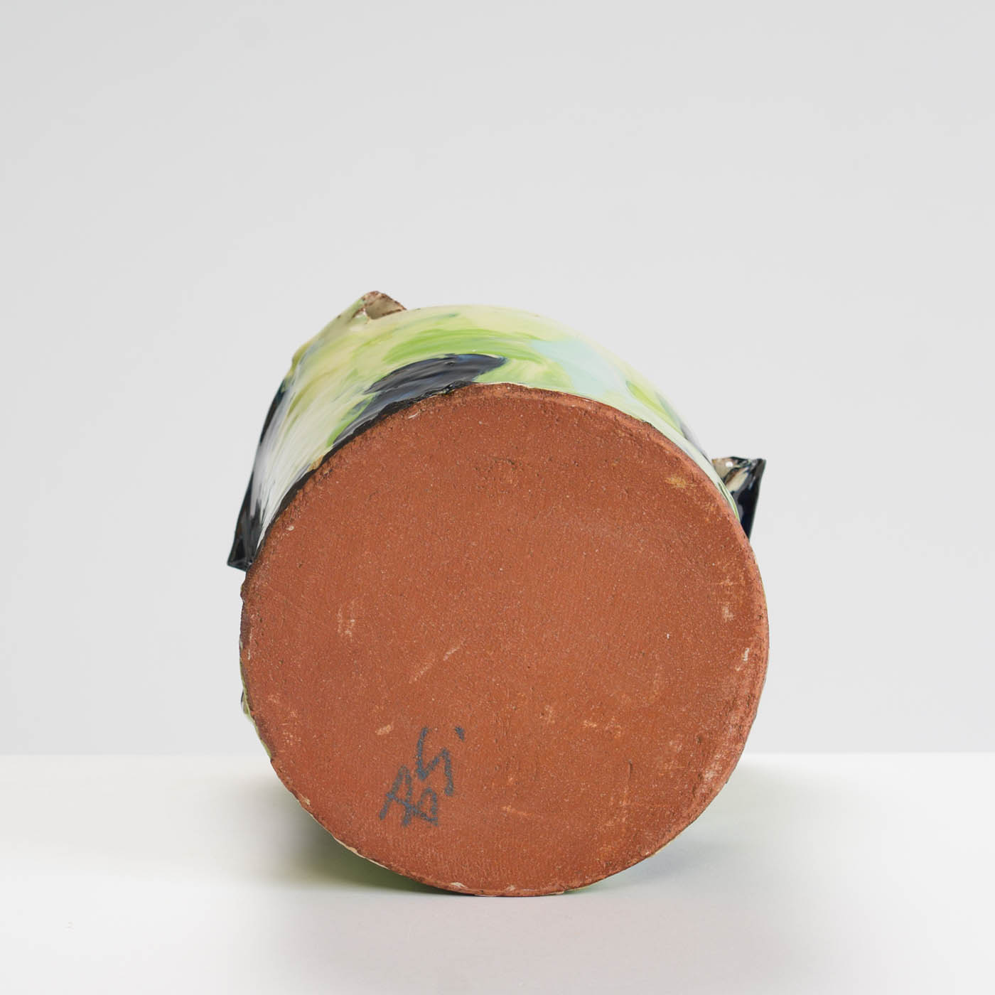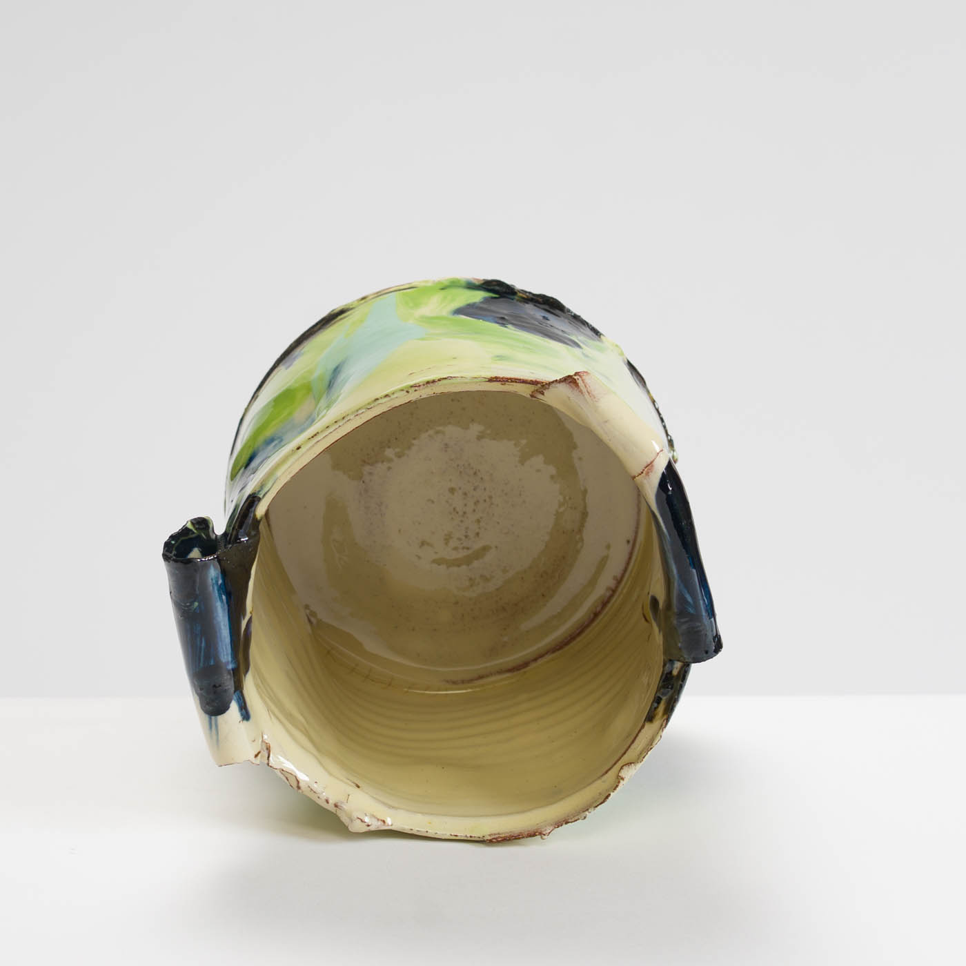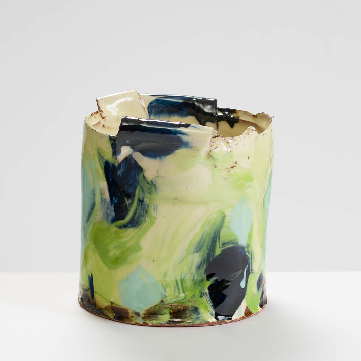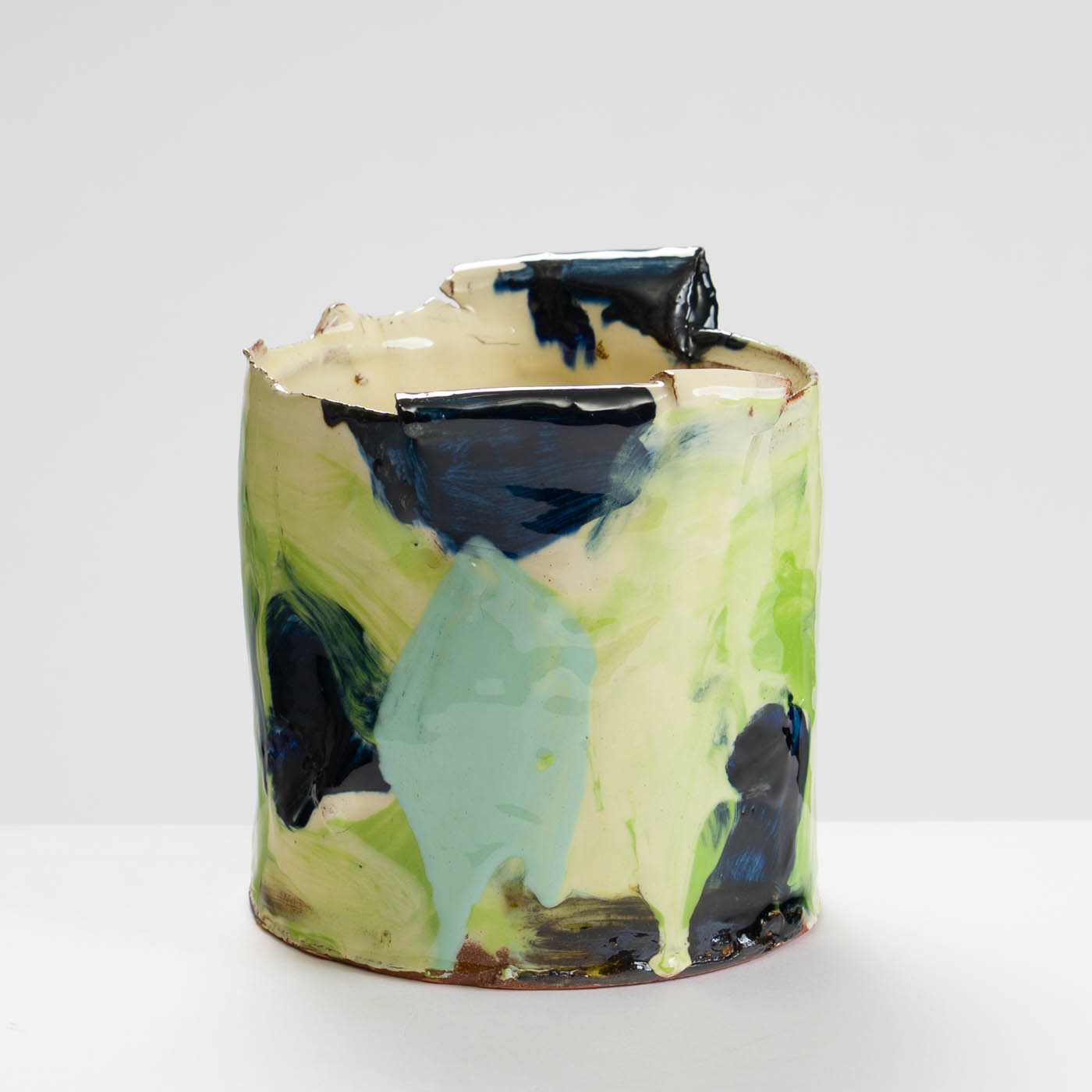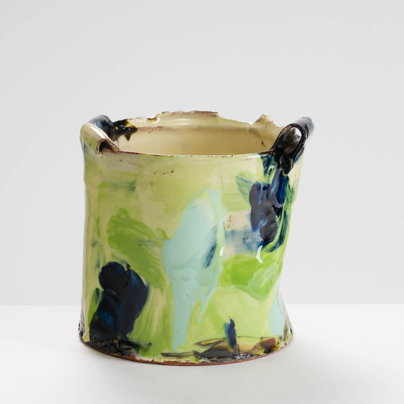 This animated earthenware vessel is thrown soft and altered. It is then decorated in a painterly way with brushed layers of multi-coloured slips, and glaze.