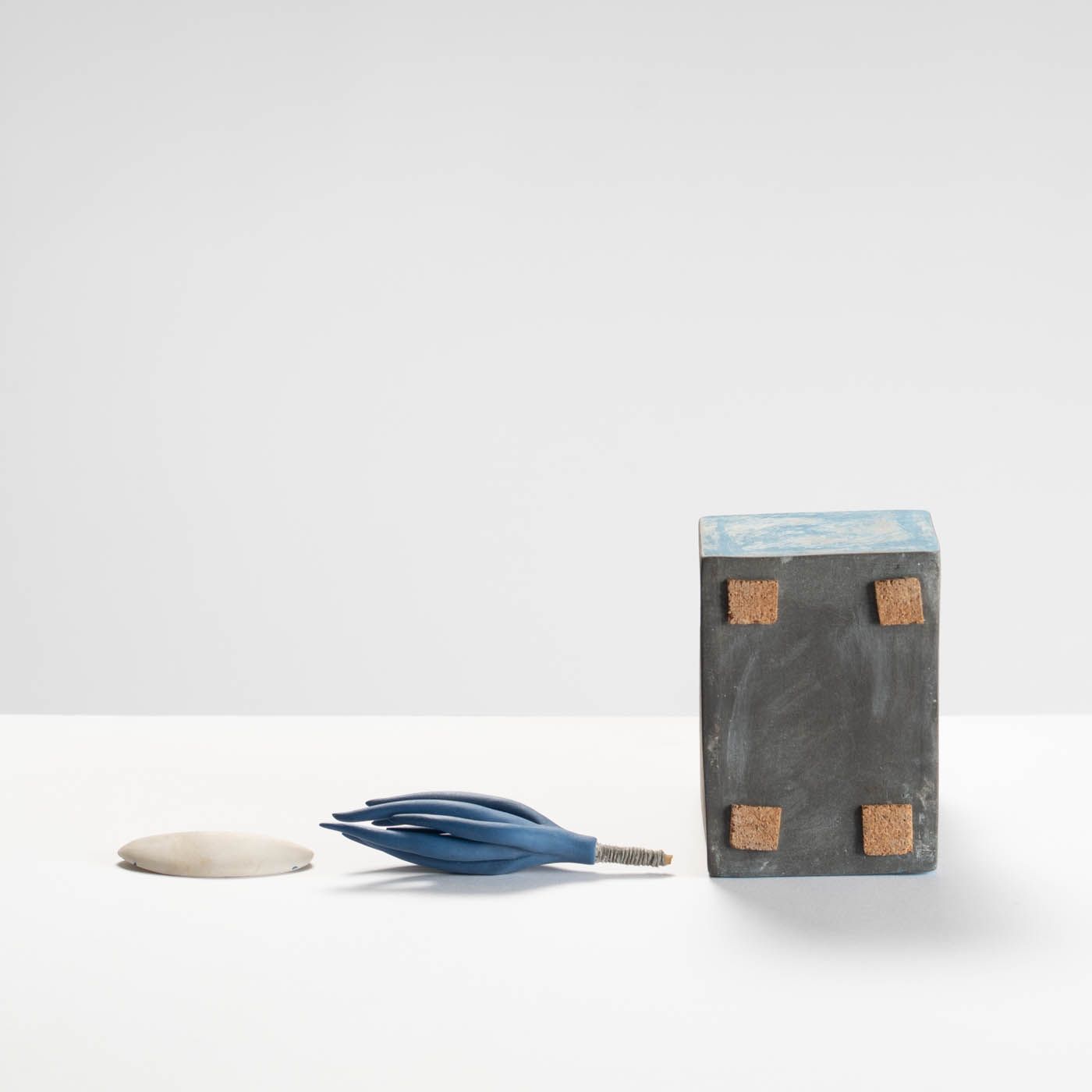 This sculptural assemblage is hand-built with components using anthracite clay and grey stoneware – both with underglaze decoration, white porcelain with glass frit, and blue porcelain.