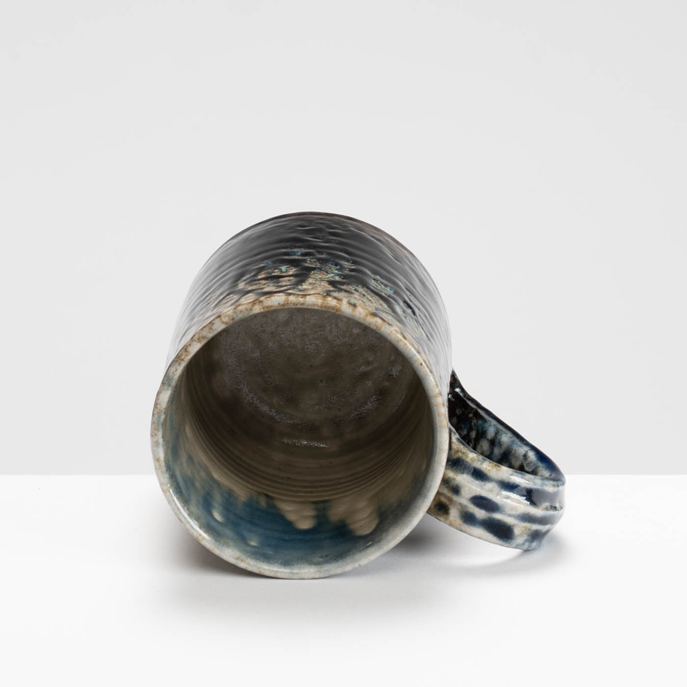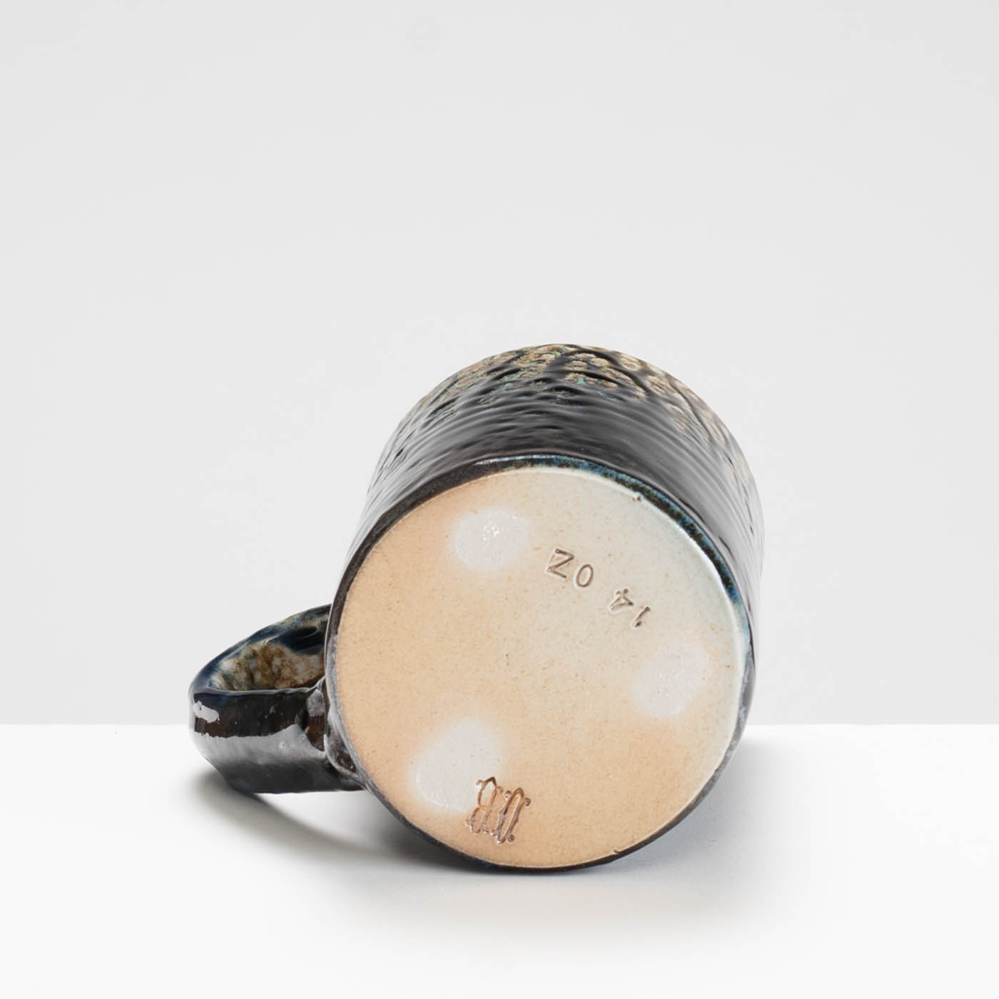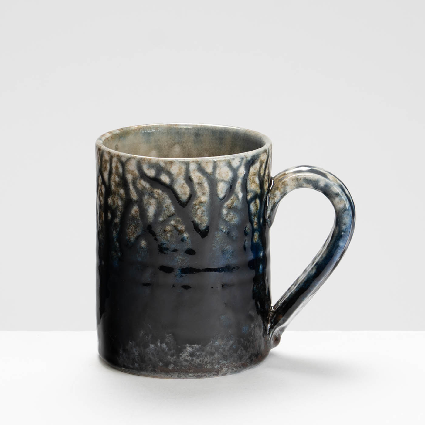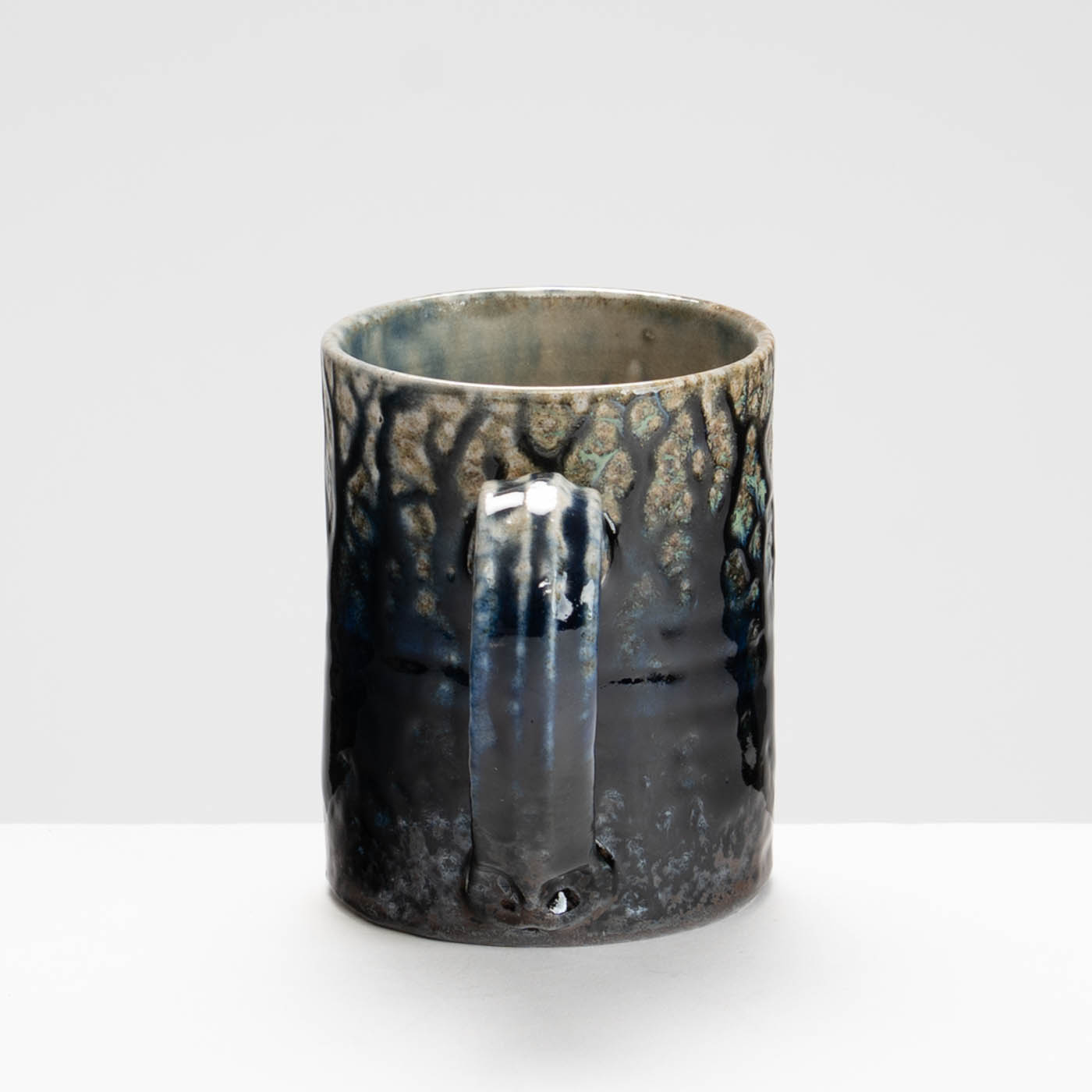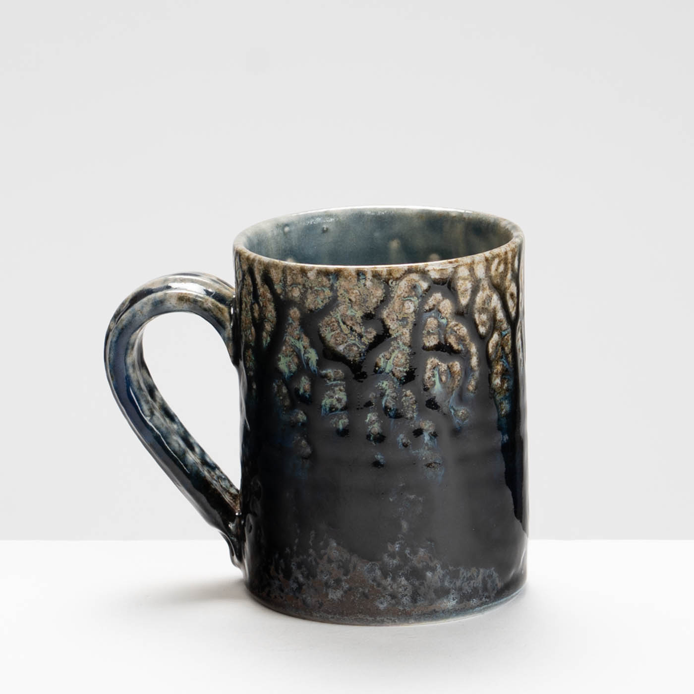 This stoneware wheel-thrown mug is salt and ash glazed. Vibrant slips and ash glazes are used which encourage the firing process to leave its mark on the ware, developing textures and movement within the fluid glaze, producing unique works to be explored beyond their surface.