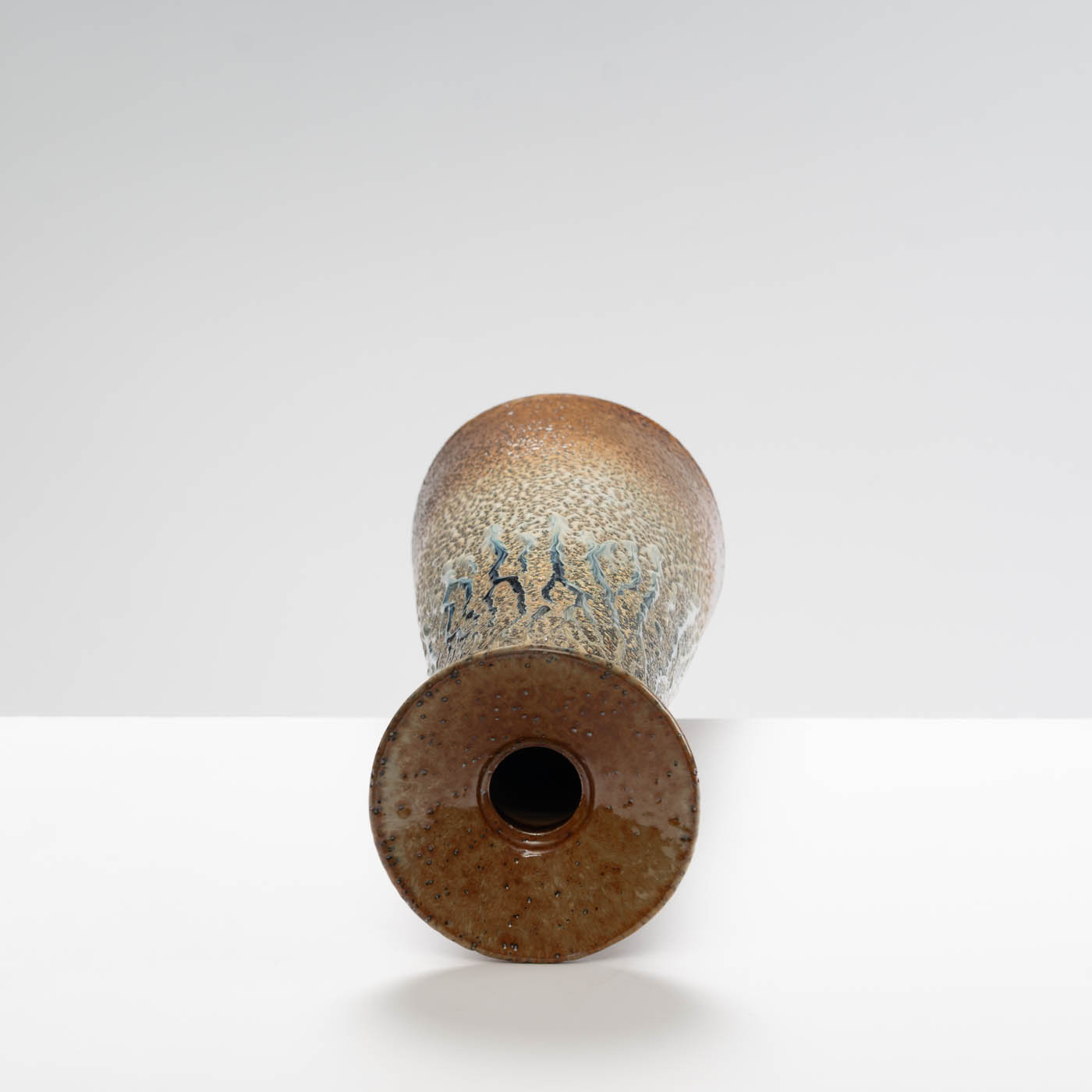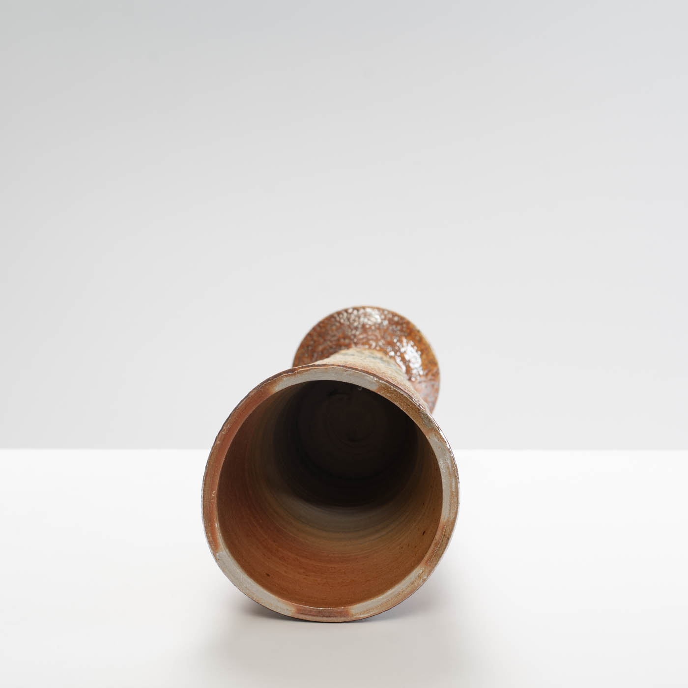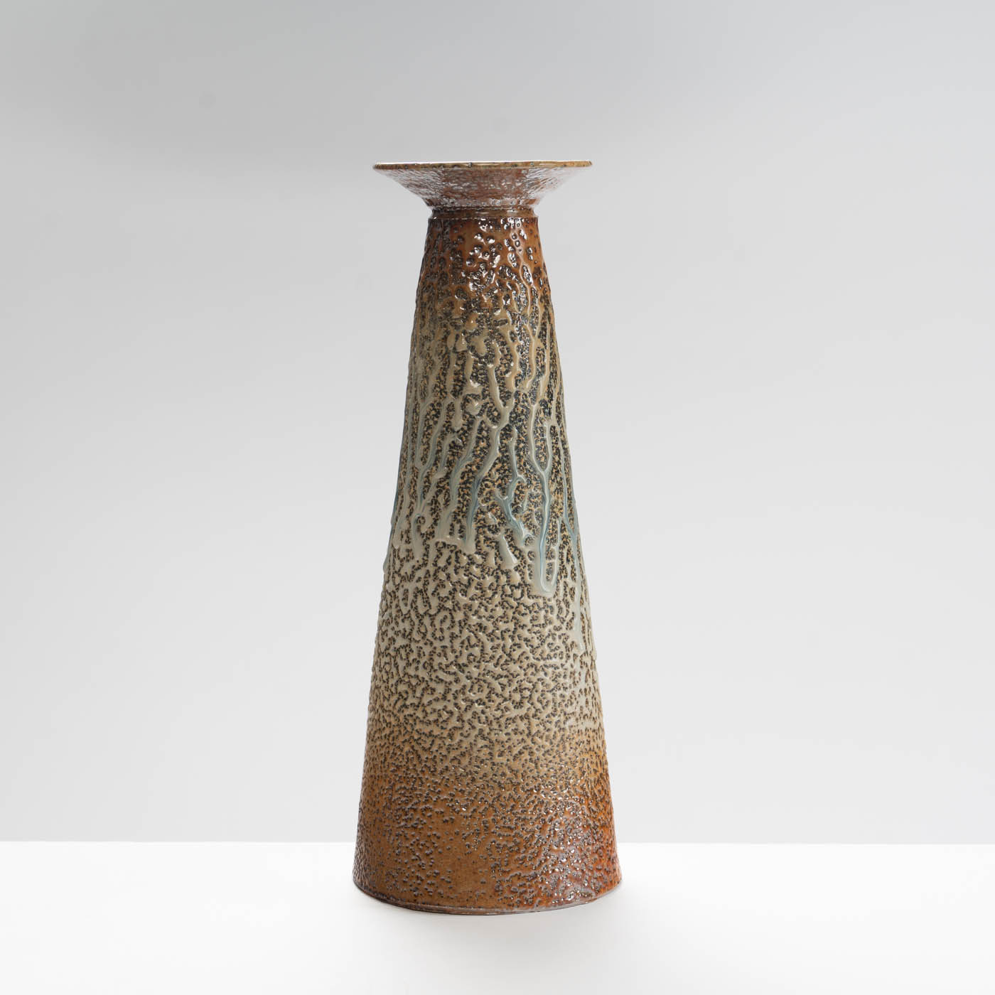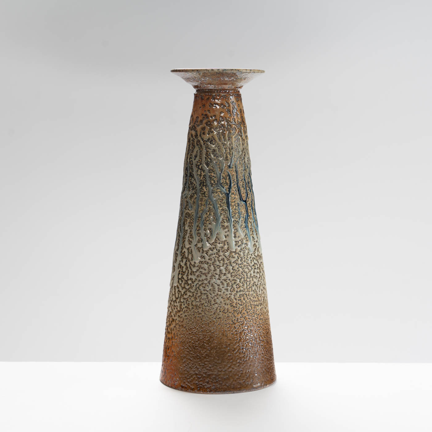 This stoneware wheel-thrown candlestick is salt and ash glazed. Vibrant slips and ash glazes are used which encourage the firing process to leave its mark on the ware, developing textures and movement within the fluid glaze, producing unique works to be explored beyond their surface.