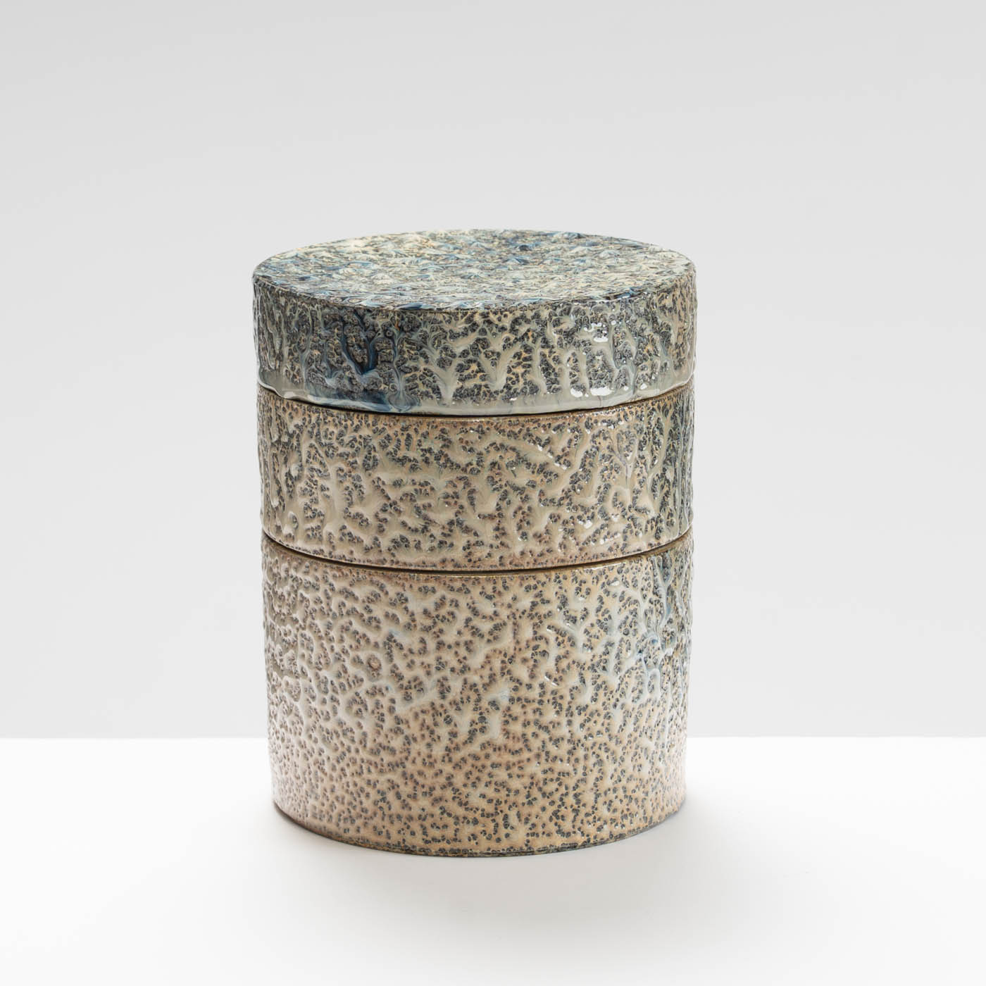 This stoneware wheel-thrown lidded stacking jar is salt and ash glazed. Vibrant slips and ash glazes are used which encourage the firing process to leave its mark on the ware, developing textures and movement within the fluid glaze, producing unique works to be explored beyond their surface.