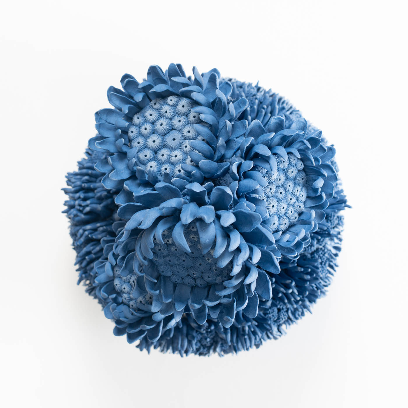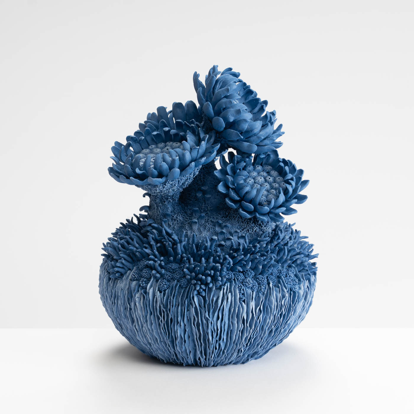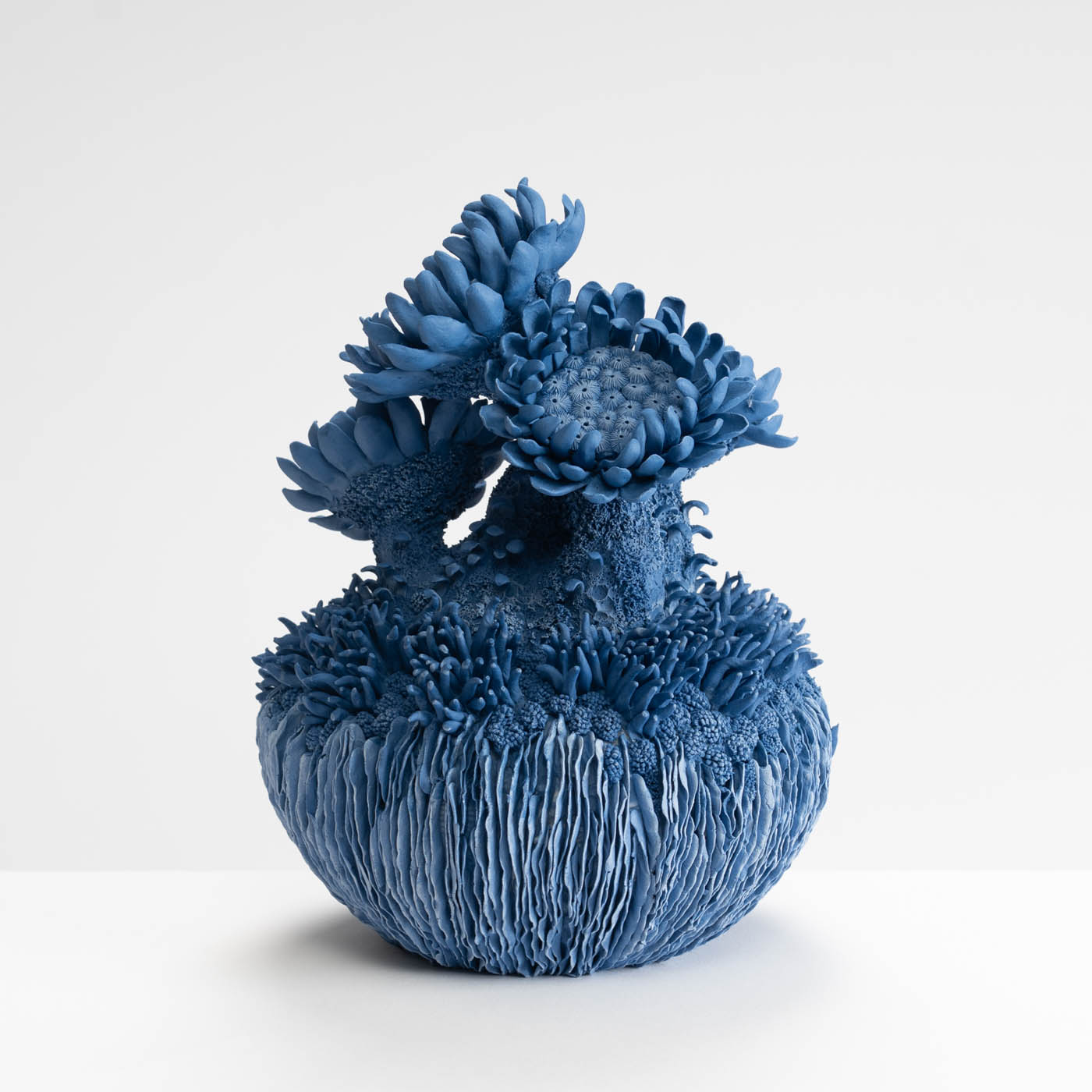 This hand-built porcelain sculpture emerges from the fusion of Erum’s scientific research and artistic practice. Stained porcelain is worked to an extreme thinness and applied to a central form through repeated, meditative gestures. The process mirrors natural growth patterns and produces a rhythmic surface structure with a sense of movement.