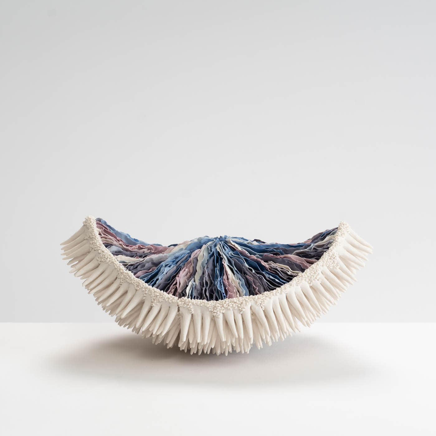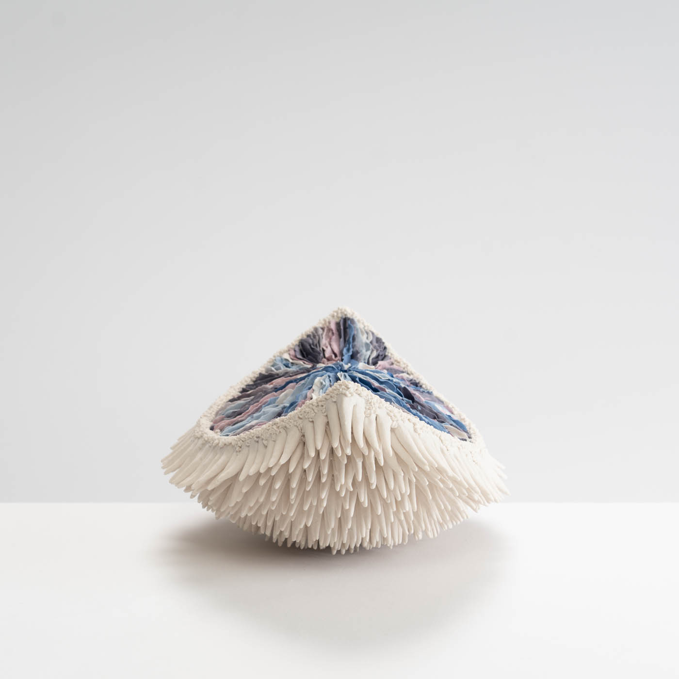 This hand-built porcelain sculpture emerges from the fusion of Erum’s scientific research and artistic practice. Stained porcelain is worked to an extreme thinness and applied to a central form through repeated, meditative gestures. The process mirrors natural growth patterns and produces a rhythmic surface structure with a sense of movement.