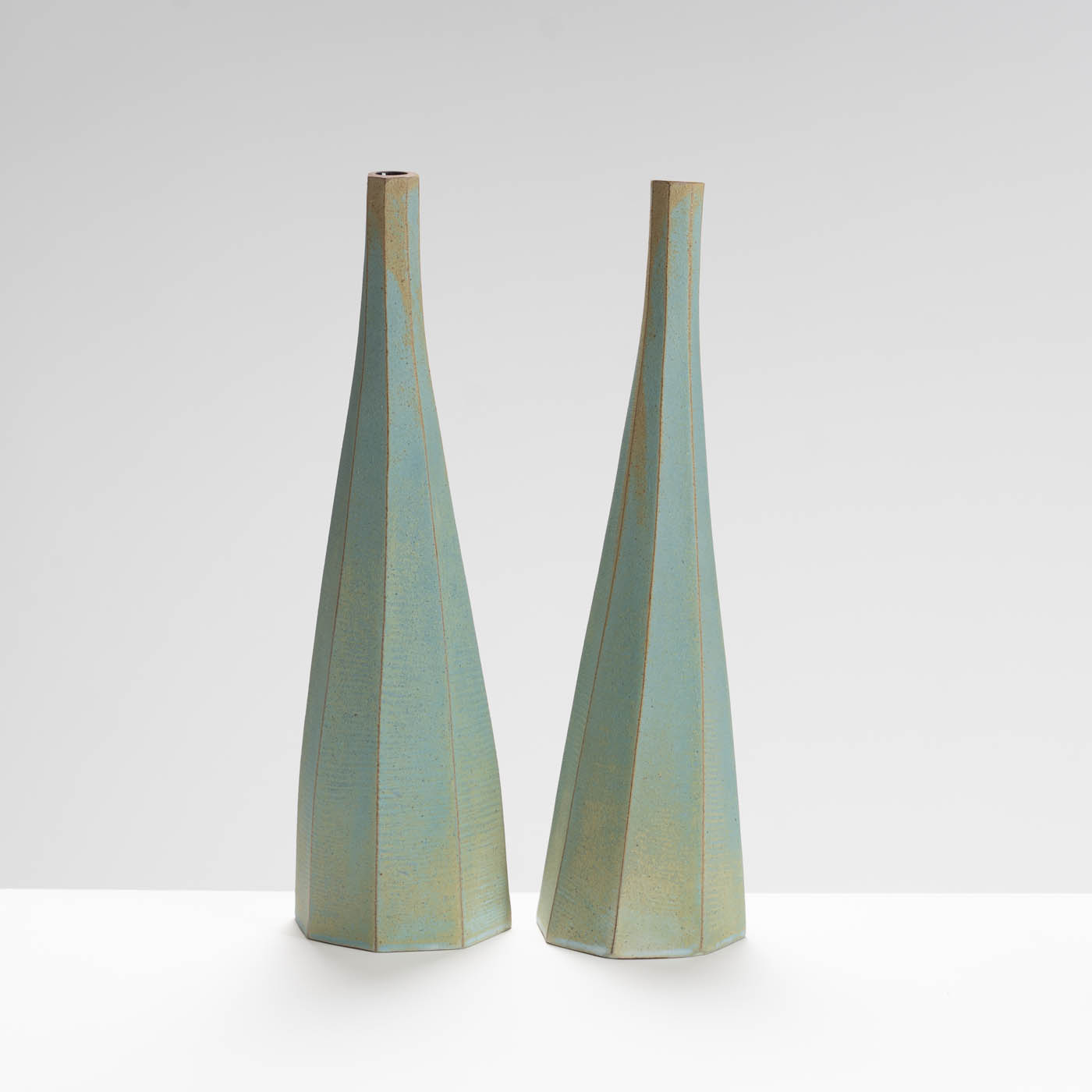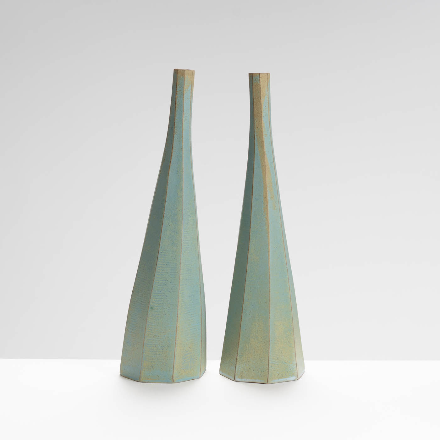 This elegant pair of bottles is thrown in dark stoneware clay and carved when leather hard.