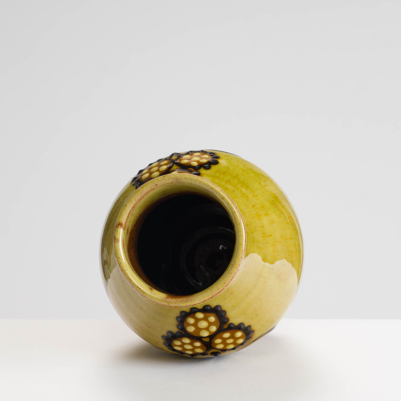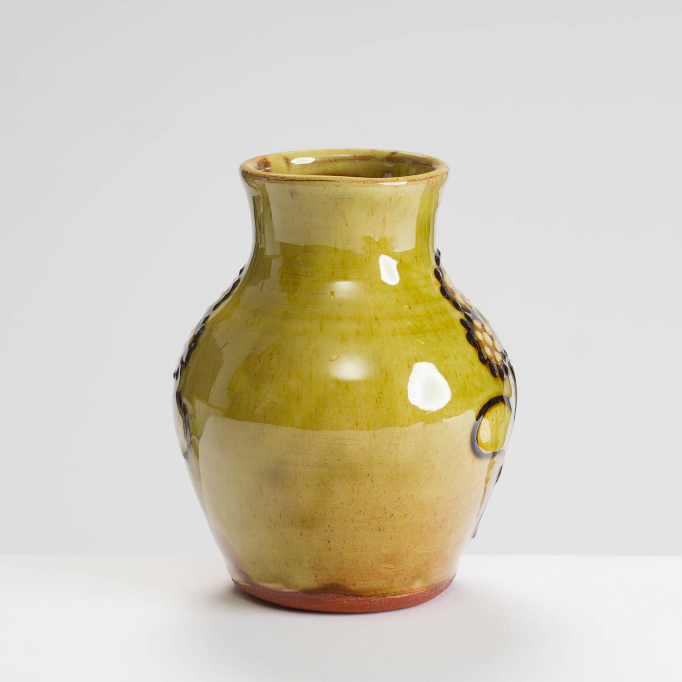 This vase is thrown in red earthenware clay and decorated using coloured slips. The decoration is applied using a slip trailer, and motifs are inscribed with sgraffito lines. The piece is finished with a layer of rich green glaze.