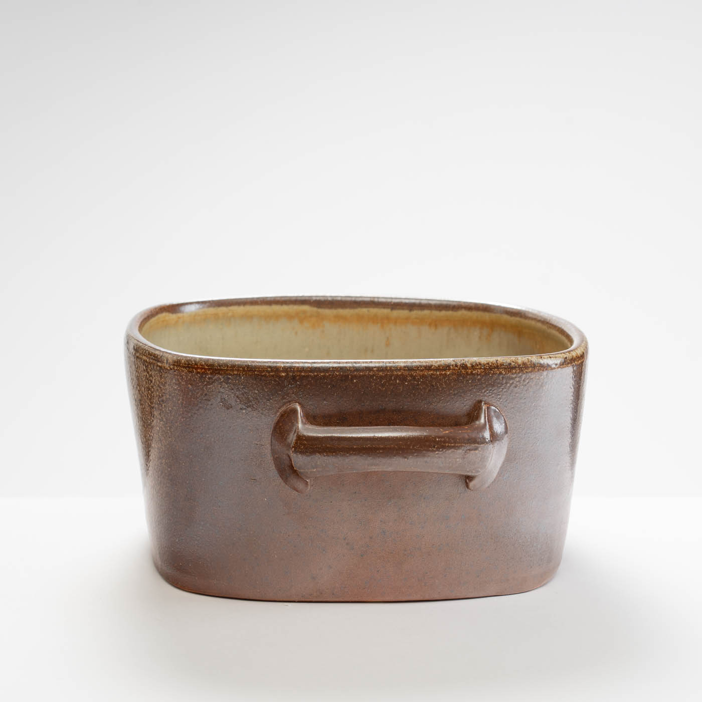 This stoneware dish is wheel-thrown and salt-glazed, balancing clean lines with a subtle, varied textural surface. It is lined with a wood ash glaze and gas fired in a downdraught kiln.