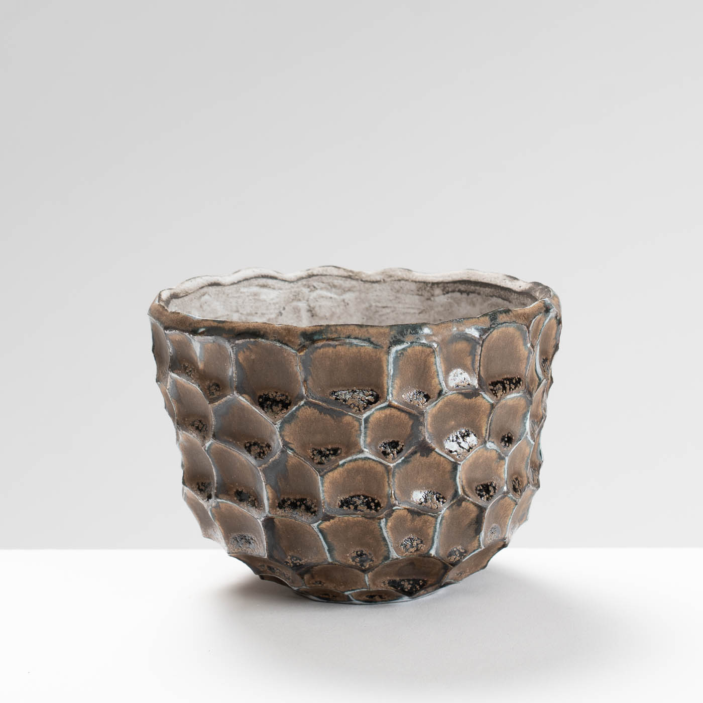 This bowl is hand-built with the coil and pinch technique in black stoneware clay. The textured surface is decorated with layers of with porcelain slip and glaze, the natural palette drawn from nature.