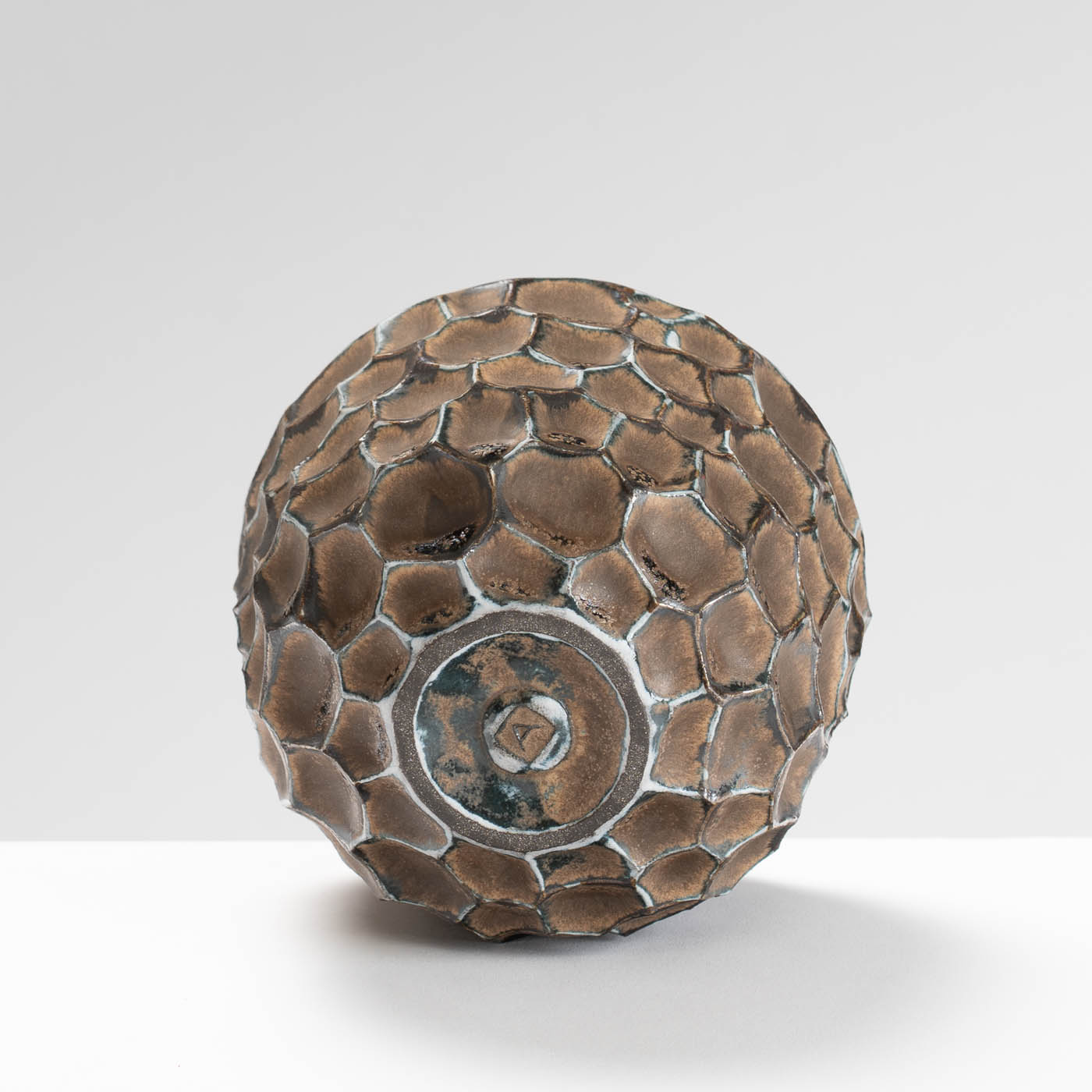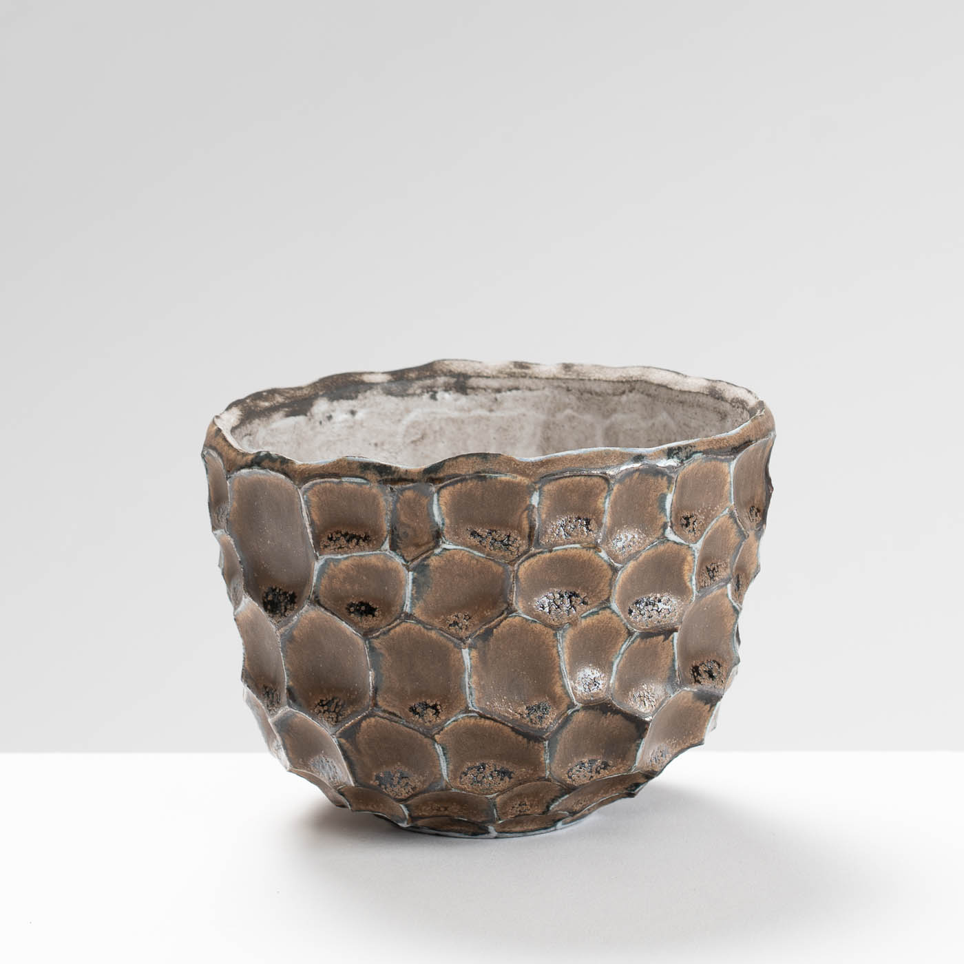 Vessels are hand-built from black, red, or white stoneware clays, using pinch and coil methods to preserve every mark and impression in the soft material. Using only a few simple tools, the process is slow and rhythmic. Surfaces are coated with thin layers of slips and glazes. The pattern left by the pinching process is accentuated as the glaze pools into the hollows. The colours are subtle, with occasional flashes of vibrant colour, all to be found within nature’s palette. Pieces may be fired several times, until a particular quality of colour and texture is achieved.