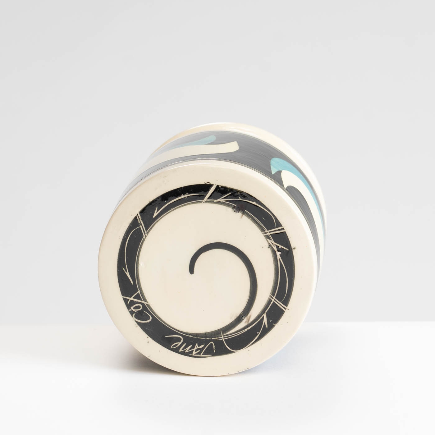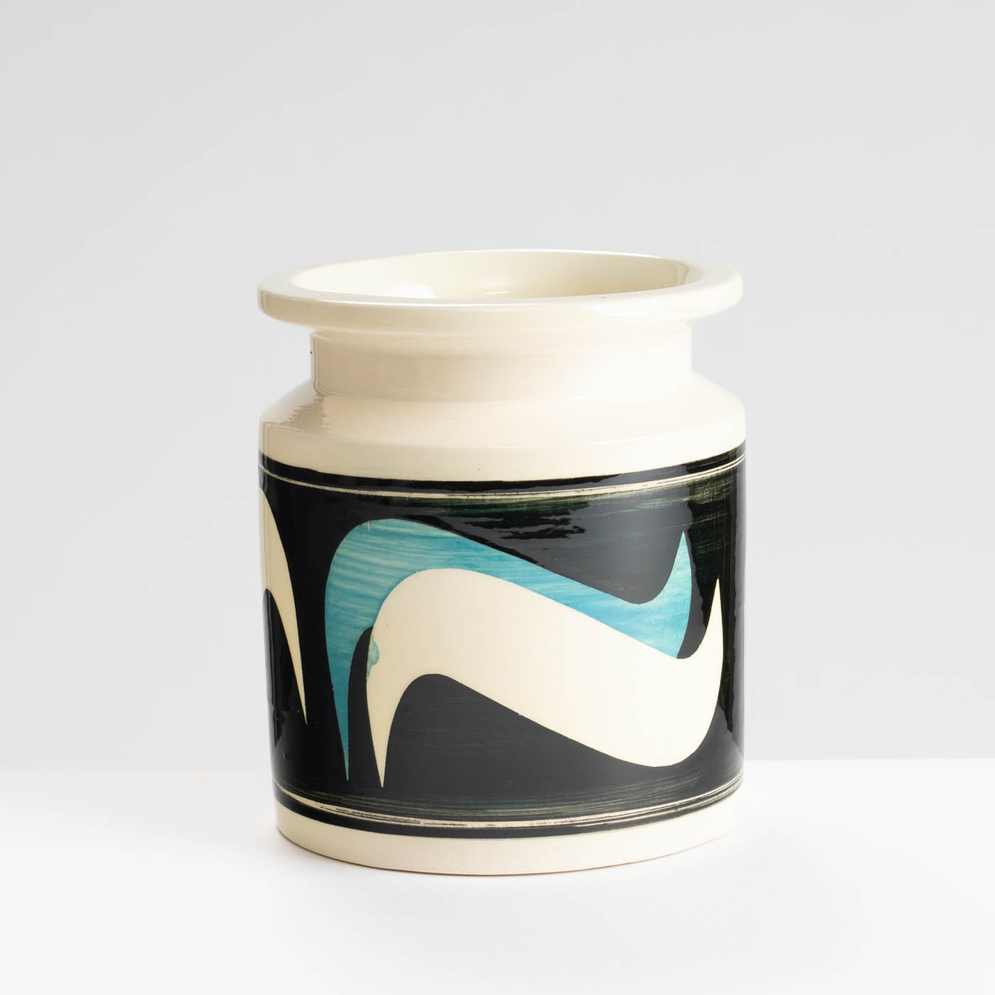 The design of this earthenware spoon jar is inspired by a visit to Barcelona and the exuberance of the place and the vibrant contrasting colours. The energetic brushwork combined with the textured tones of the glaze evokes the rhythms and dynamism of nature in motion.