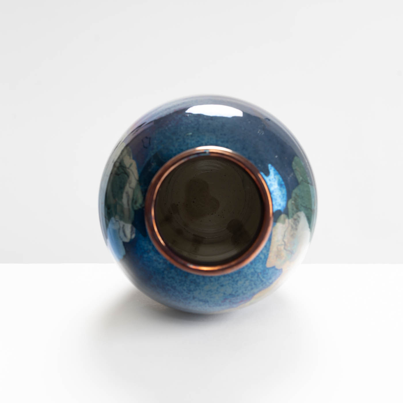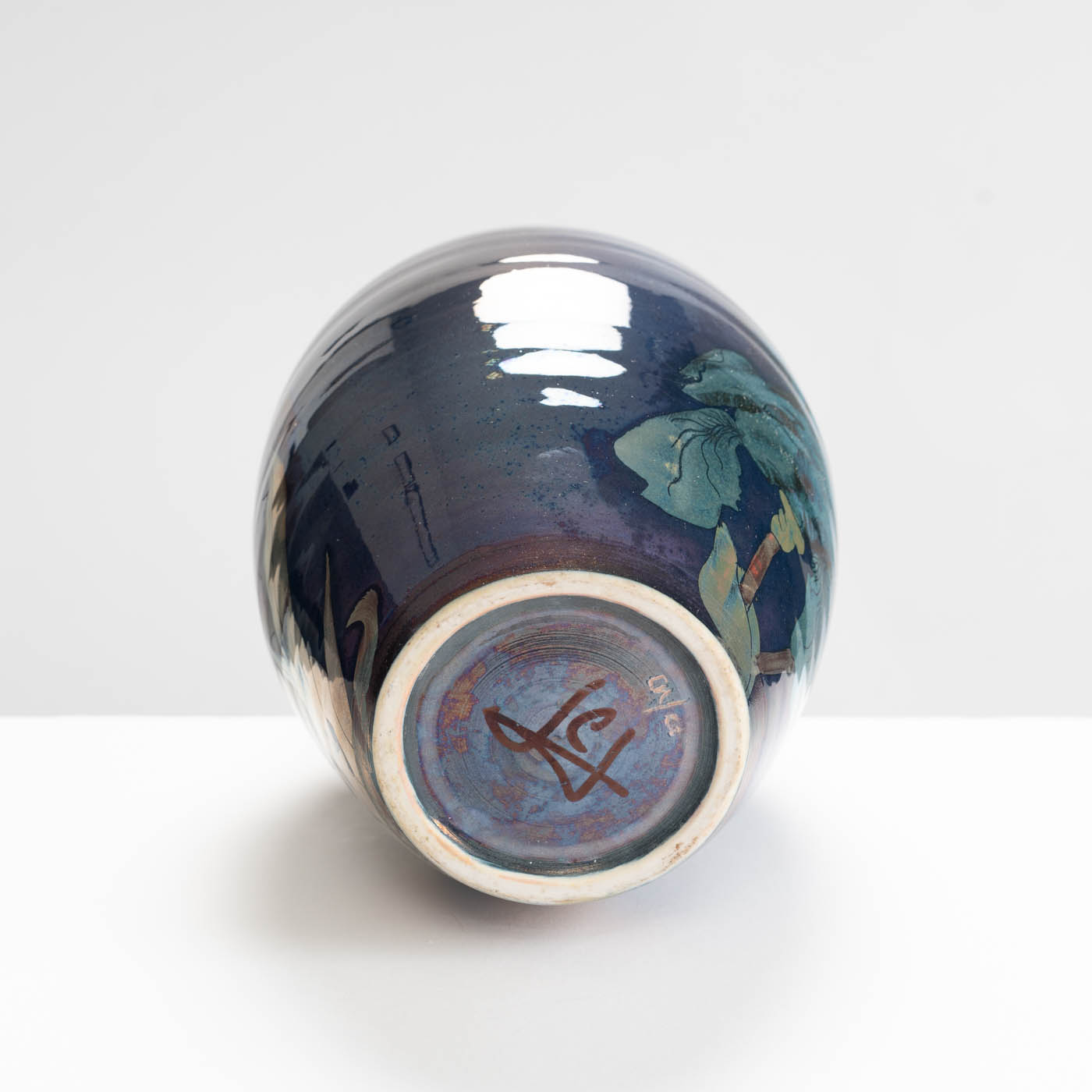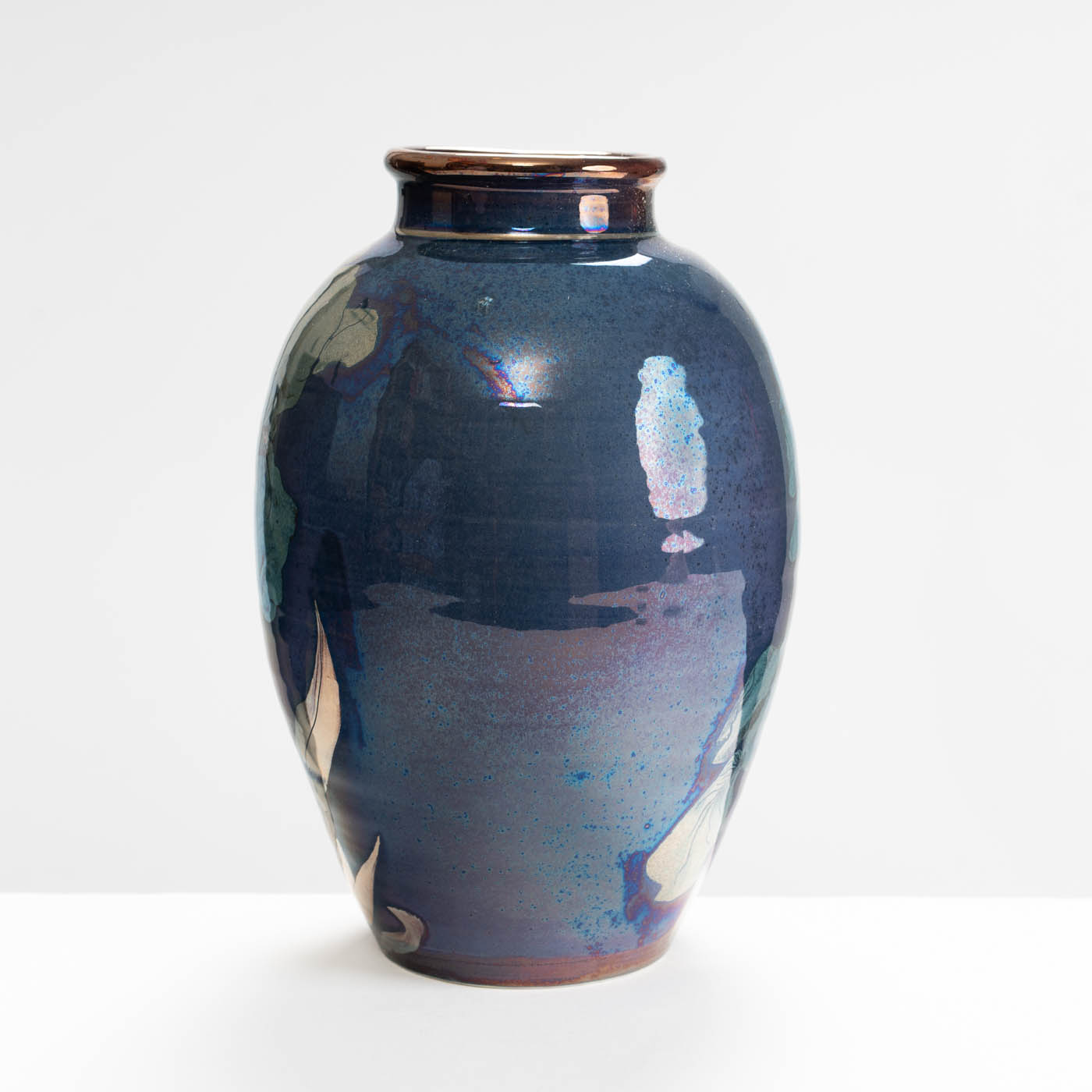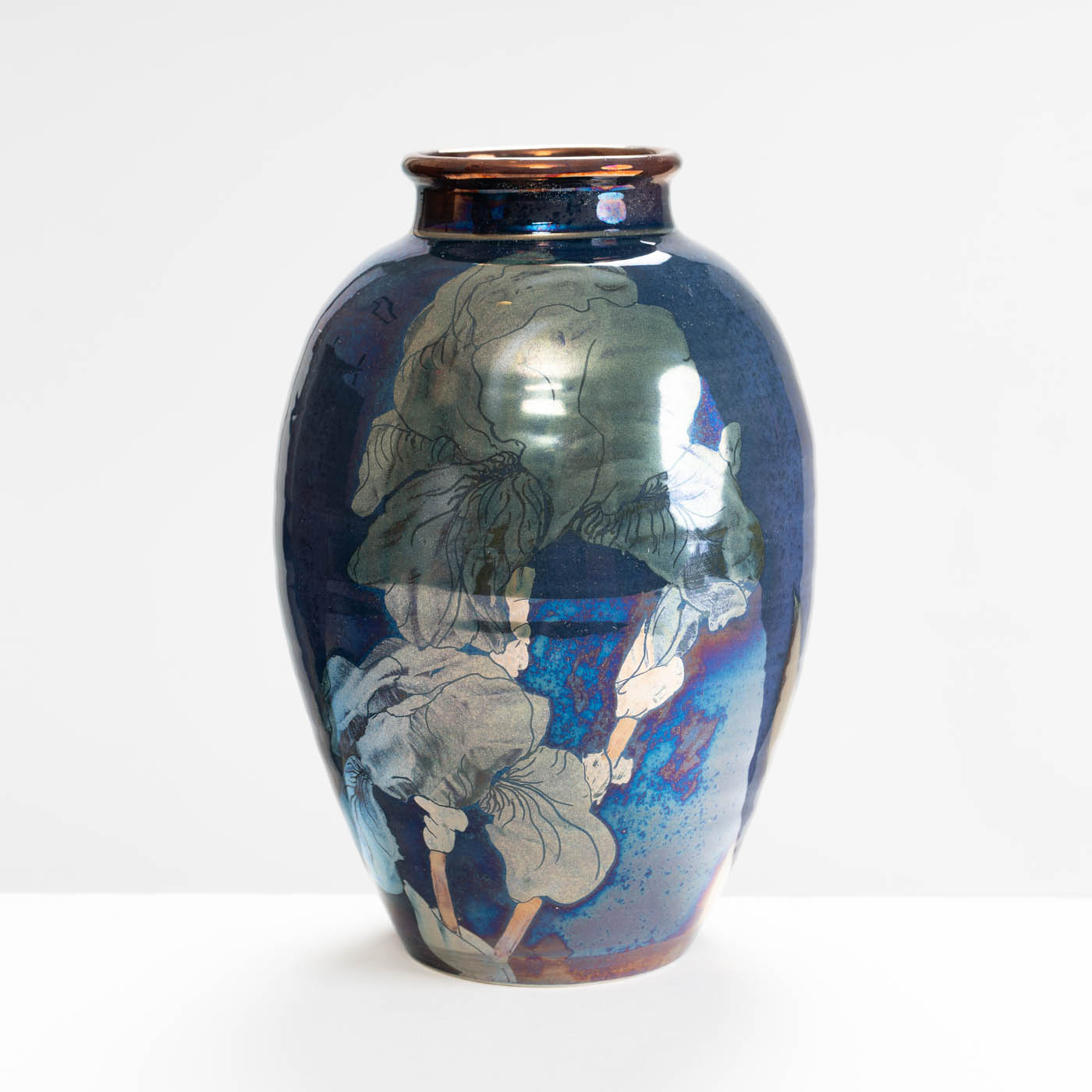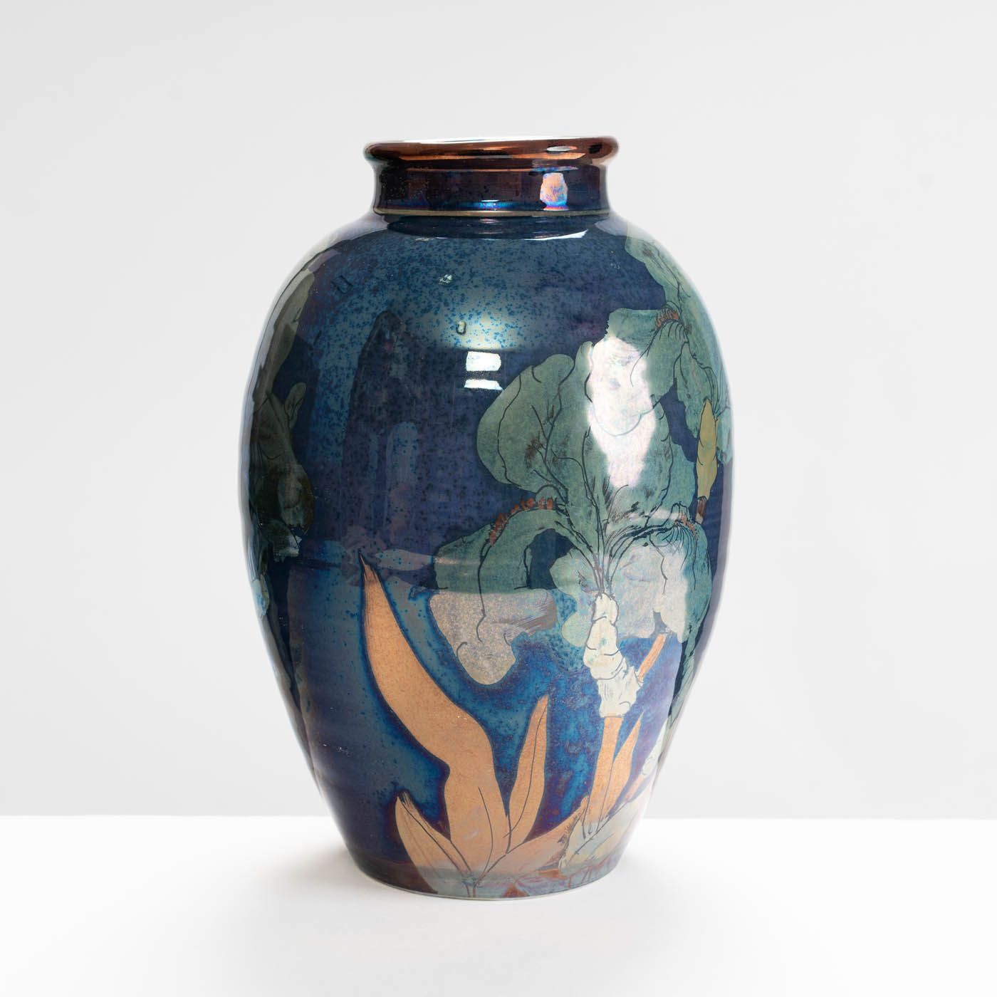 This wheel-thrown porcelain vase is ornately decorated with rich colours and metallic lustre.