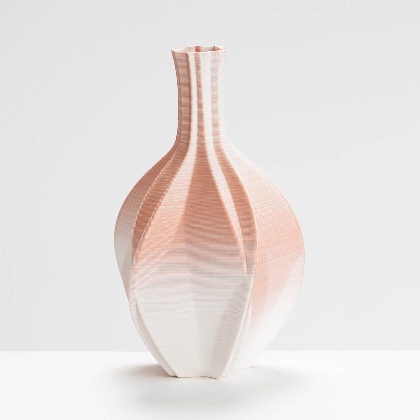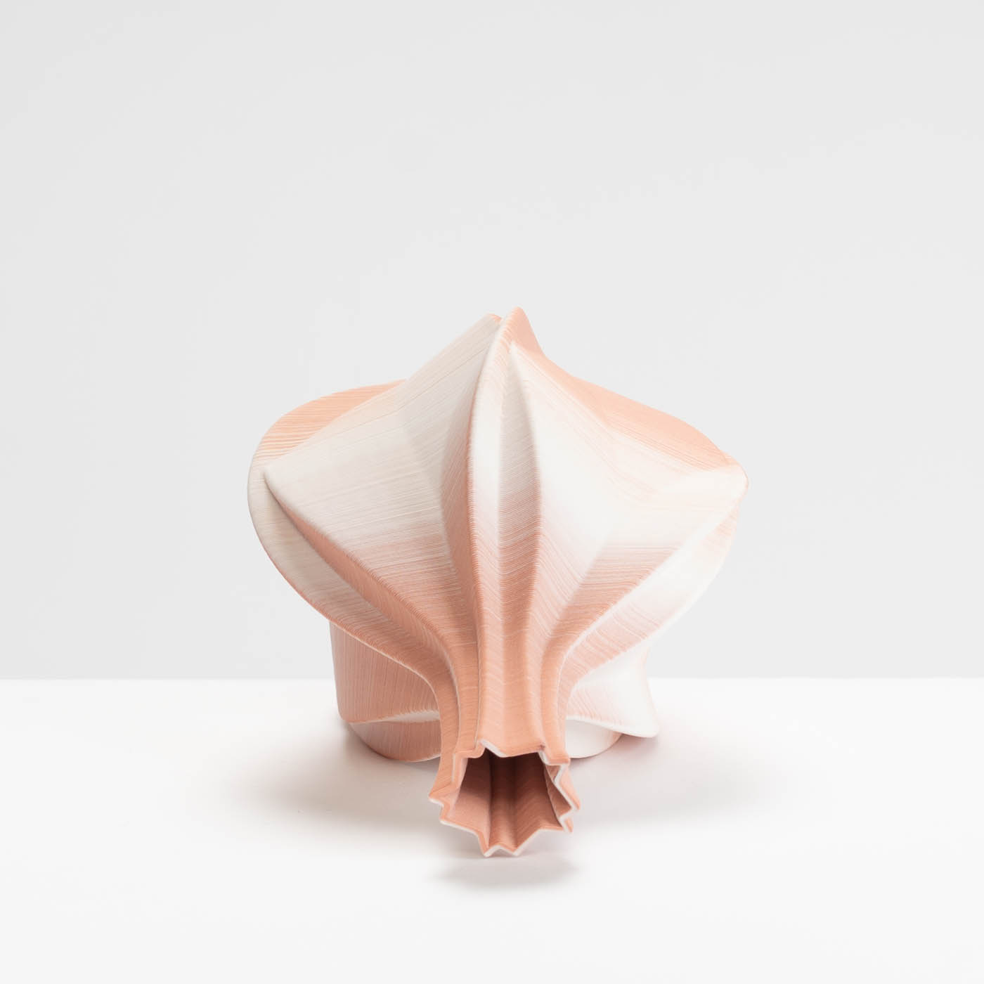 This terracotta/white porcelain bottle is 3D printed. Jack built his own 3D printer which extrudes a continuous thin spiral of soft clay. His designs combine hand-drawn elements with mathematical curves and semi-random ‘noise’. The base is fettled by hand and the piece is raw-fired in oxidation to 1250 degrees C in a gas kiln.
