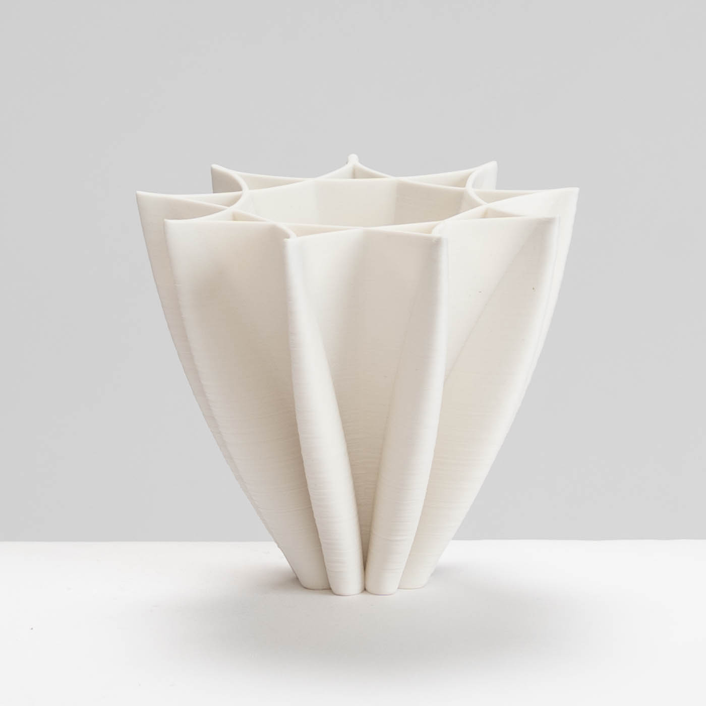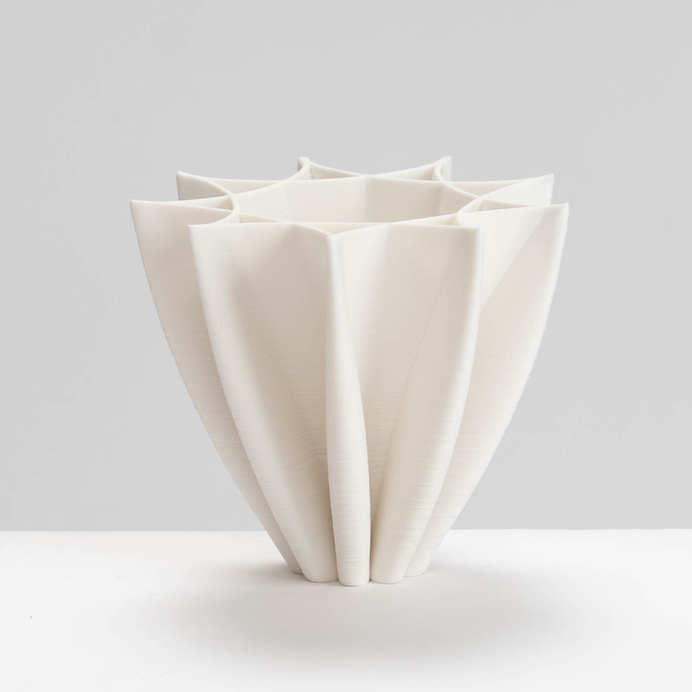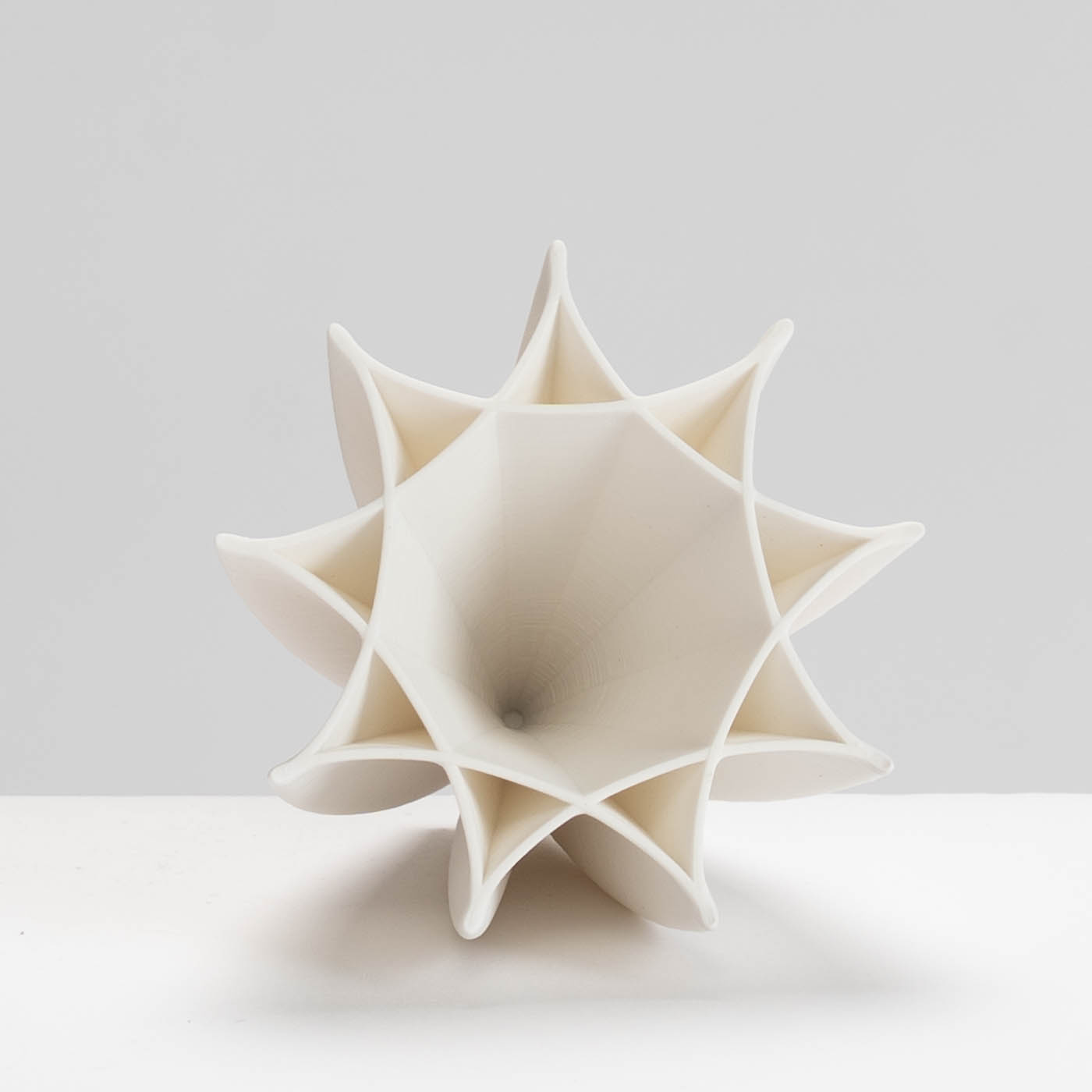 This white porcelain bowl is 3D printed. Jack built his own 3D printer which extrudes a continuous thin spiral of soft clay. His designs combine hand-drawn elements with mathematical curves and semi-random ‘noise’. The base is fettled by hand and the piece is raw-fired in oxidation to 1250 degrees C in a gas kiln.