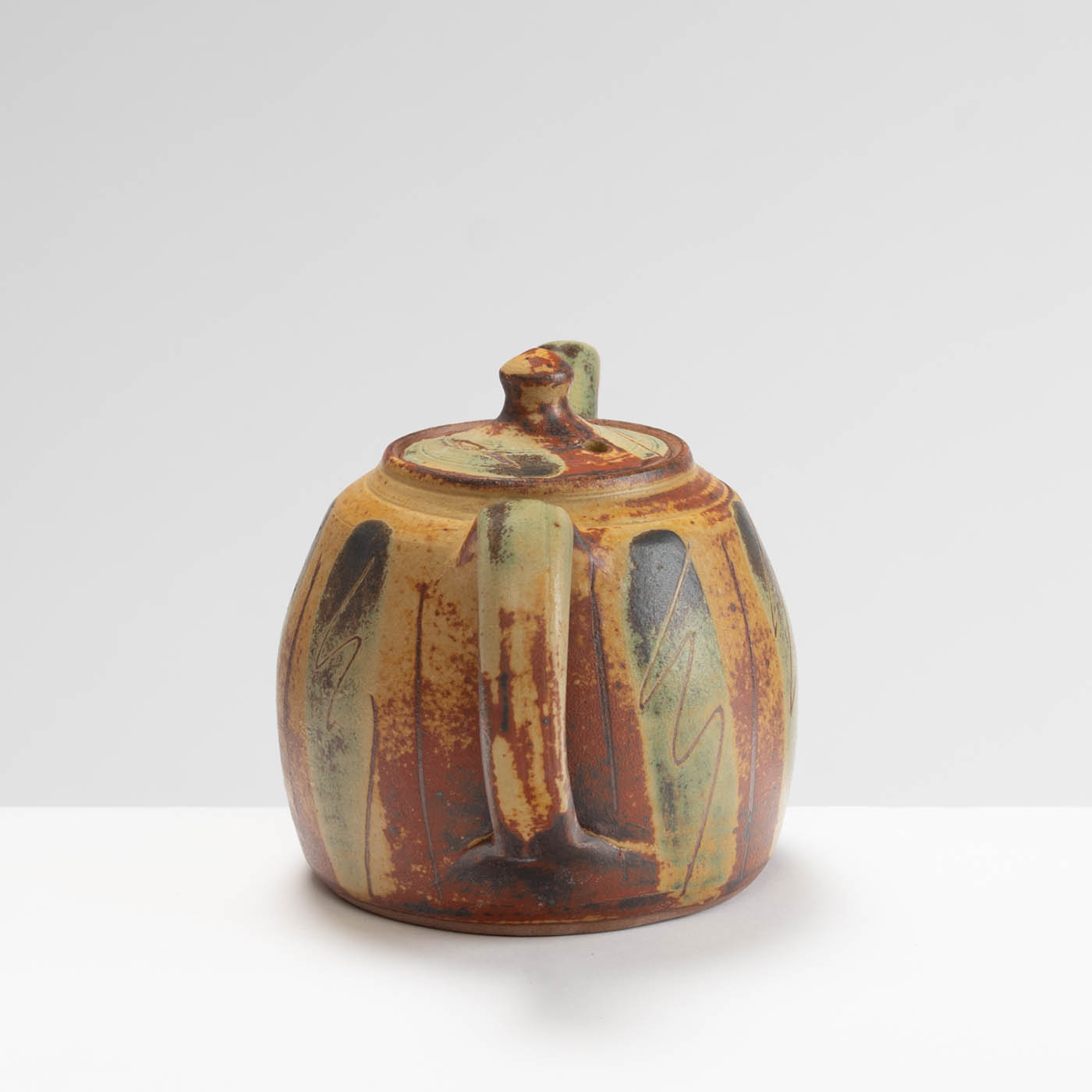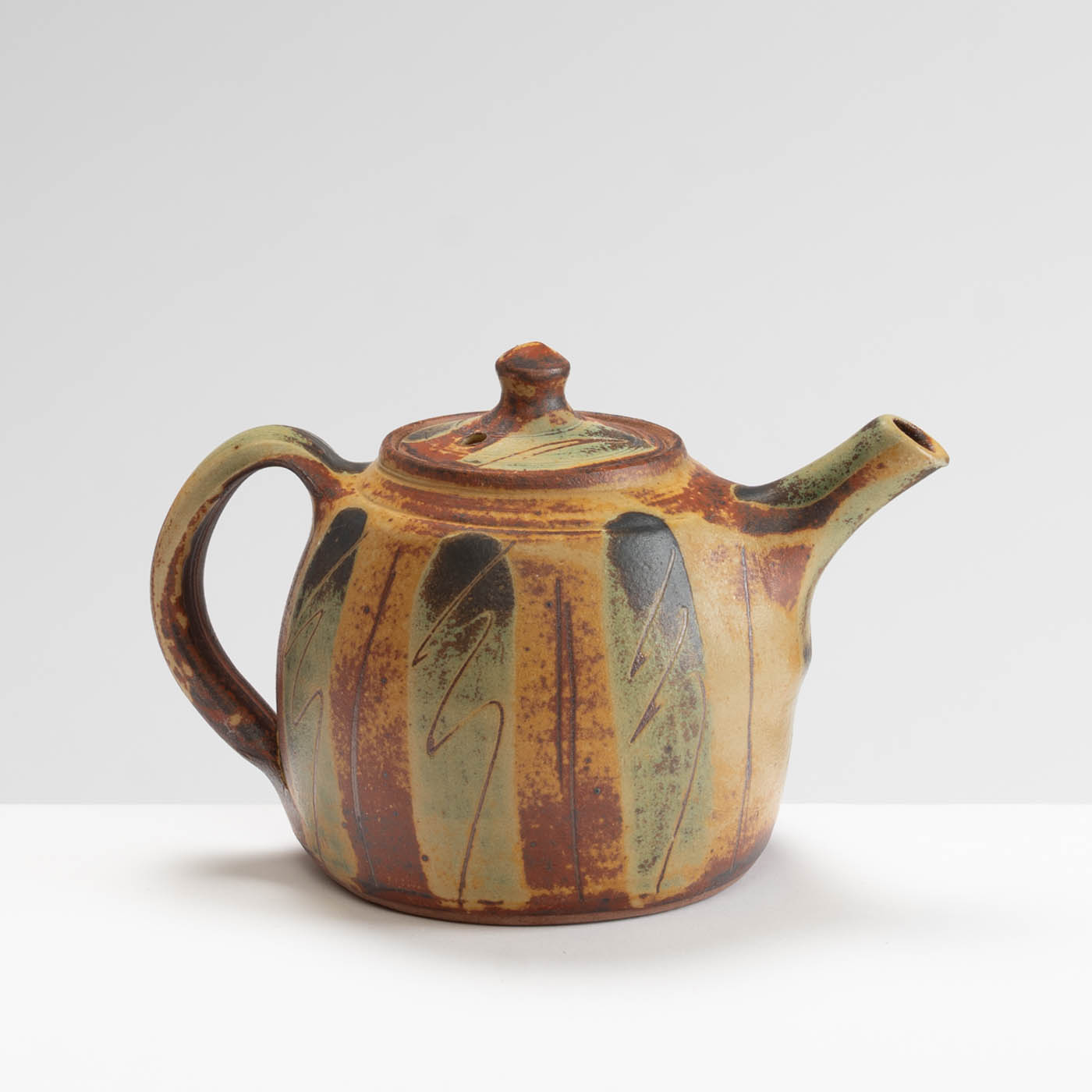 This stoneware teapot is wheel-thrown and decorated with a oxides, sgraffito, and a dry ash glaze which John makes himself using locally sourced ingredients including wood ash and limestone clay. All his work is wood fired.