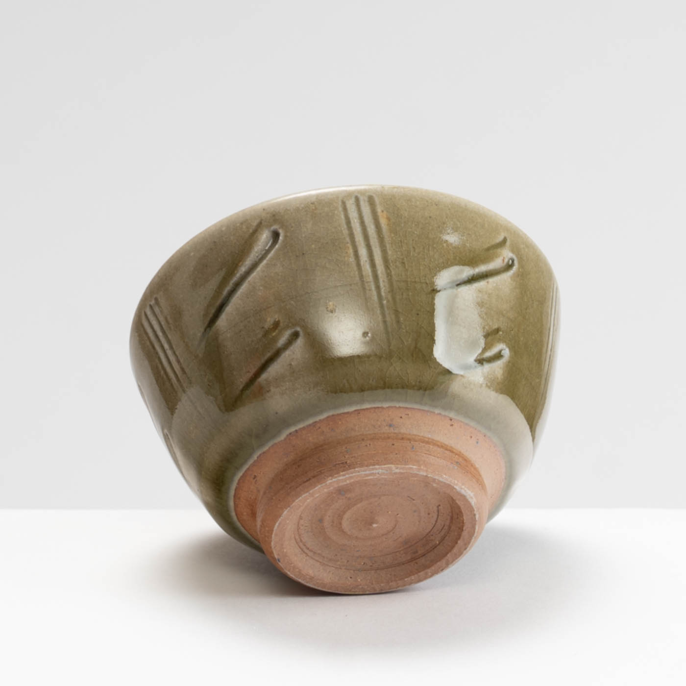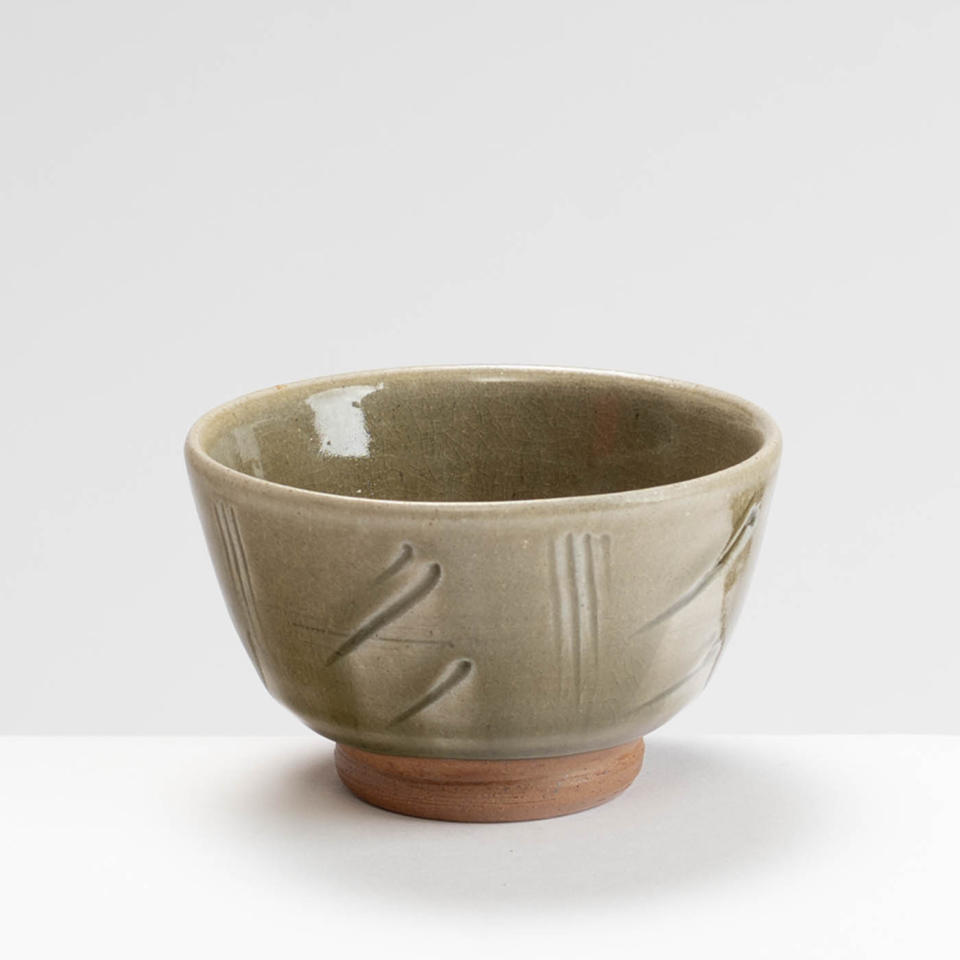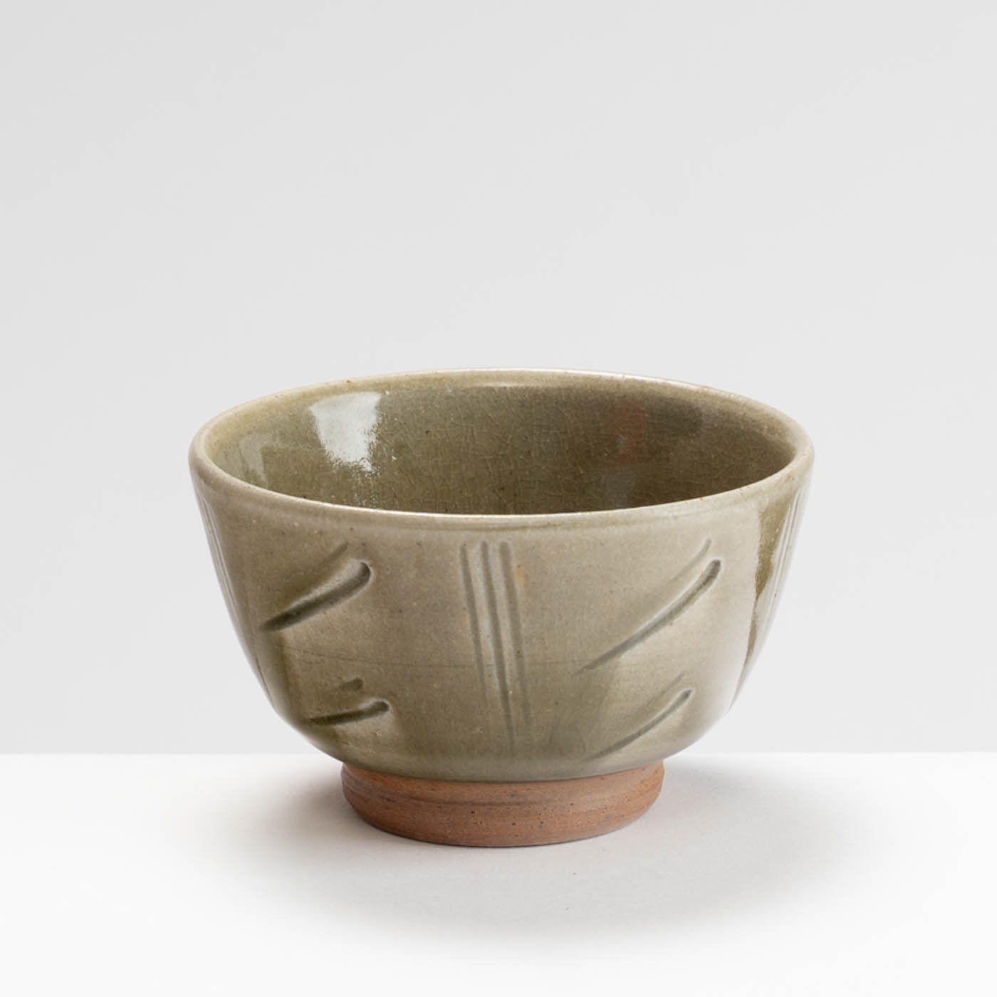 This stoneware bowl is wheel-thrown and decorated with a simple incised design. Its generous form is enhanced by the rich and subtle stoneware glazes which John makes himself using locally sourced ingredients including wood ash and limestone clay. All his work is wood fired.