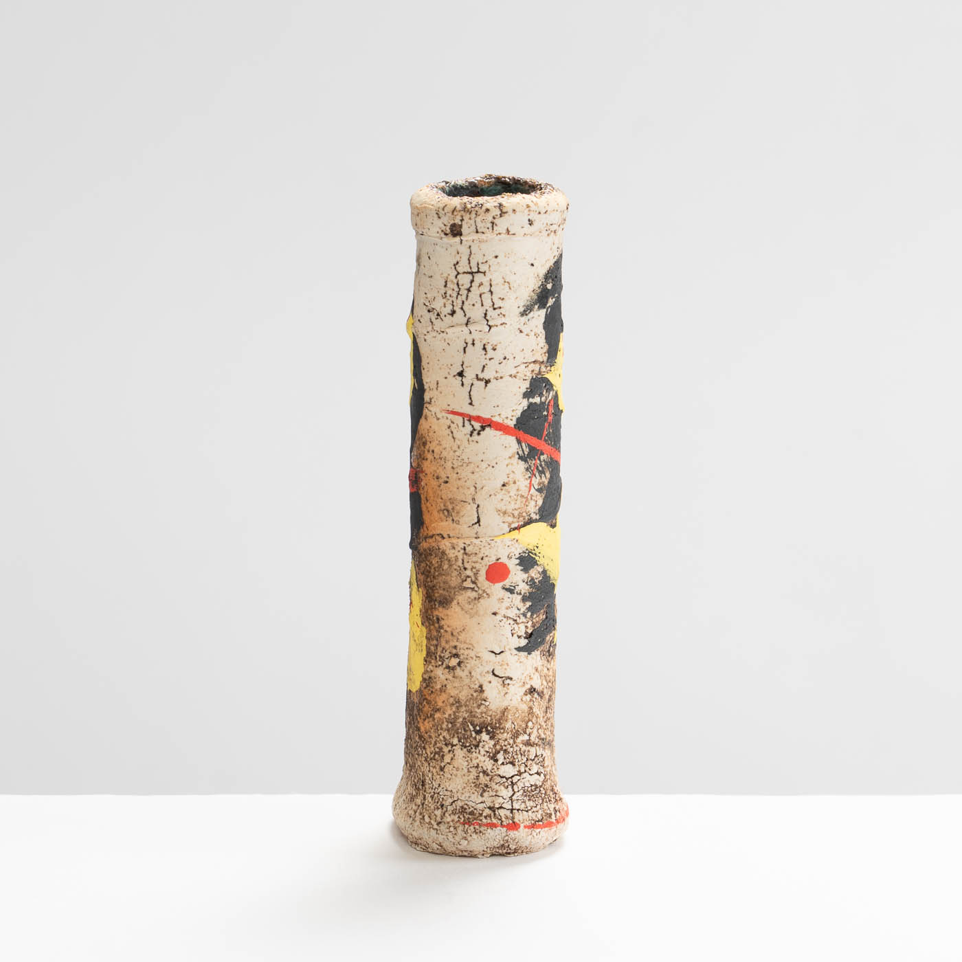 This stoneware vase is hand-built in ball clay and decorated with splashes of colour. Elements of John’s inspiration by ancient Greek pottery can be detected in the sandy textured surface and the deep turquoise interior.