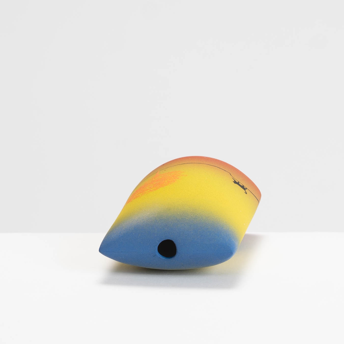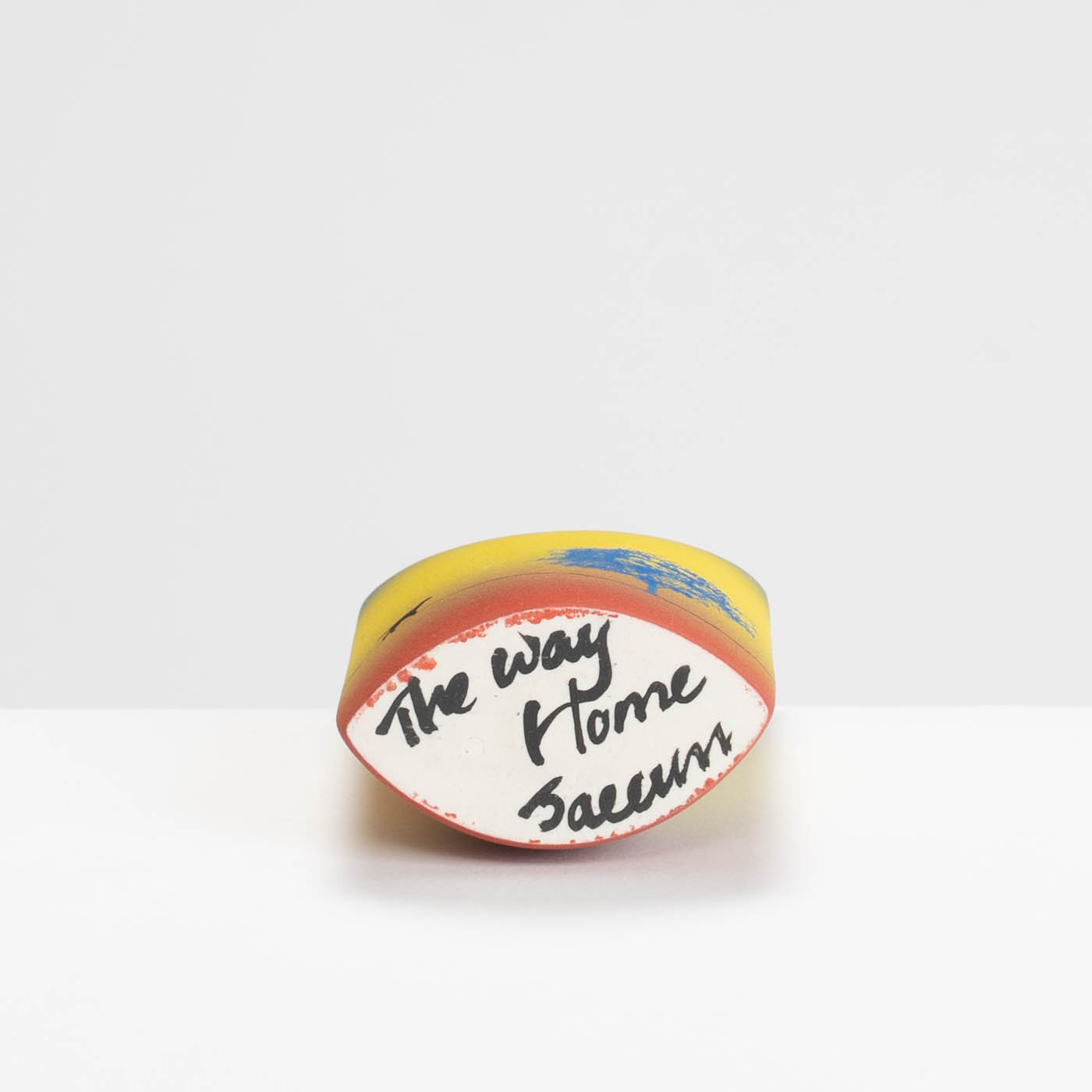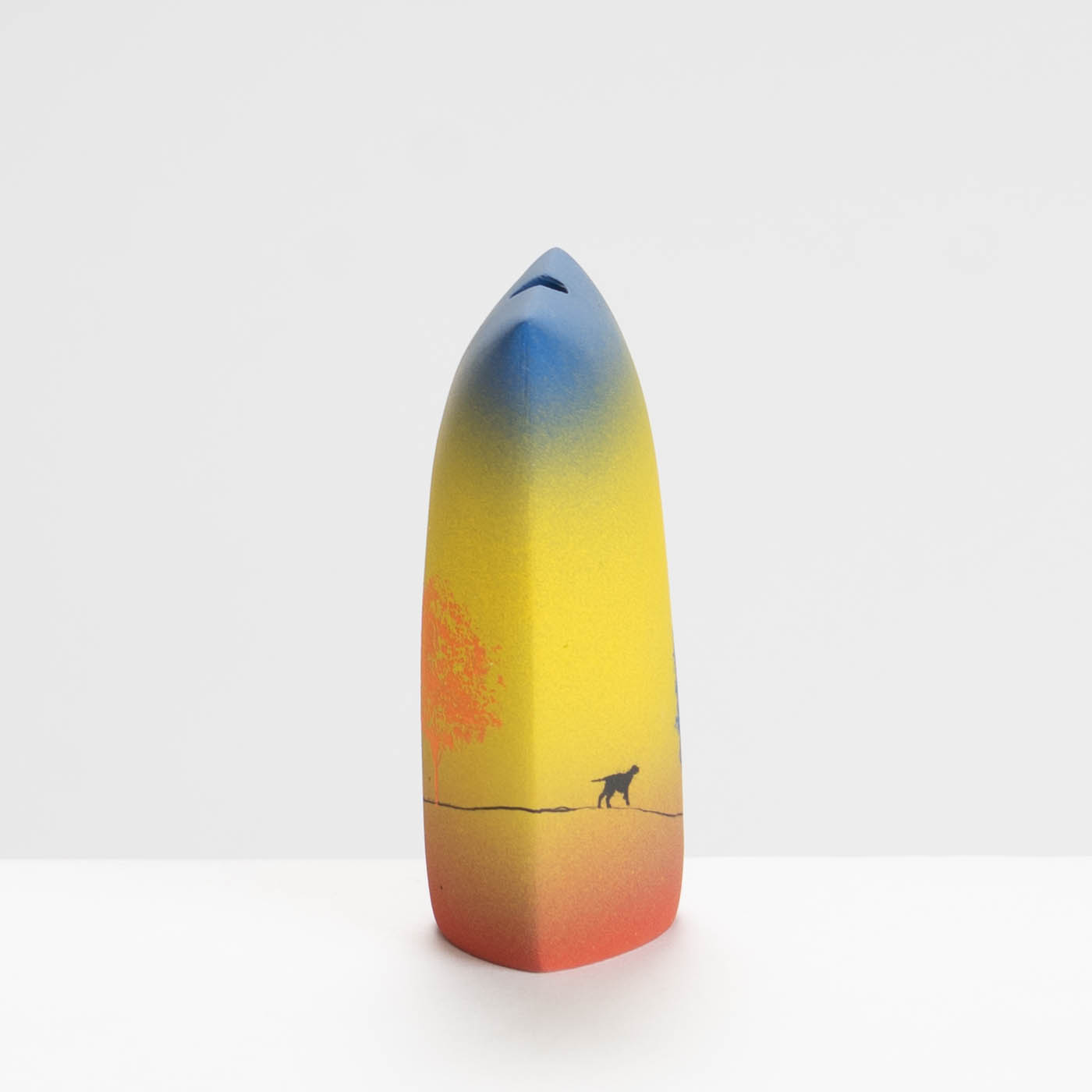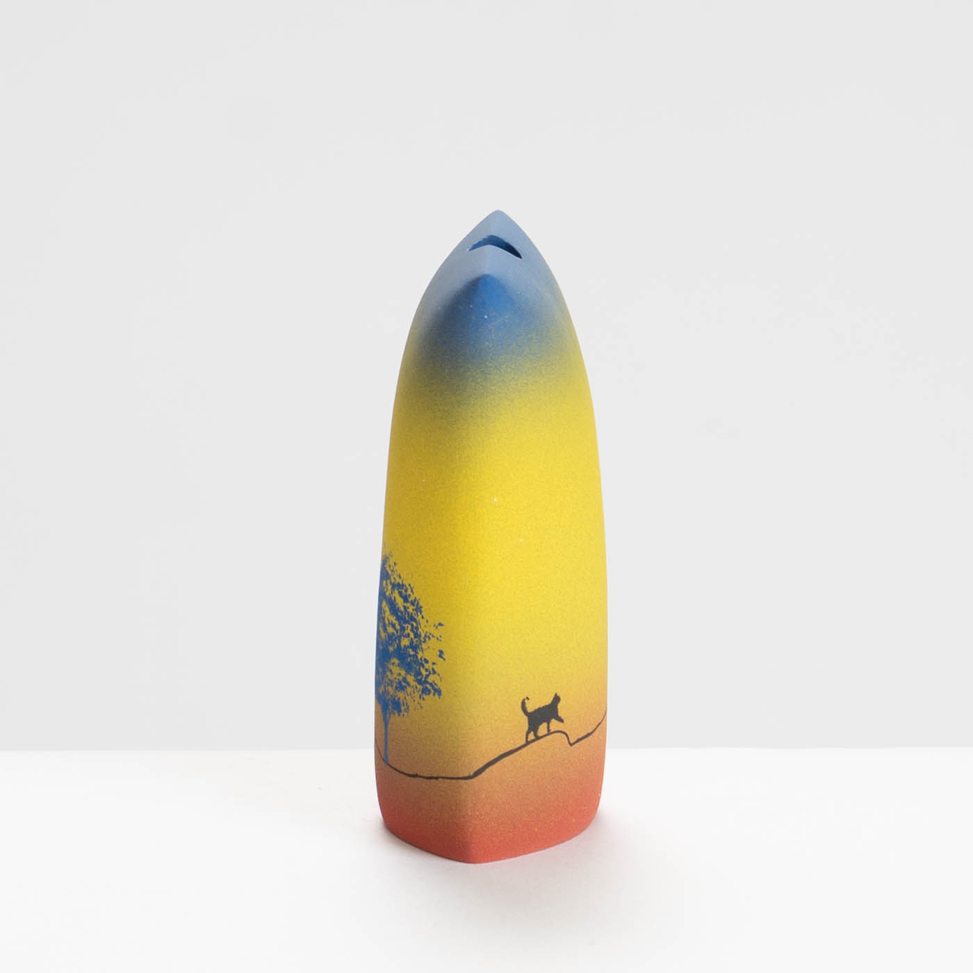 Inspired by childhood memories of home being a place of comfort, this vase is from the series called ‘The Way Home’ and is slip cast in porcelain. It is decorated with handmade ceramic transfers and brushable glazes, with marks, brush painted and scratched colours. These rich and varied emblems suggest the multi-layered nature of memory.