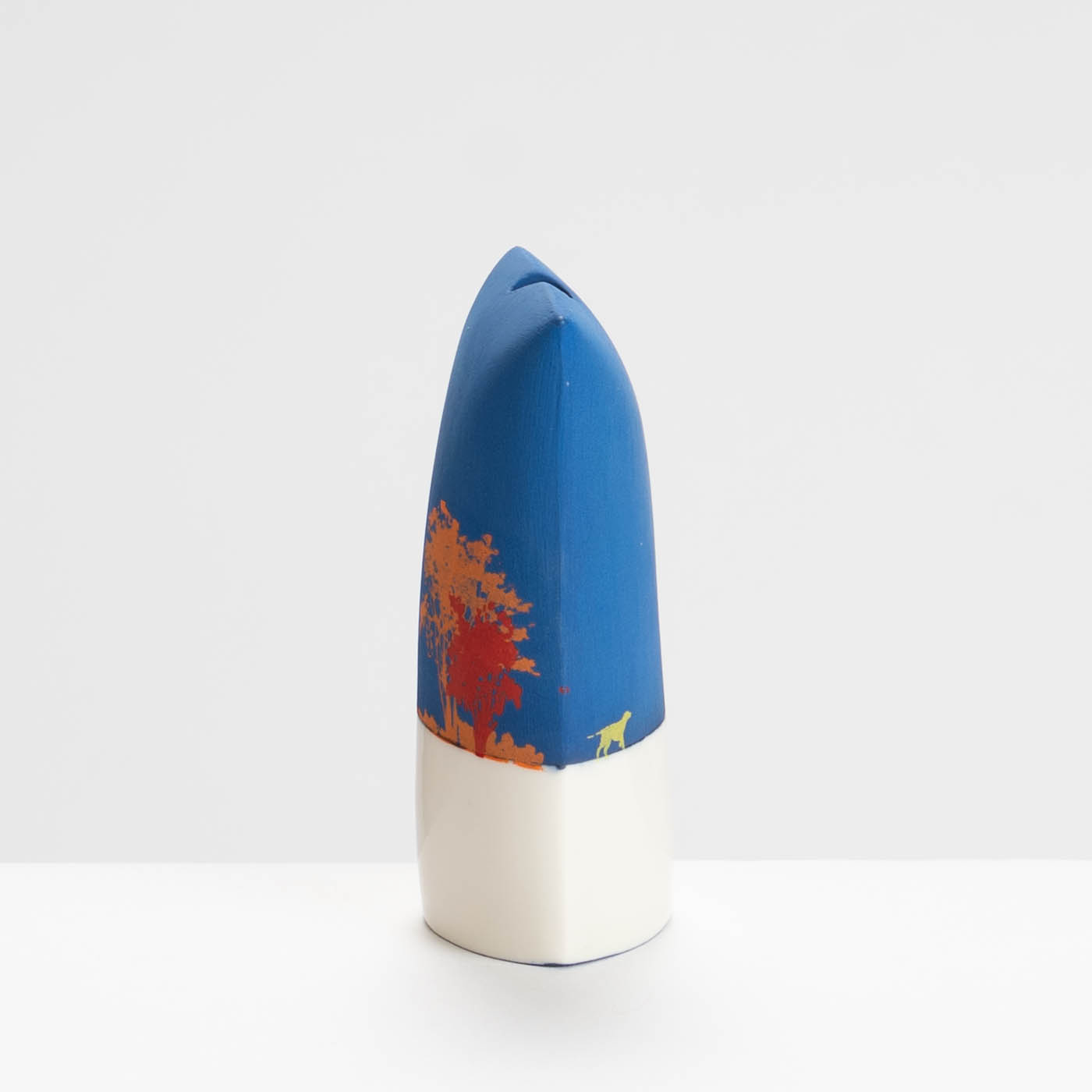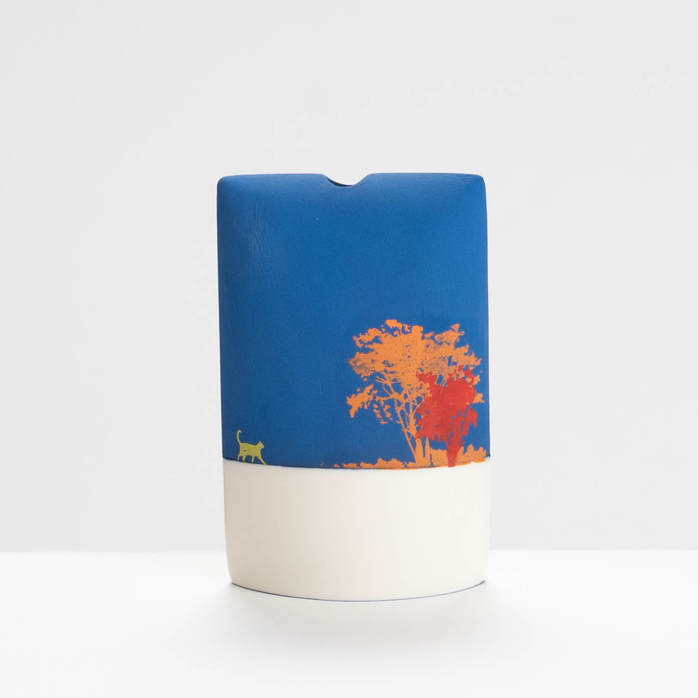 Inspired by childhood memories of home being a place of comfort, this vase is from the series called ‘The Way Home’ and is slip cast in porcelain. It is decorated with handmade ceramic transfers and brushable glazes, with marks, brush painted and scratched colours. These rich and varied emblems suggest the multi-layered nature of memory.