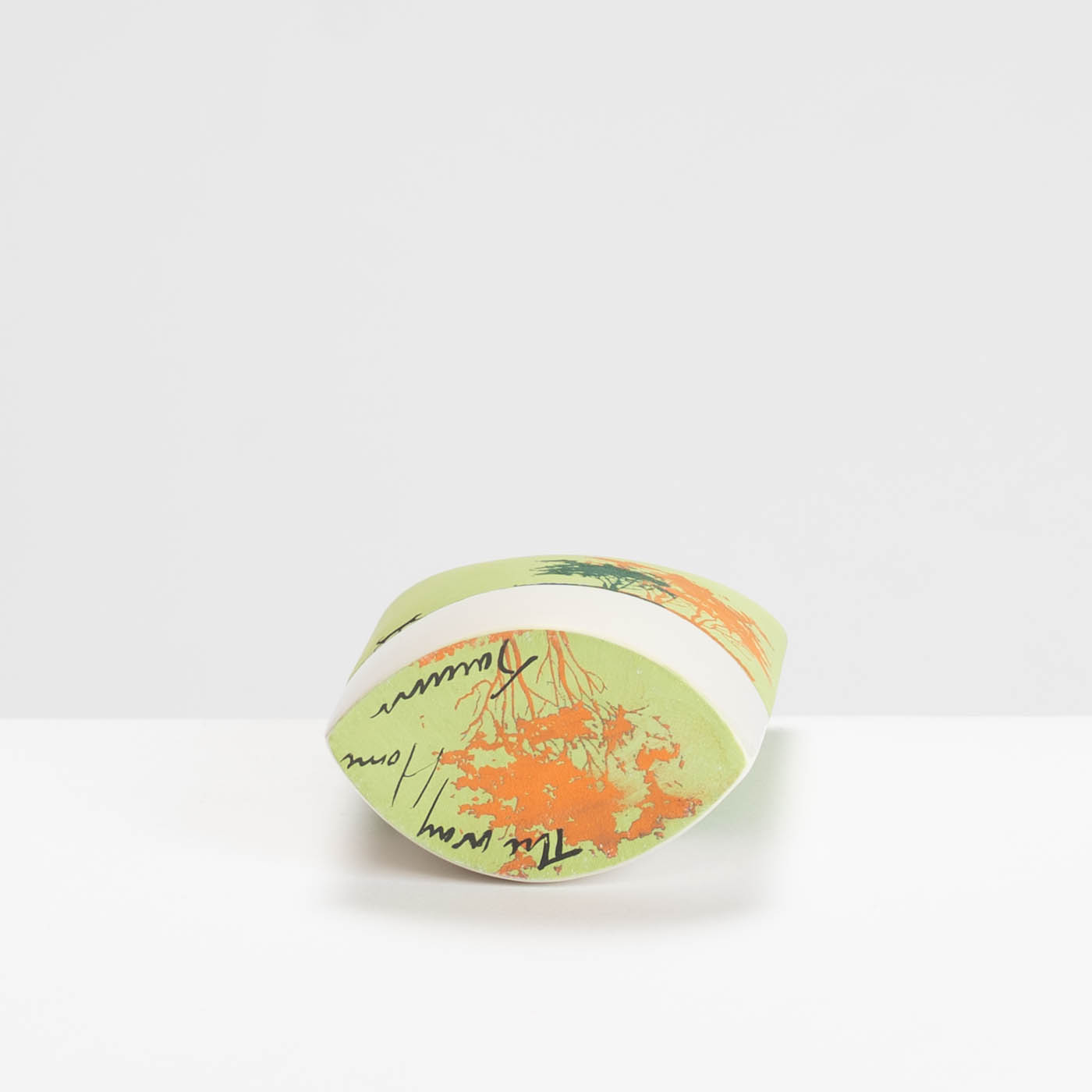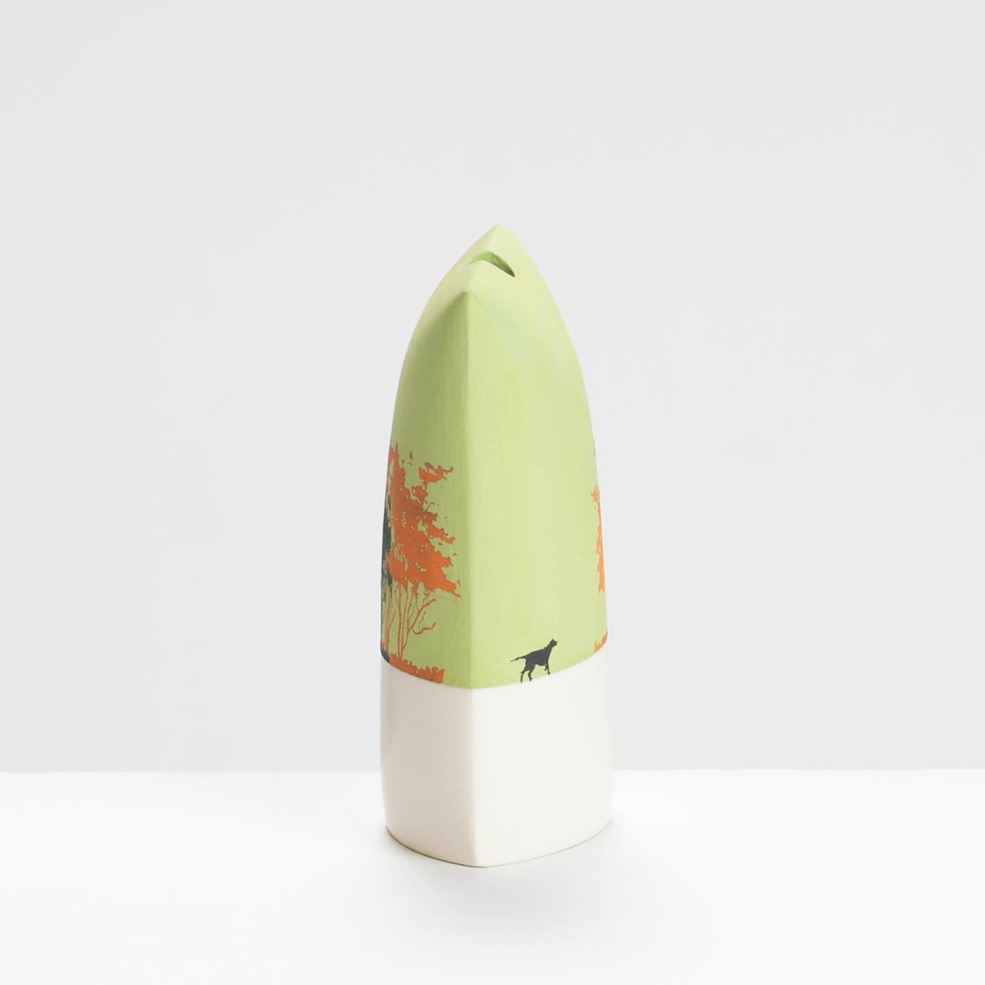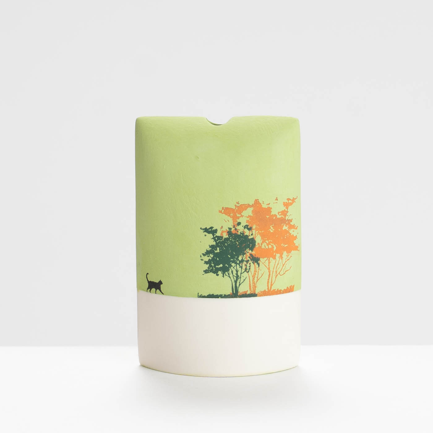 Inspired by childhood memories of home being a place of comfort, this vase is from the series called ‘The Way Home’ and is slip cast in porcelain. It is decorated with handmade ceramic transfers and brushable glazes, with marks, brush painted and scratched colours. These rich and varied emblems suggest the multi-layered nature of memory.