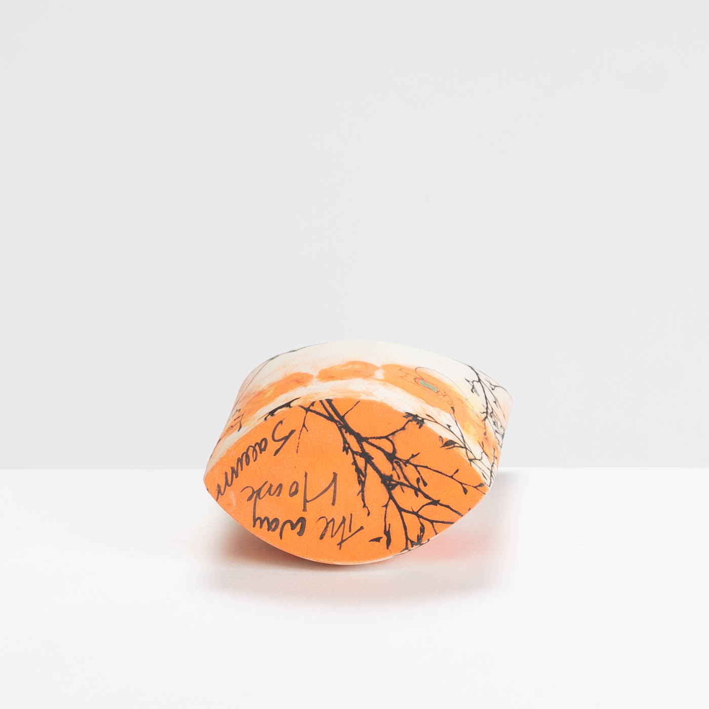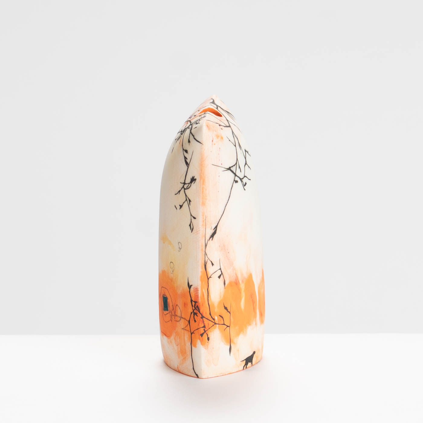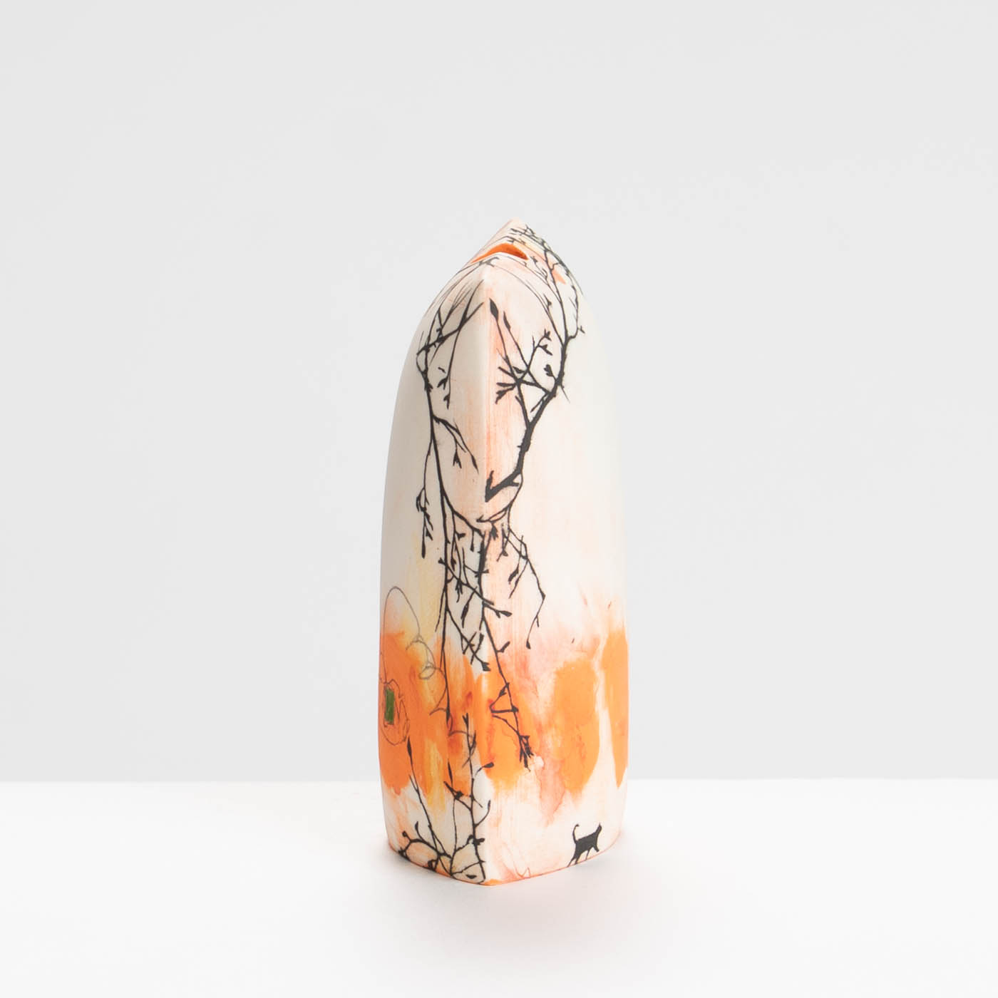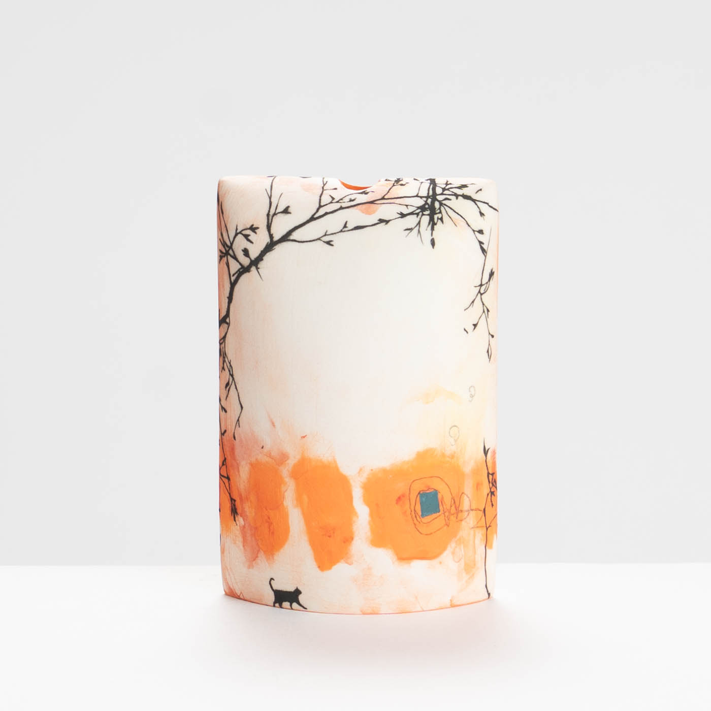 Inspired by childhood memories of home being a place of comfort, this vase is from the series called ‘The Way Home’ and is slip cast in porcelain. It is decorated with handmade ceramic transfers and brushable glazes, with marks, brush painted and scratched colours. These rich and varied emblems suggest the multi-layered nature of memory.