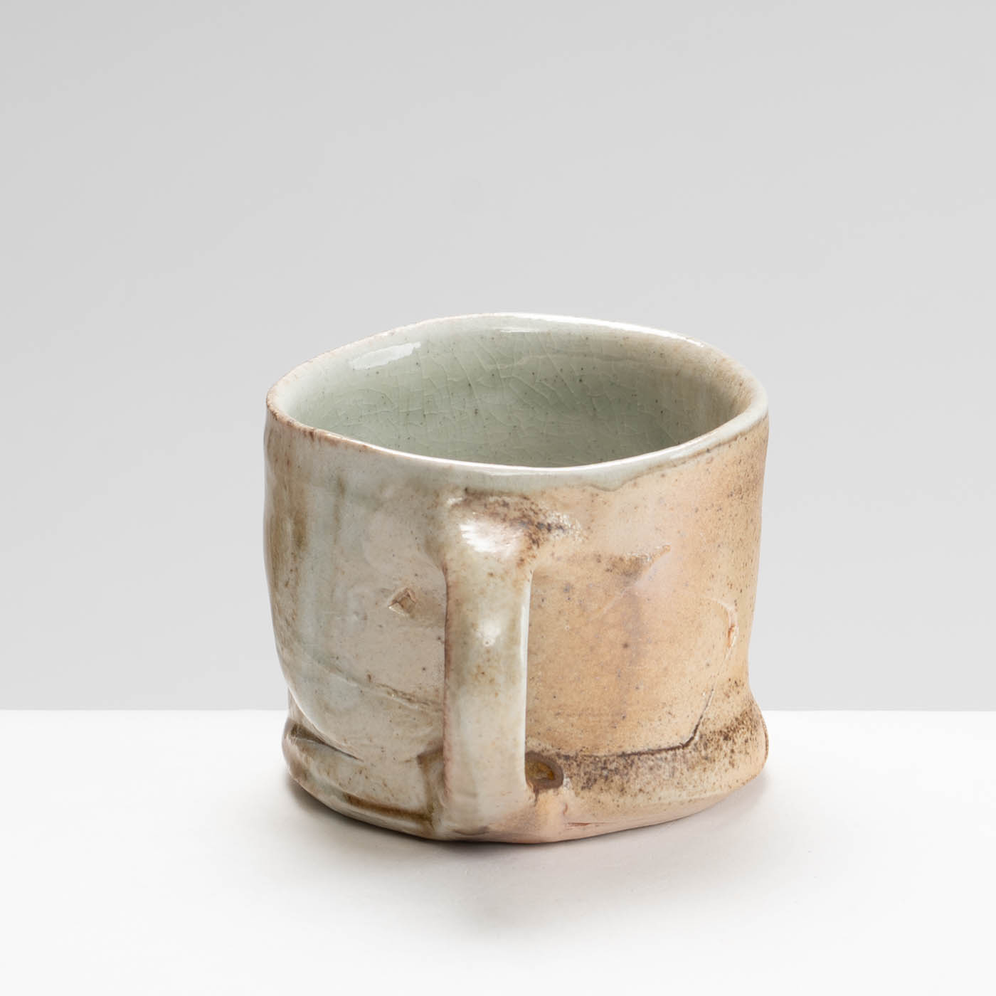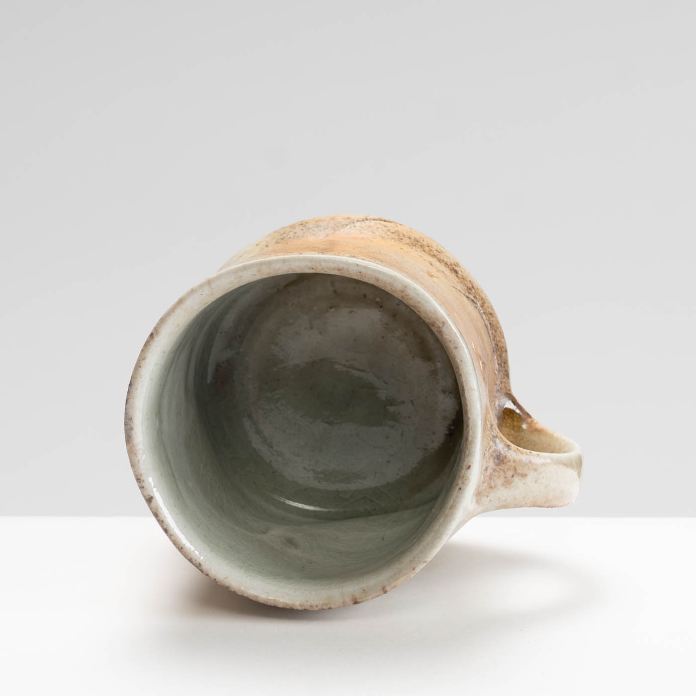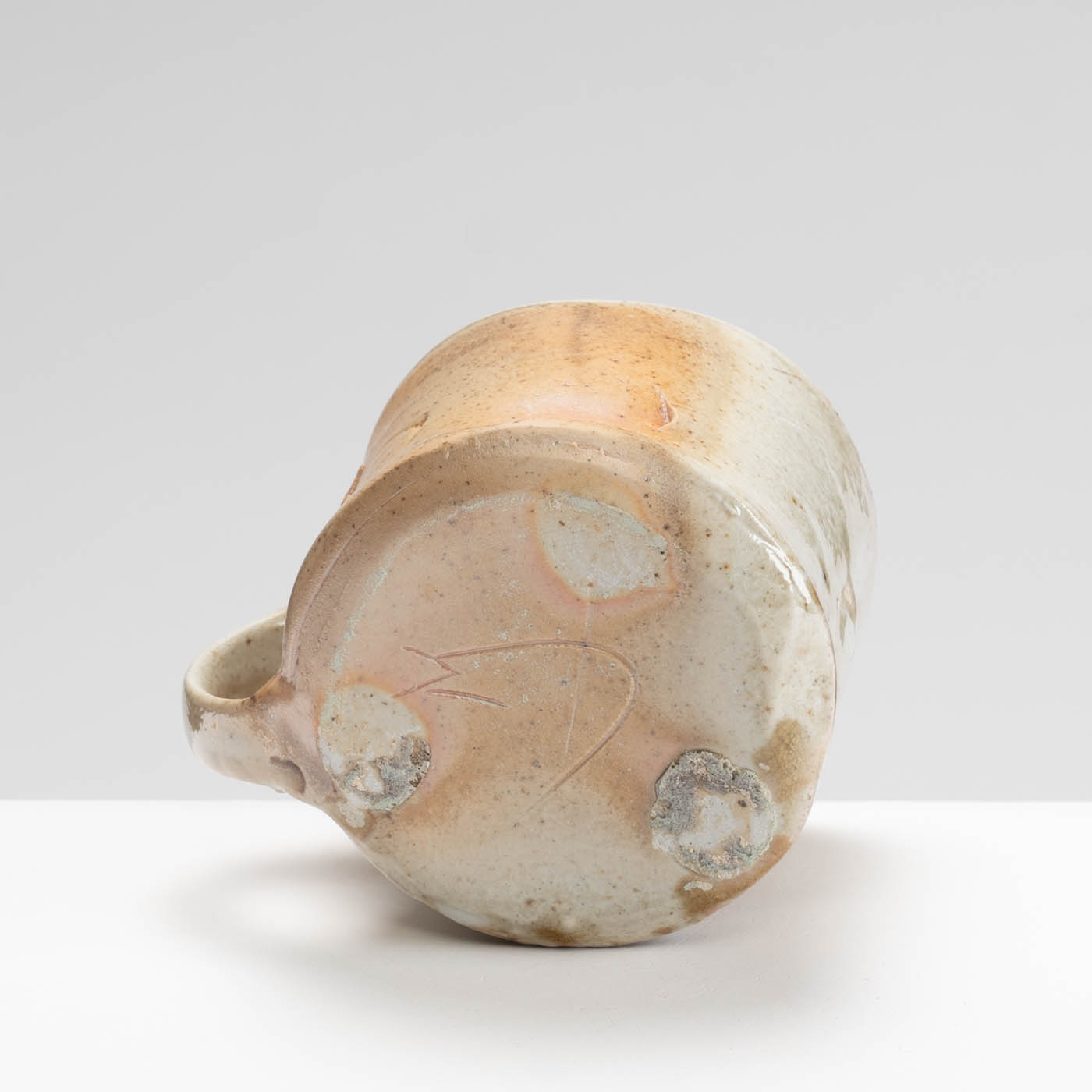 This wood-fired mug is wheel-thrown in a porcelain clay body. John develops his own clays, glazes and slips which respond to the flame, ember, ash, and soda. His work emanates the richness and energy of the elements and the experimentation with kiln atmosphere.