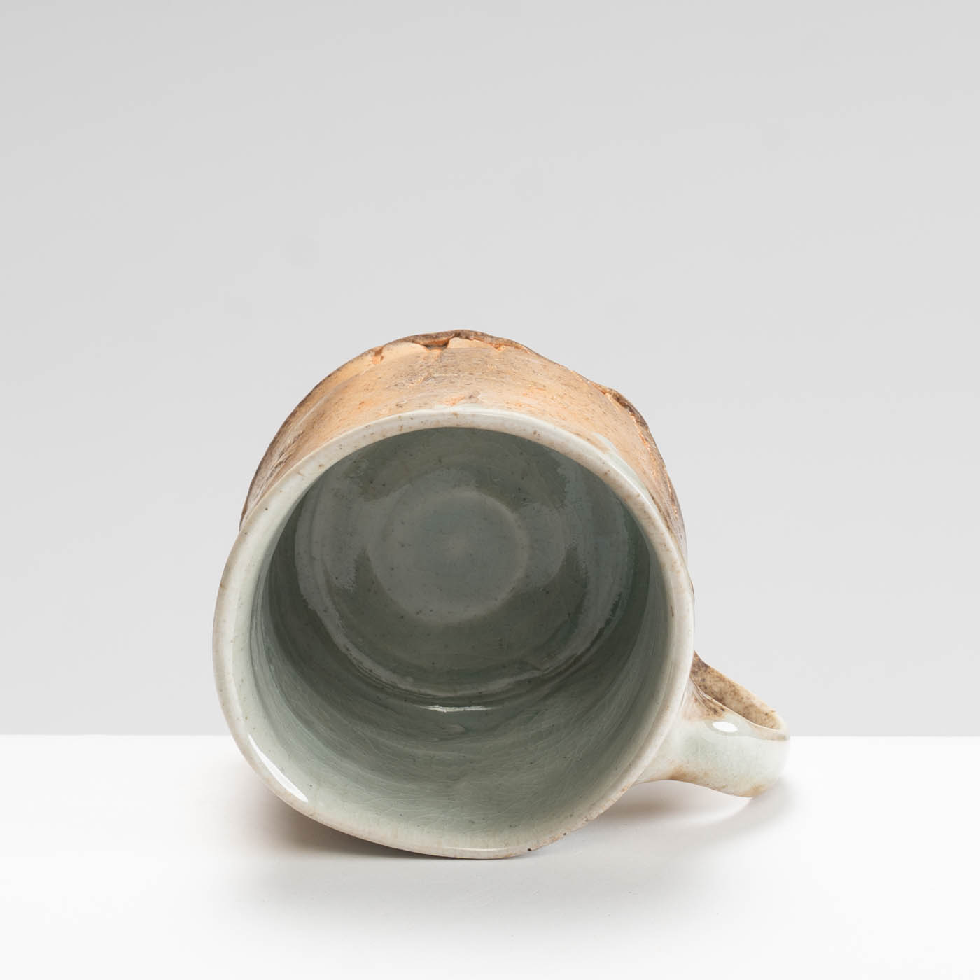 This wood-fired mug is wheel-thrown in a porcelain clay body. John develops his own clays, glazes and slips which respond to the flame, ember, ash, and soda. His work emanates the richness and energy of the elements and the experimentation with kiln atmosphere.