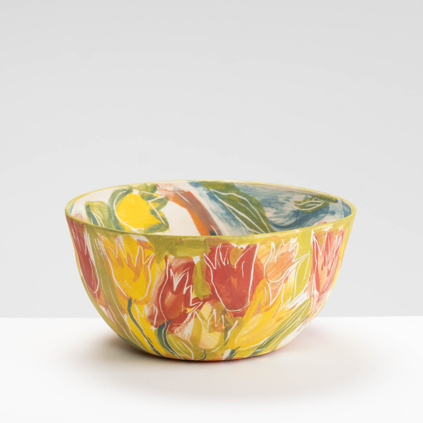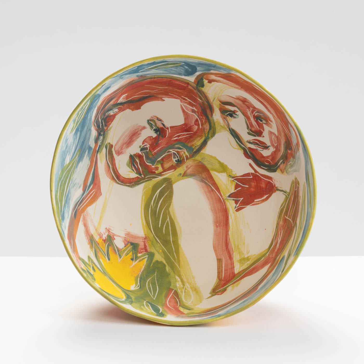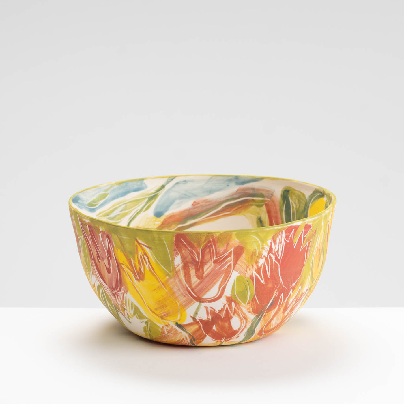 This porcelain bowl is hand-built with an expressive design on the whole surface. It is freely painted with slips, oxides and stains and decorated with sgraffito.
