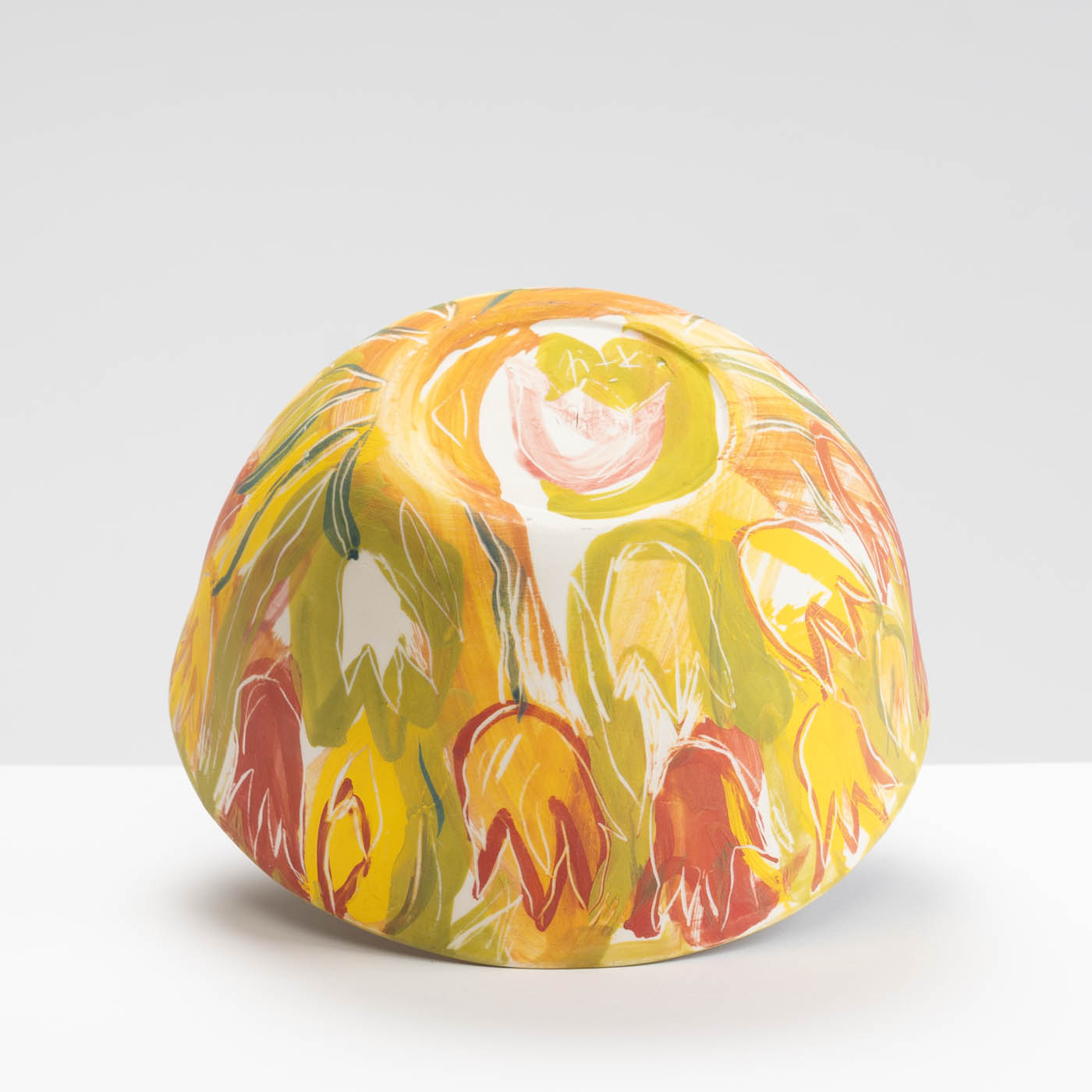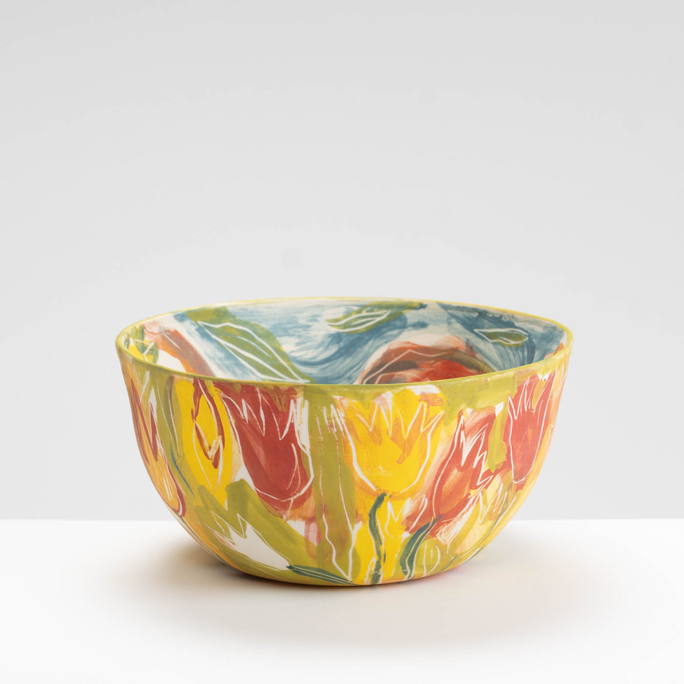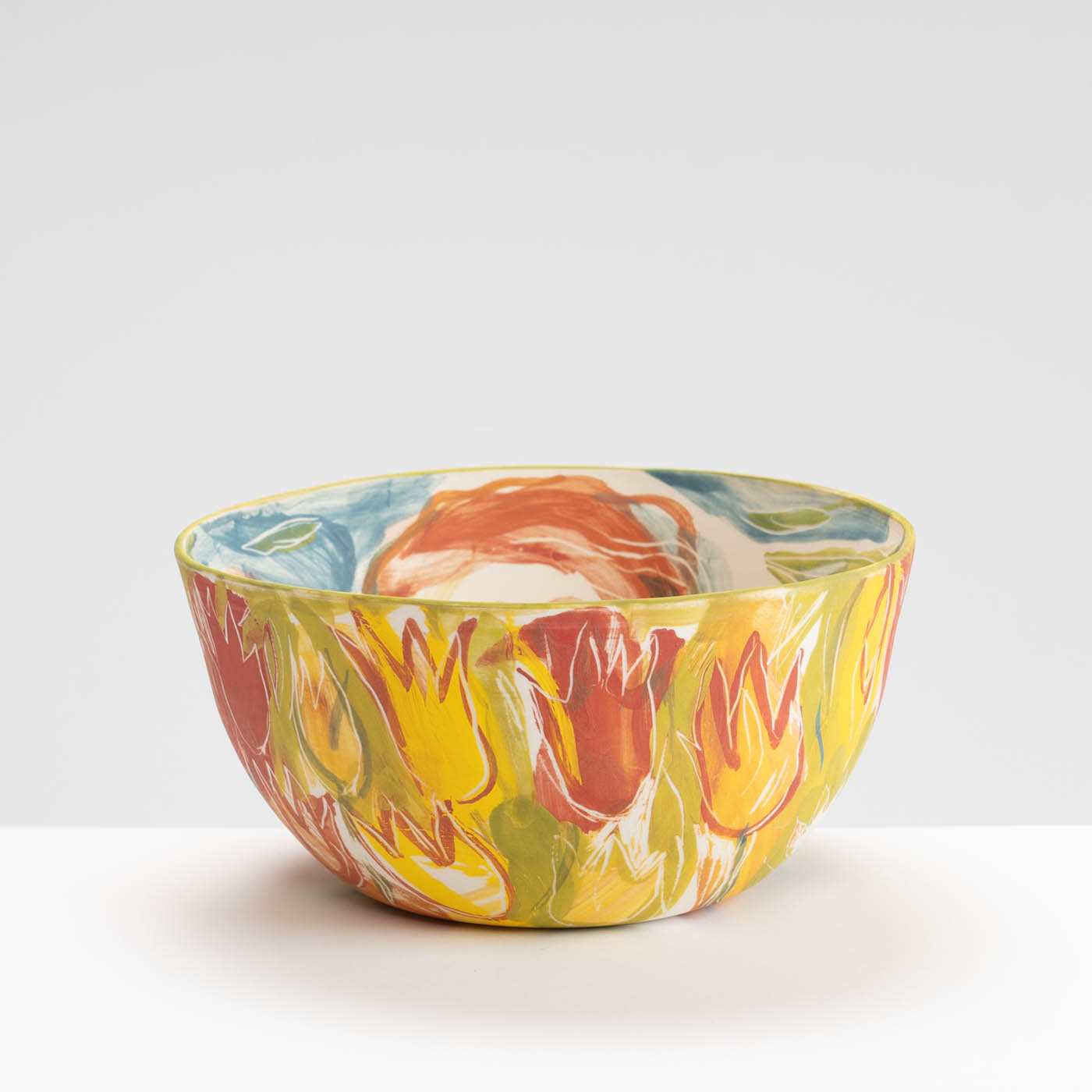 This porcelain bowl is hand-built with an expressive design on the whole surface. It is freely painted with slips, oxides and stains and decorated with sgraffito.