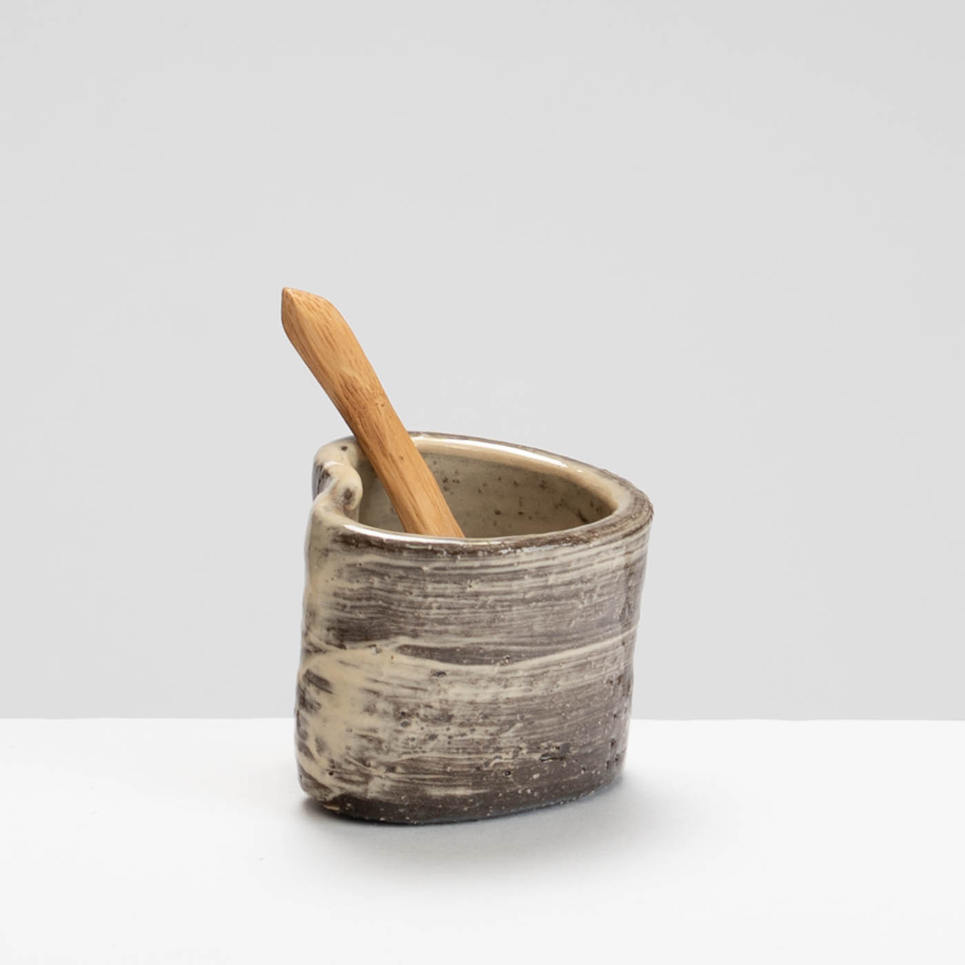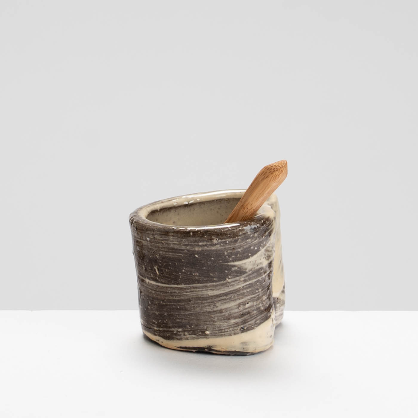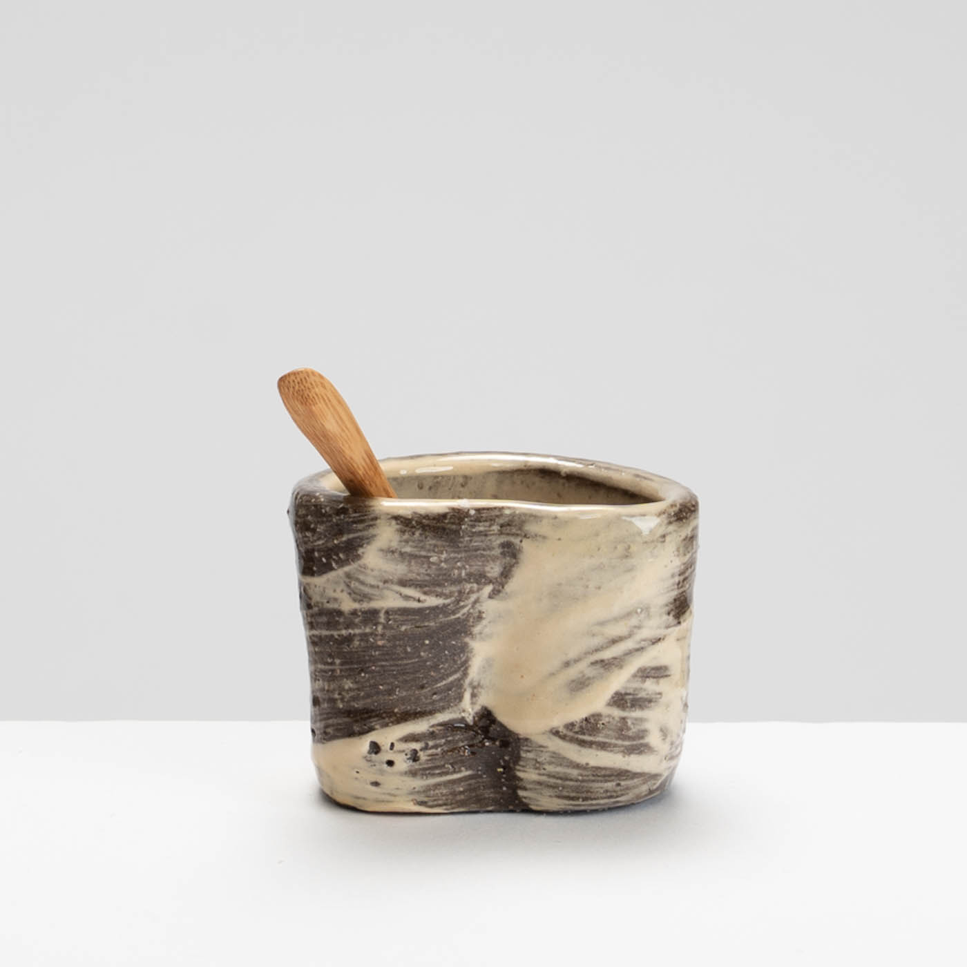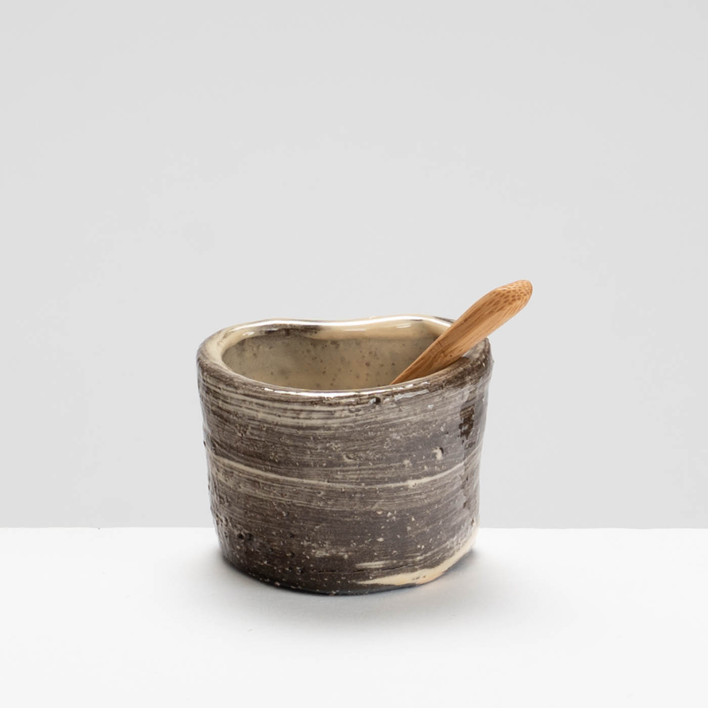 This delightful earthenware salt pot is wheel-thrown and altered and painted with slip. It comes with a wooden spoon.