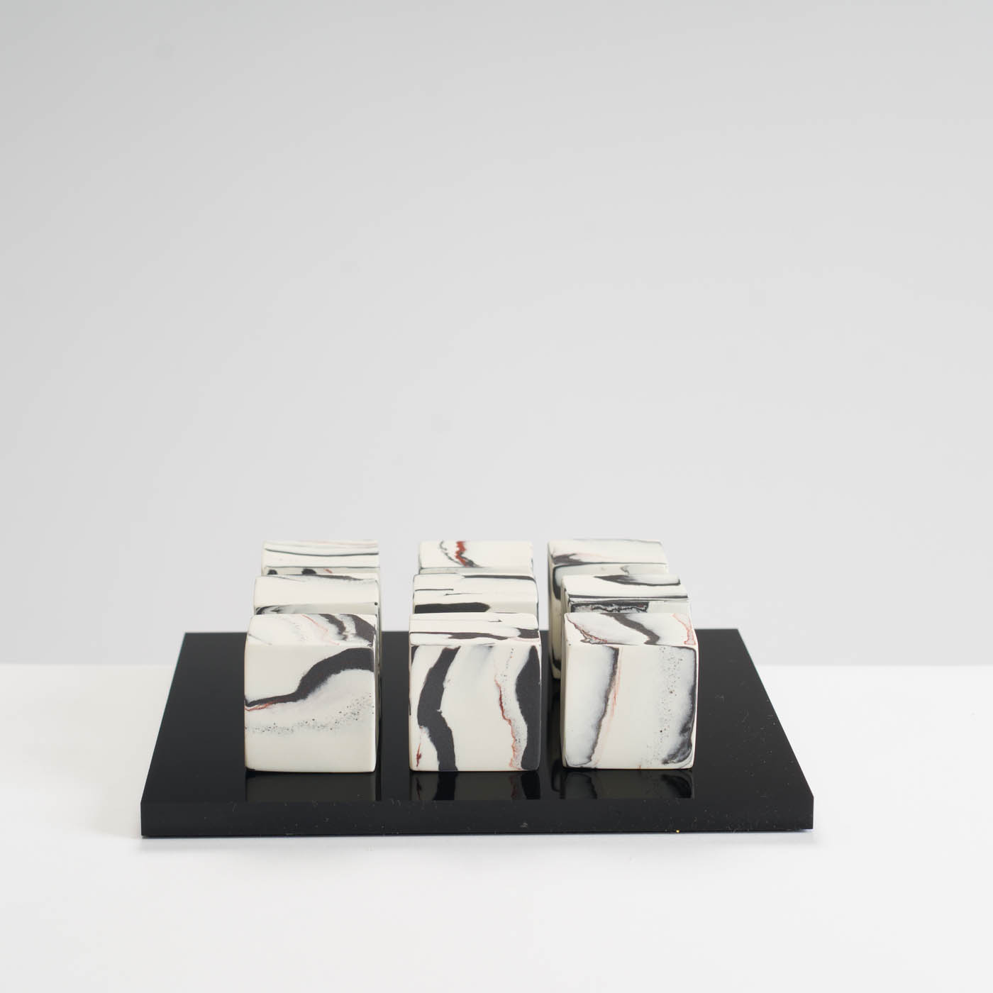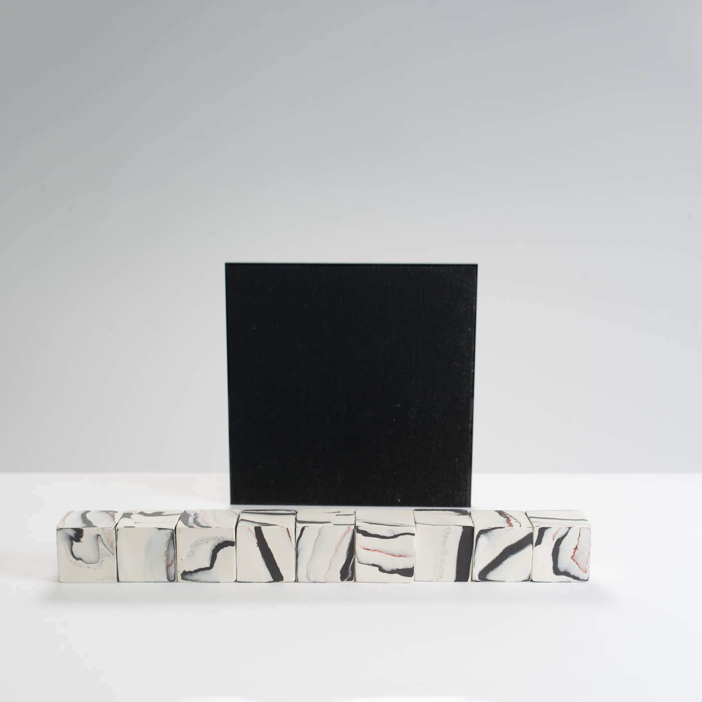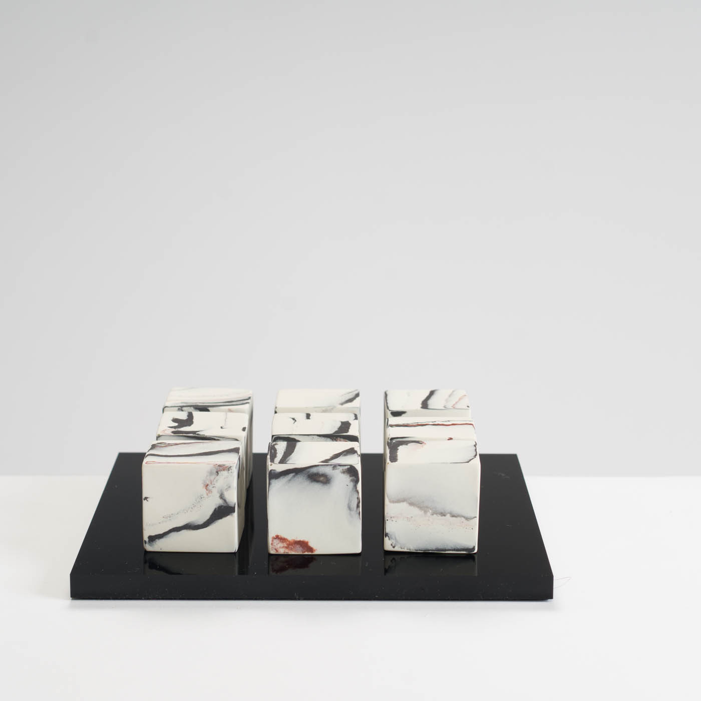 Inspired by geology, particularly of the South Wales coalfields, this set consists of nine hand-built cubes, and a black perspex plinth. Materials used include: porcelain, black onyx porcelain, and iron spangles.