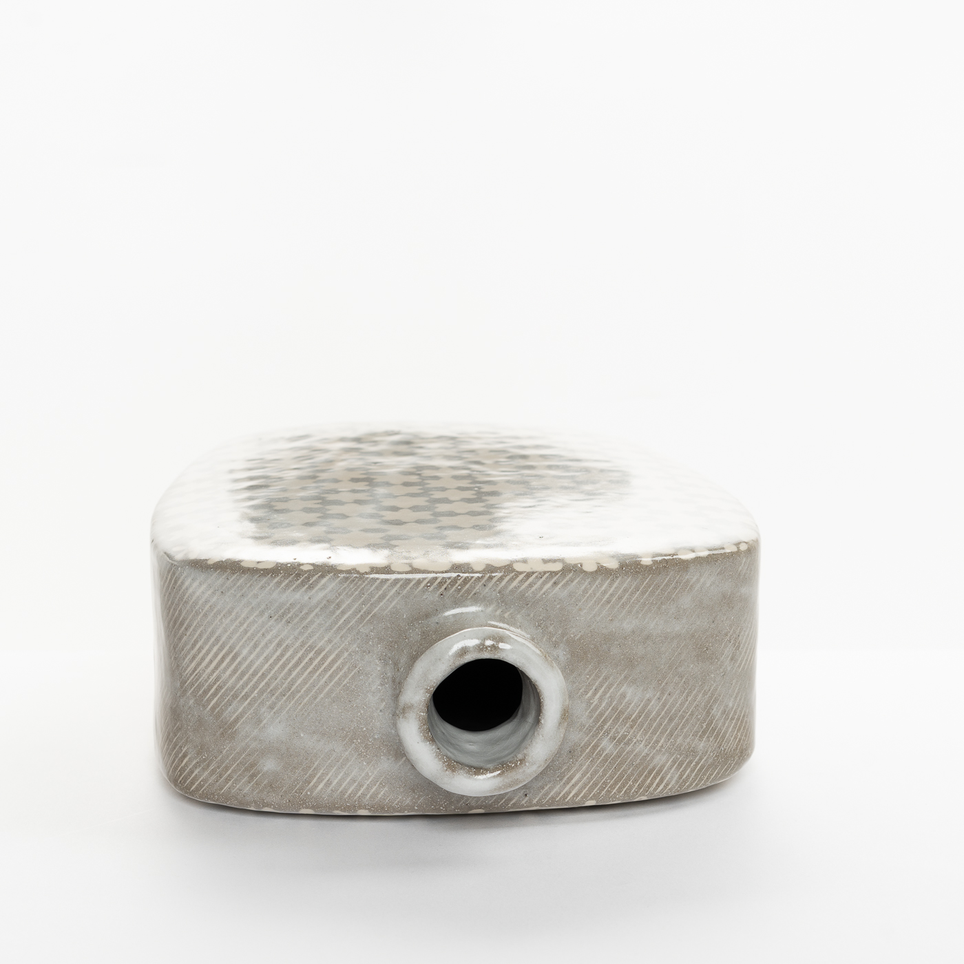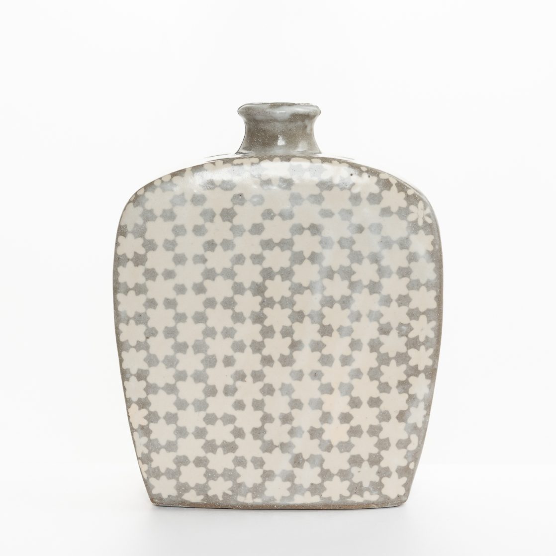 This wood-fired bottle is a fusion of traditional Korean techniques using inlaid white slip and a dark clay with patterns influenced by those of William Morris.
