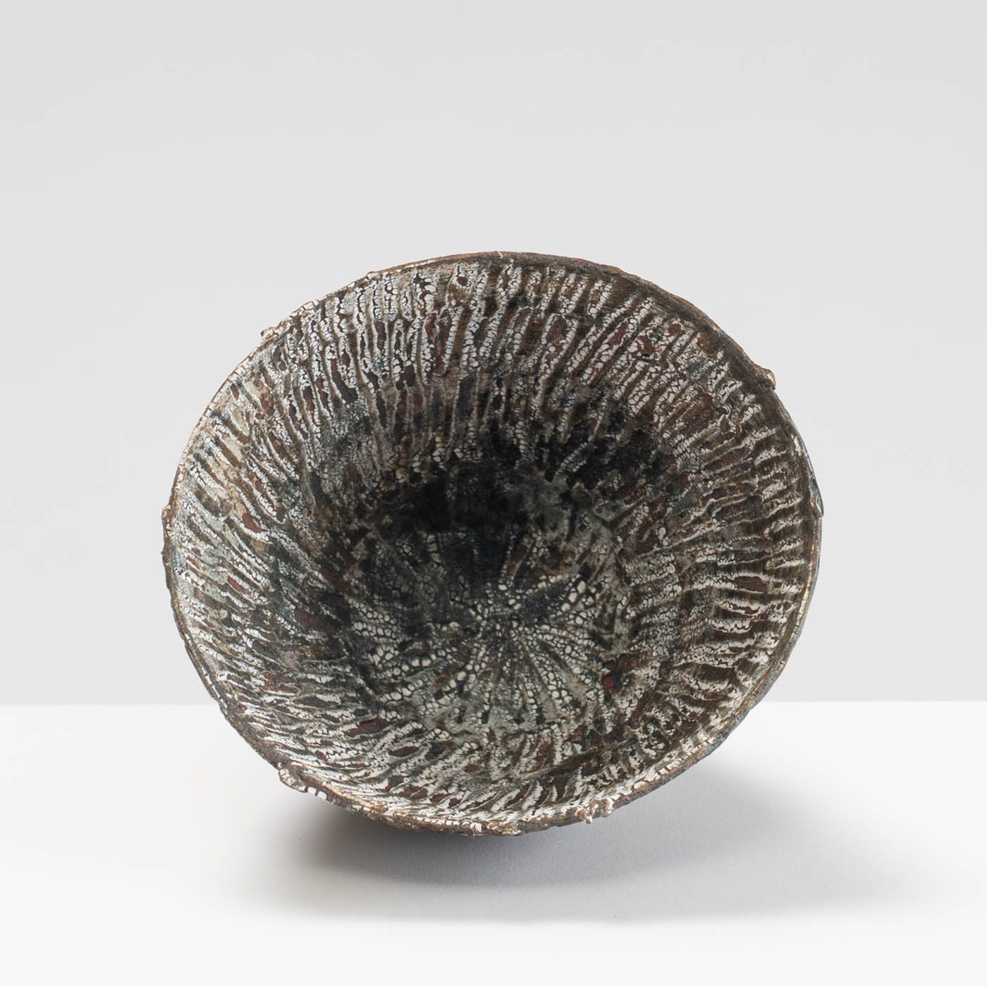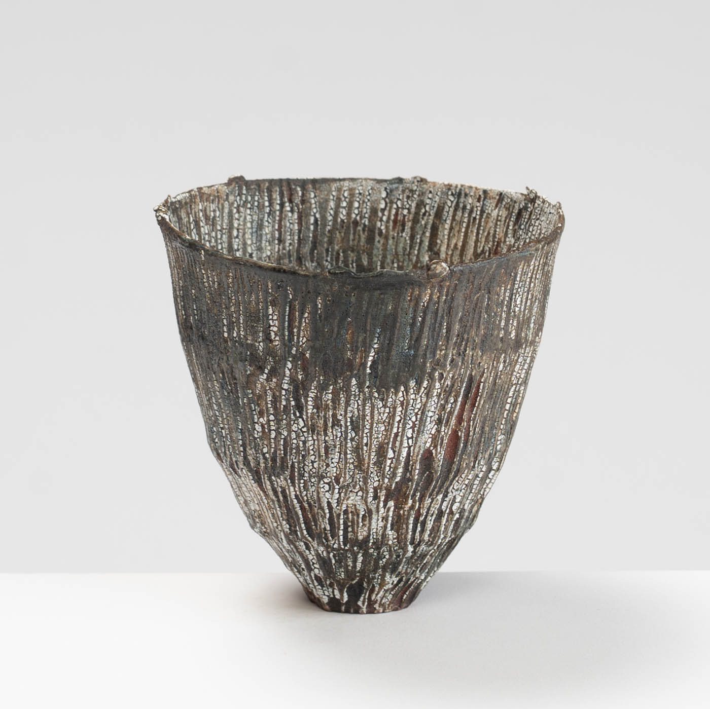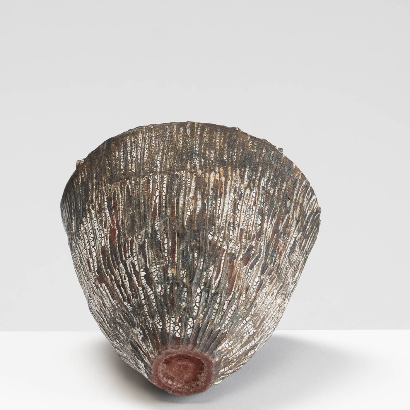 Wheel-thrown and hand-carved from red stoneware clay, this vessel features a textured surface inspired by the rugged landscape of Norway. Layers of slips and glazes create depth and subtle tonal variation.