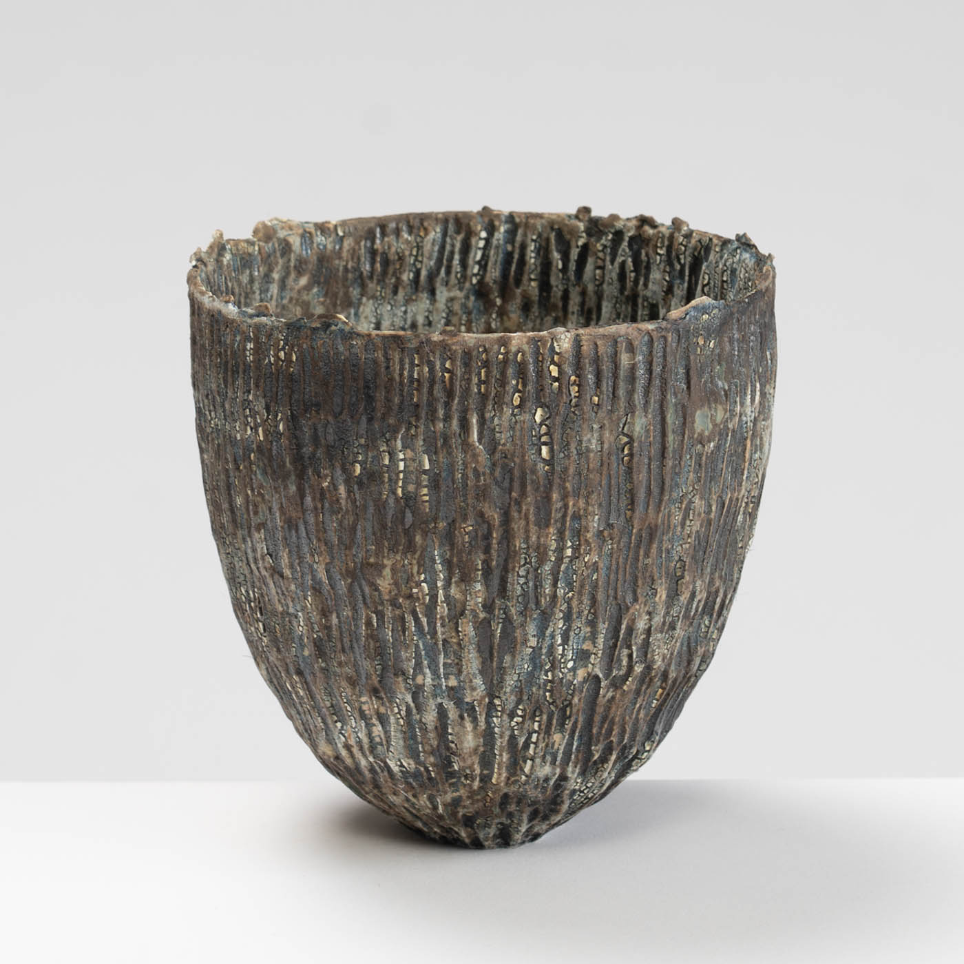 Wheel-thrown and hand-carved from white stoneware clay, this vessel features a textured surface inspired by the rugged landscape of Norway. Layers of slips and glazes create depth and subtle tonal variation.