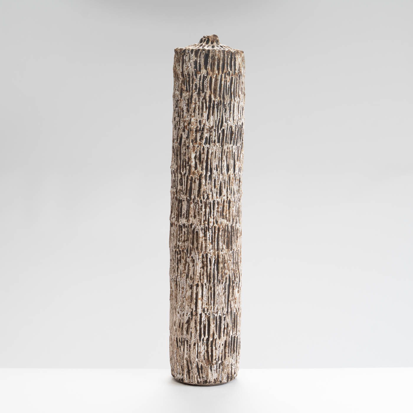Wheel-thrown and hand-carved from black stoneware clay, this bottle form features a textured surface inspired by the rugged landscape of Norway. Layers of slips and glazes create depth and subtle tonal variation.