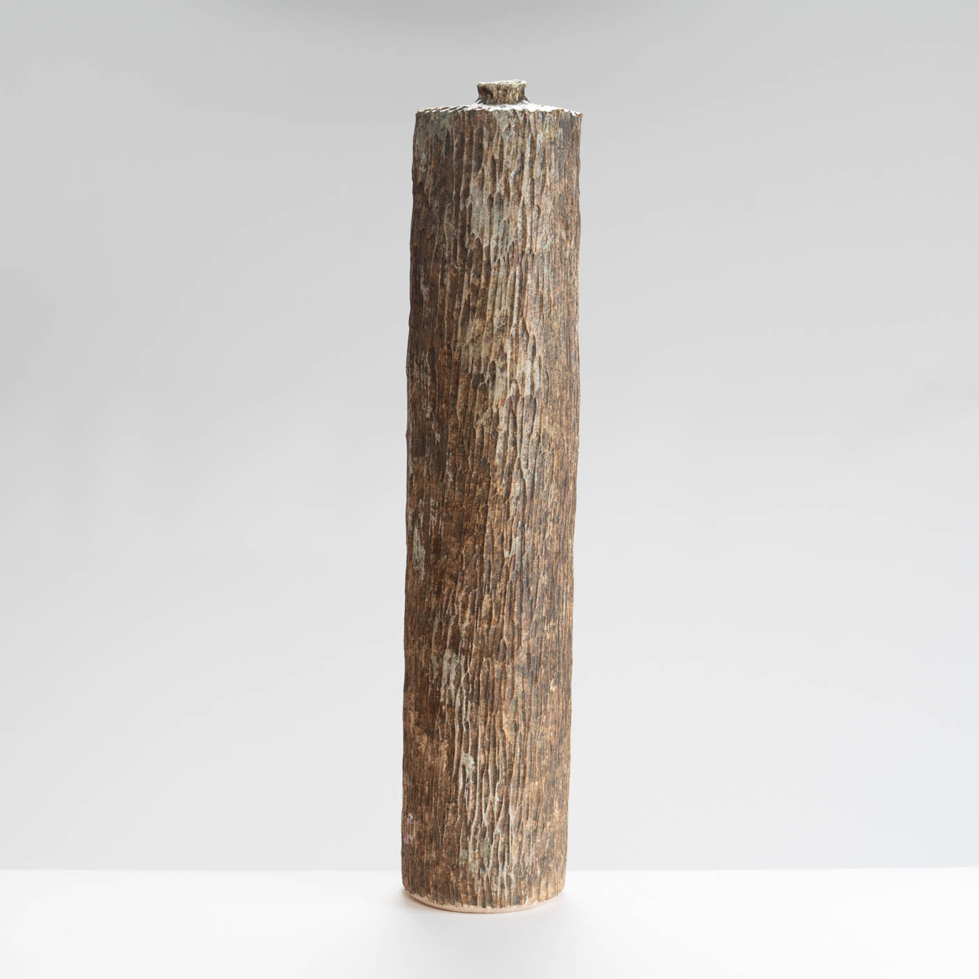 Wheel-thrown and hand-carved from white stoneware clay, this bottle form features a textured surface inspired by the rugged landscape of Norway. Layers of slips and glazes create depth and subtle tonal variation.