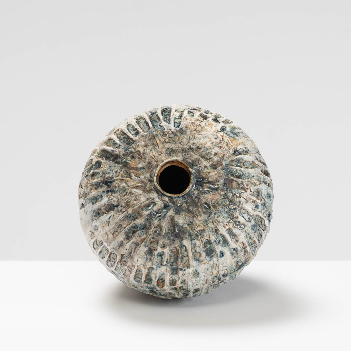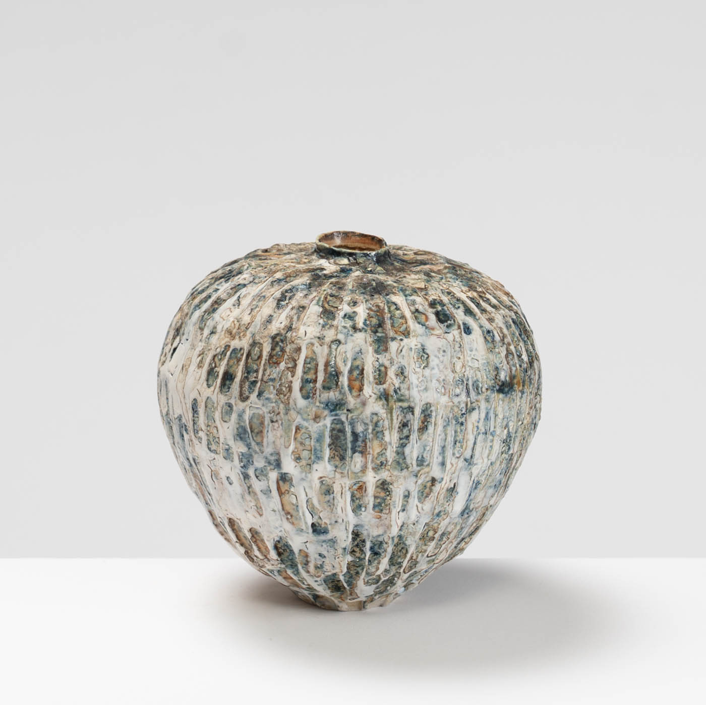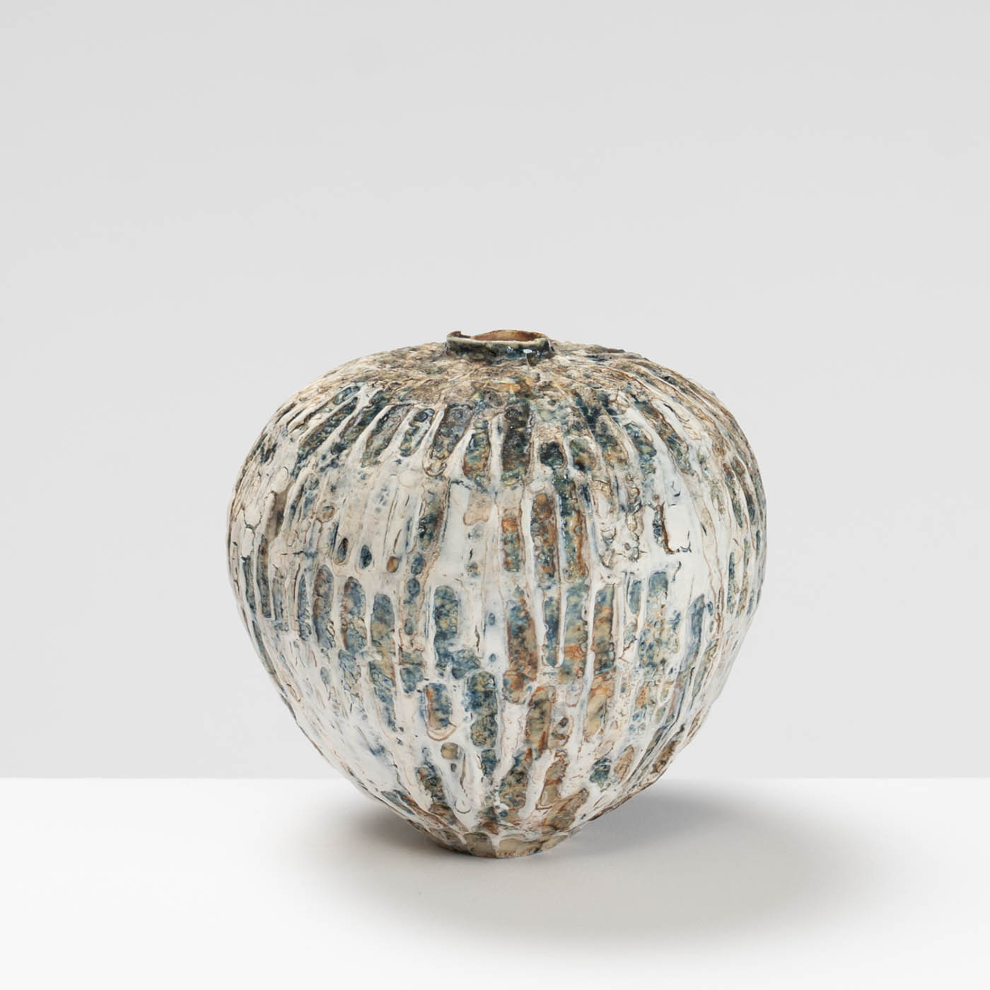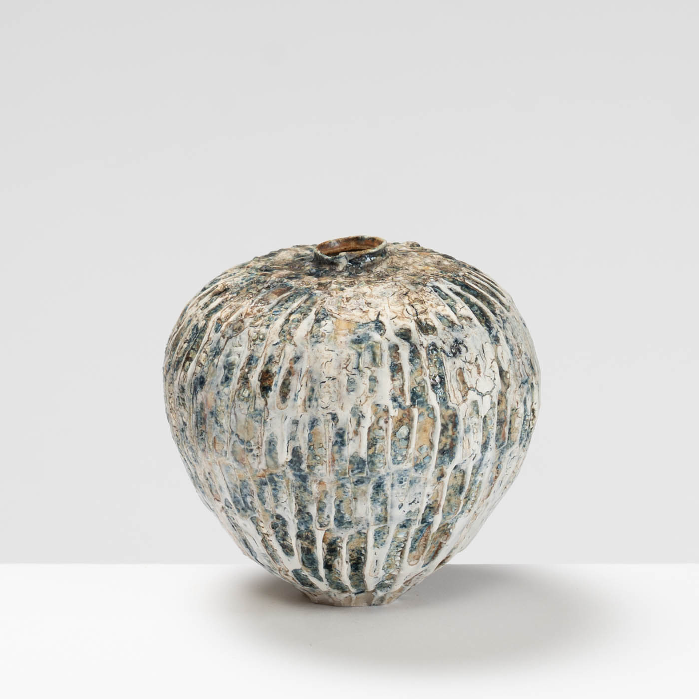 Wheel-thrown and hand-carved from white stoneware clay, this vase features a textured surface inspired by the rugged landscape of Norway. Layers of slips and glazes, refined through repeated firings, create depth and subtle tonal variation.