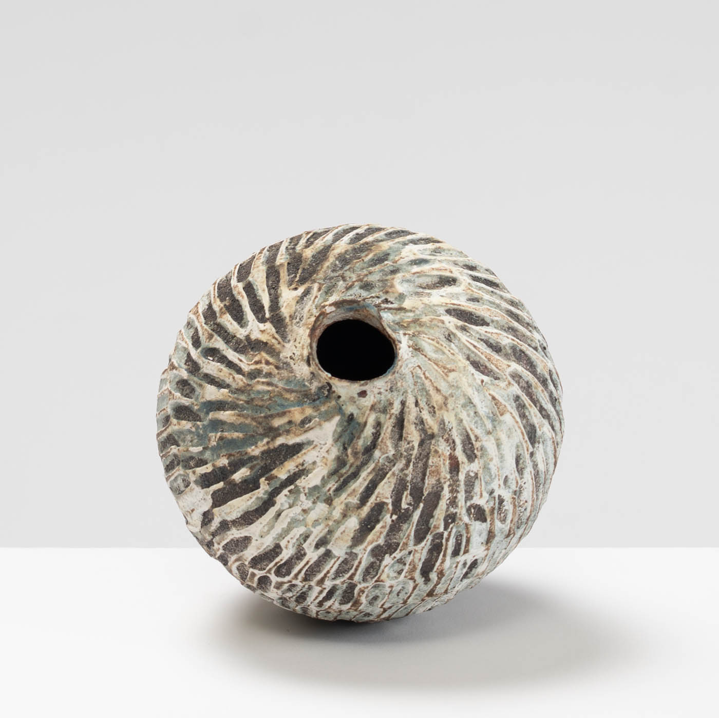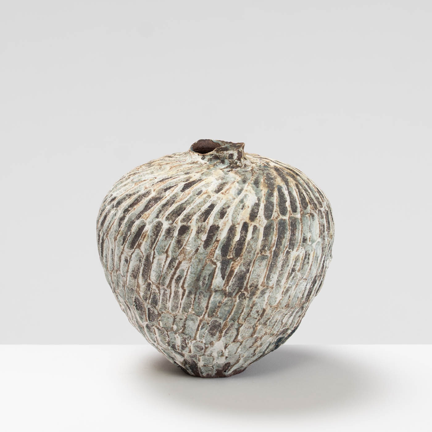 Wheel-thrown and hand-carved from red stoneware clay, this vase features a textured surface inspired by the rugged landscape of Norway. Layers of slips and glazes create depth and subtle tonal variation.