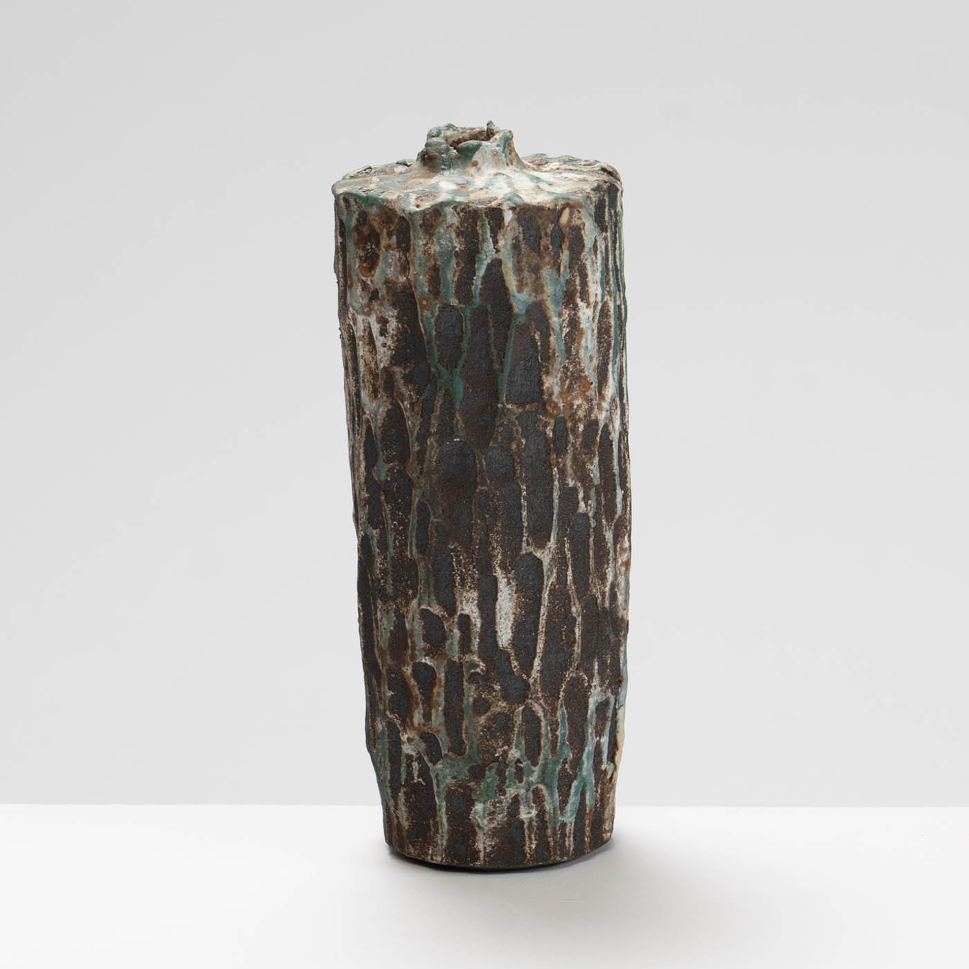 Wheel-thrown and hand-carved from black stoneware clay, this bottle form features a textured surface inspired by the rugged landscape of Norway. Layers of slips and glazes create depth and subtle tonal variation.