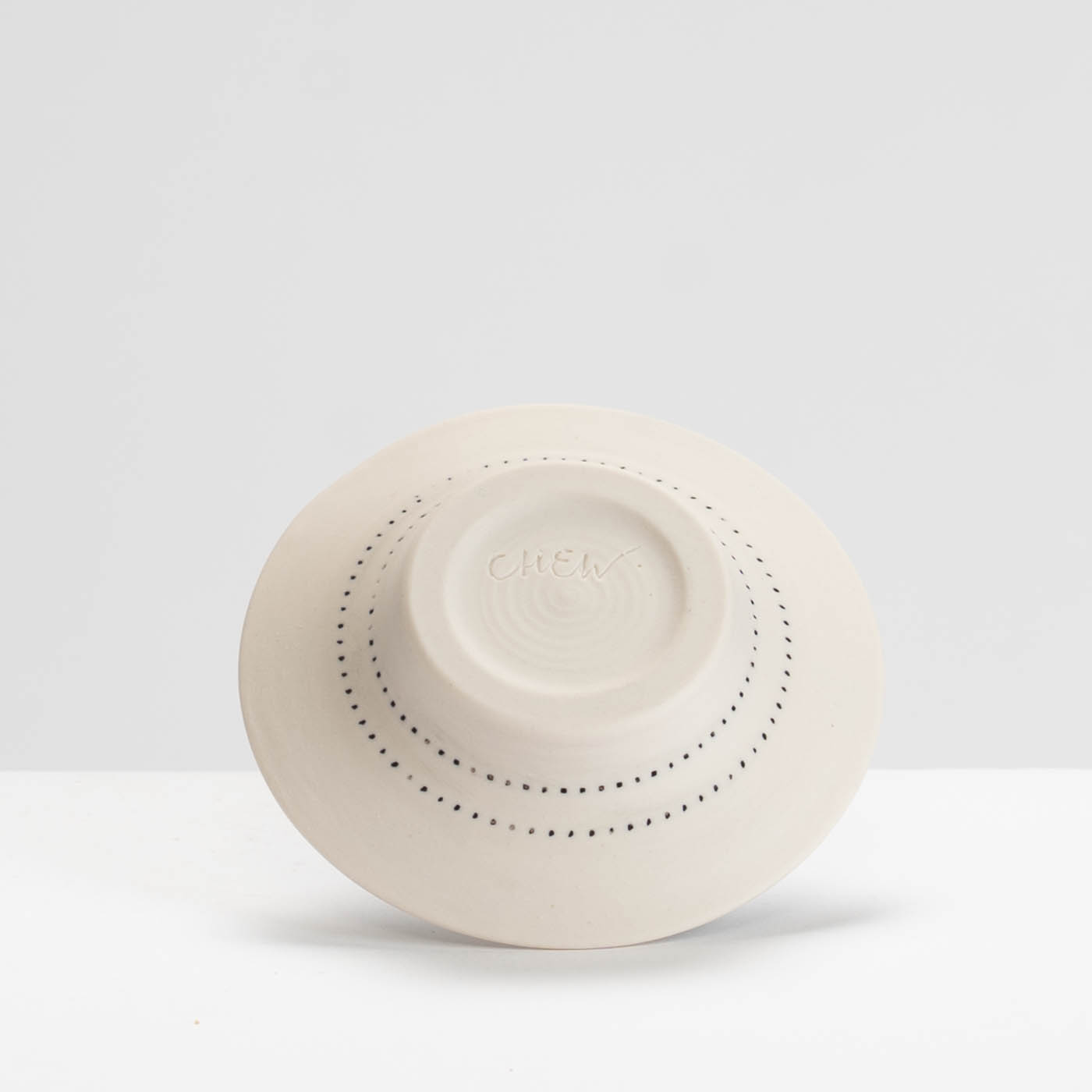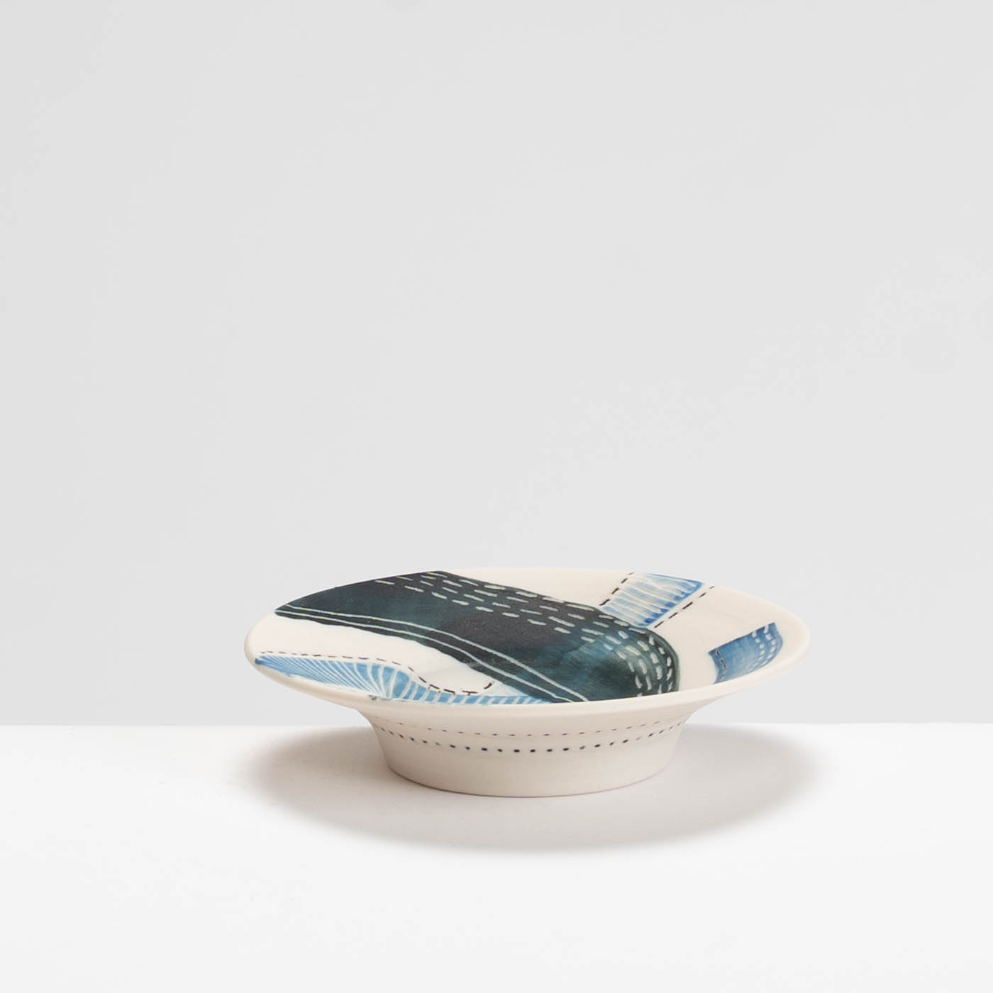 This dish is wheel thrown in porcelain. It is decorated with a variety of resist techniques, sgraffito and marks are drawn through oxides and underglaze colours.