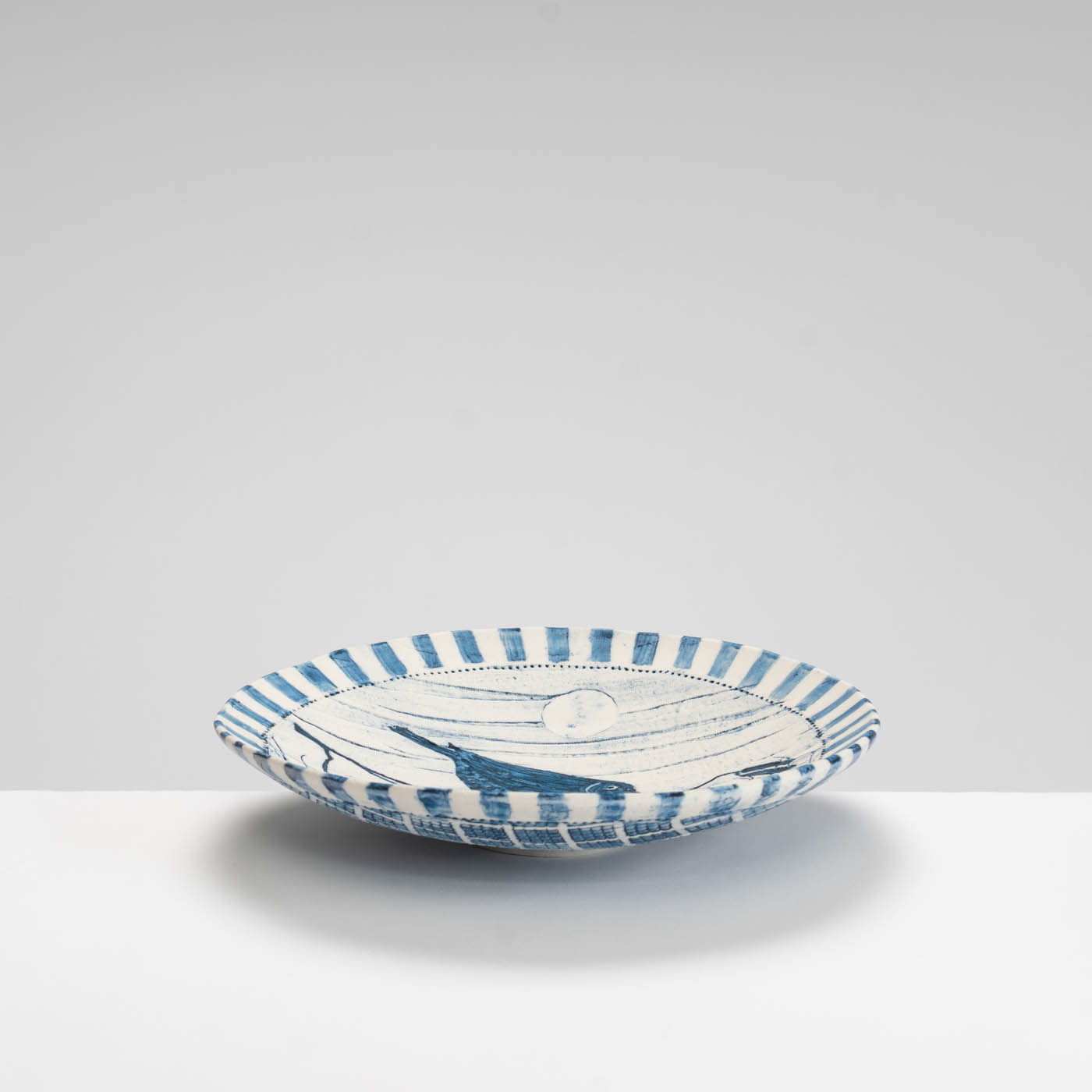 This dish is constructed from soft slabs of porcelain. It is decorated with a variety of resist techniques, impressed textiles, sgraffito, and the design drawn through oxides and underglaze colours.